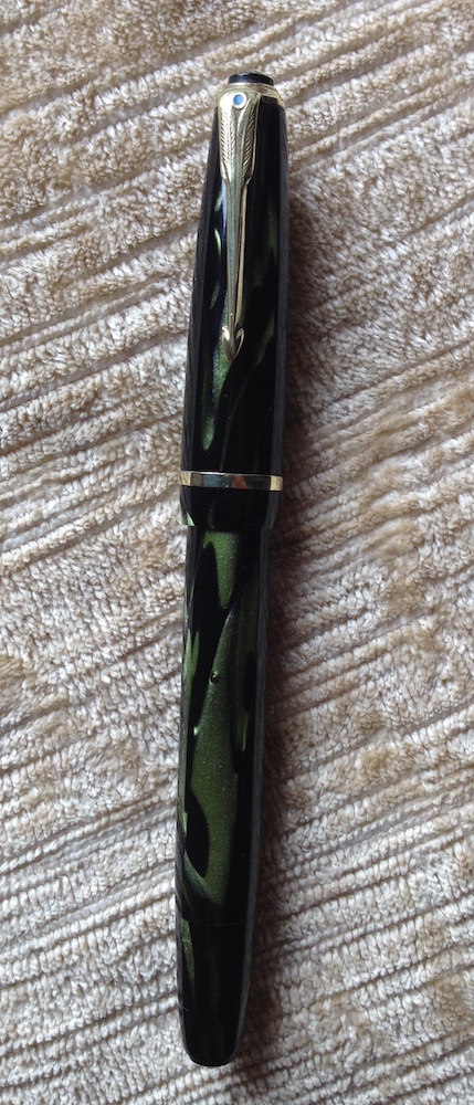 Pescata fortunosamente nella baia, questa Vereletta (fine?) anni '40 mi ha intrigato per la tigratura e per la curiosa clip sormontata da un occhio ipnotico tipo Polifemo. Lunga 13,3 cm, con fusto del diametro di 12mm, pesa 16 gr. senza inchiostro. Caricamento a bottone, pennino flessibile Vereletta extra iridium n°4 sciupato (era dorato), ma ne uno ho di riserva. Le parti metalliche spesse e dettagliate e gli apici della celluloide lavorati a punta ne fanno, a mio parere, una penna sicuramente di qualità medio-alta e non economica. Segno che la Luigi Pagliero & C. operava con più marchi nello stesso settore e che usasse tubi di celluloide e non lastrine.