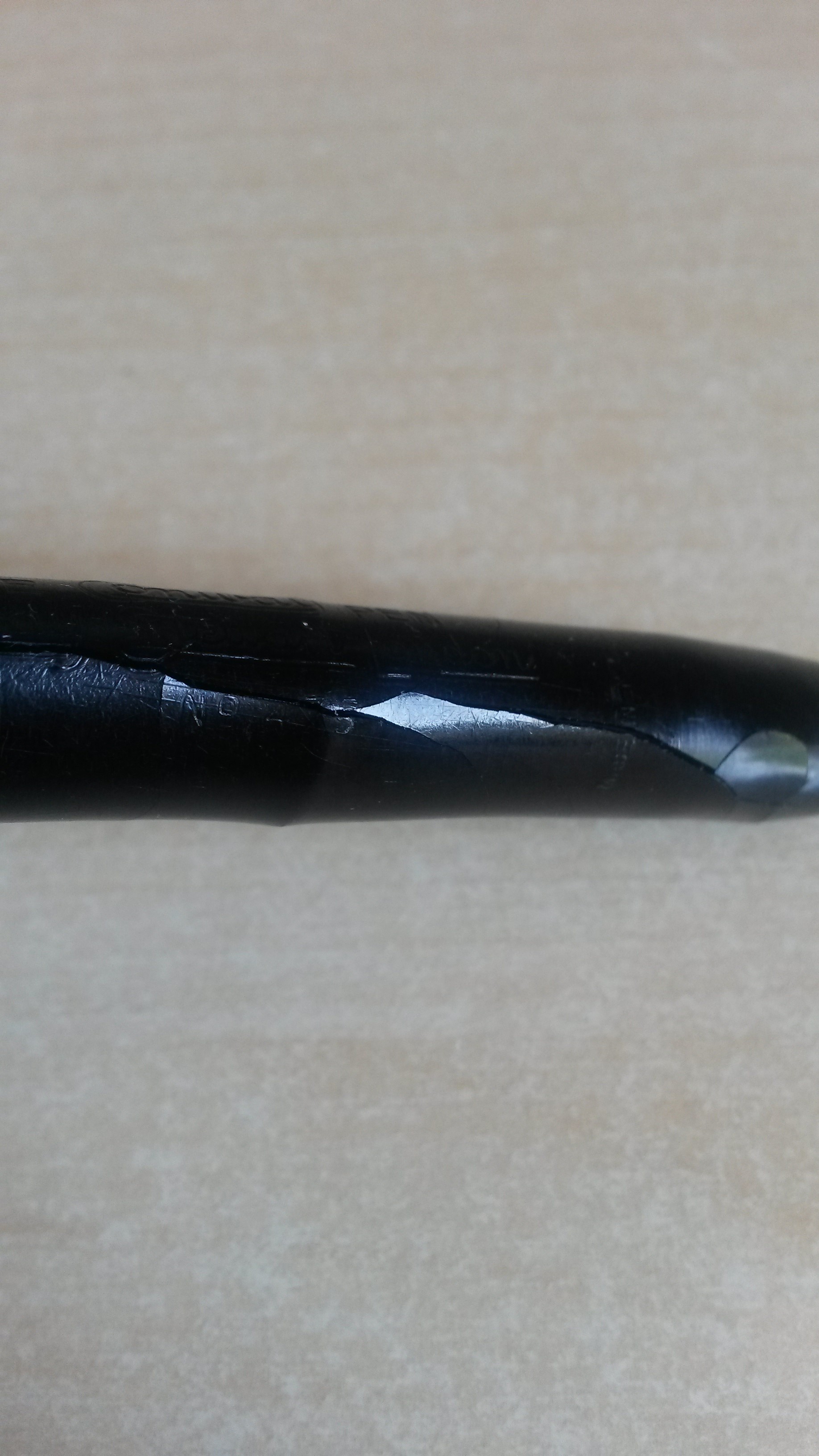 bom, avrò urtato la penna sul foglio che sarà andata a toccare la tastiera", penso (lo spazio sulla scrivania è ridotto). Nel momento in cui mi accingo nuovamente a scrivere ecco che noto il danno: il fusto della Conway Stewart 475 che stavo usando si è fessurato in più punti. La galalite, materiale di cui è fatta la penna, ha ceduto, forse, a causa dei recenti sbalzi meteorologici? Non ho mai immerso il fusto, al contrario del cappuccio che si è fatto qualche minuto in acqua prima che lo spirito di Zoniale venisse a sussurrarmi "Sicuro sicuro?" (*).