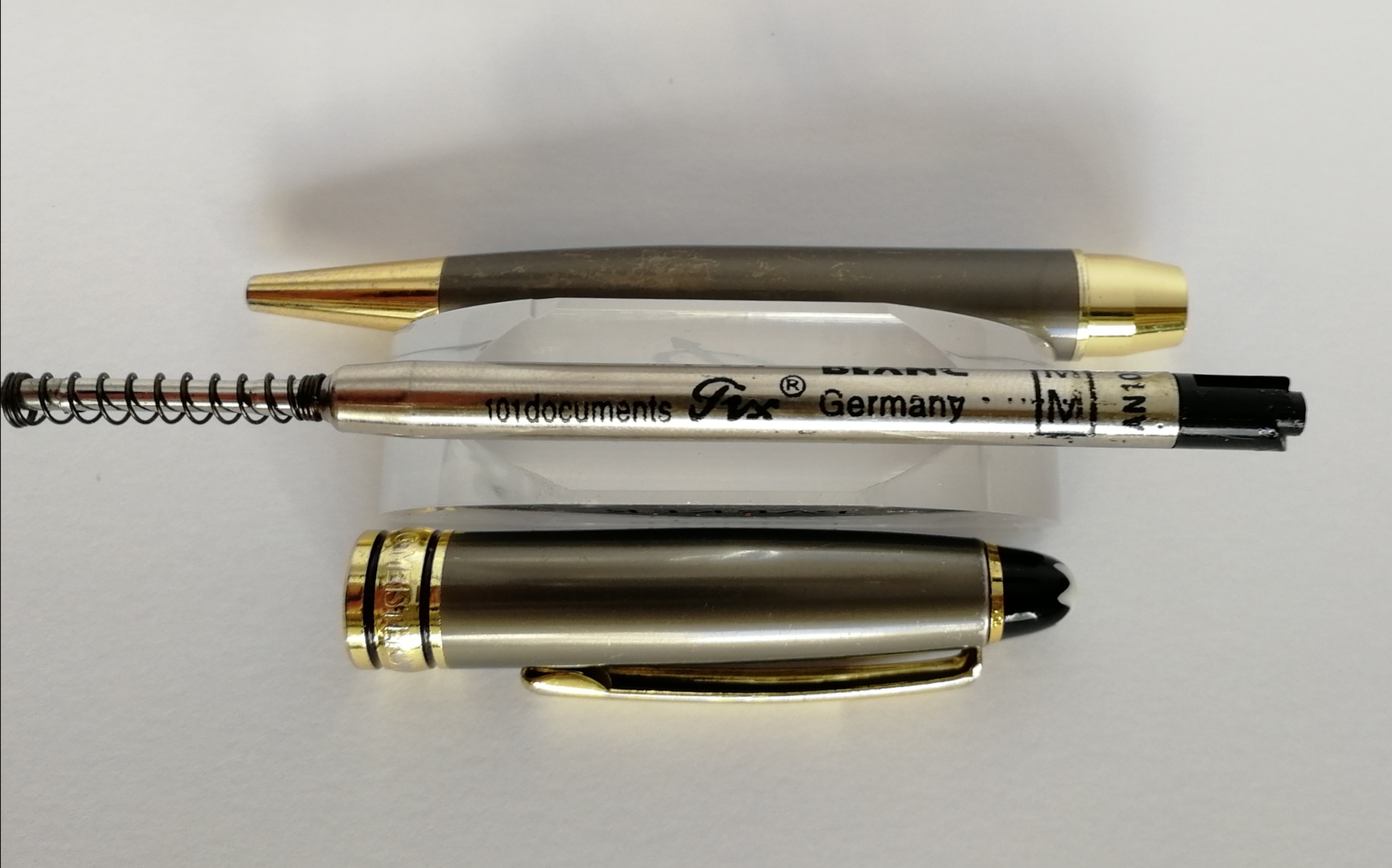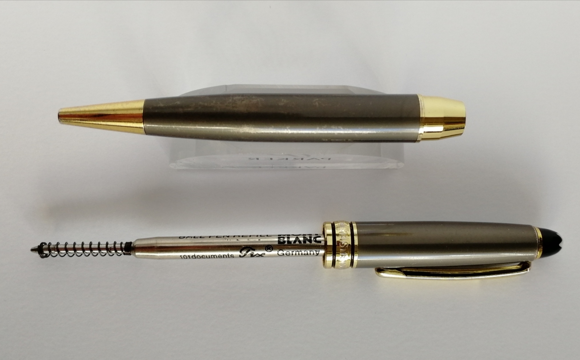 La penna a primo impatto sembra originale infatti nell'anello centrale è presenta la classica scritta "MontBlanc Meisterstuck - Fix" e l'anellino situato nella parte superiore del cappuccio presenta la scritta "Germany" e qualche cifra leggibile di quello che dovrebbe essere il numero di serie. Infine è completa di refill originale MontBlanc.