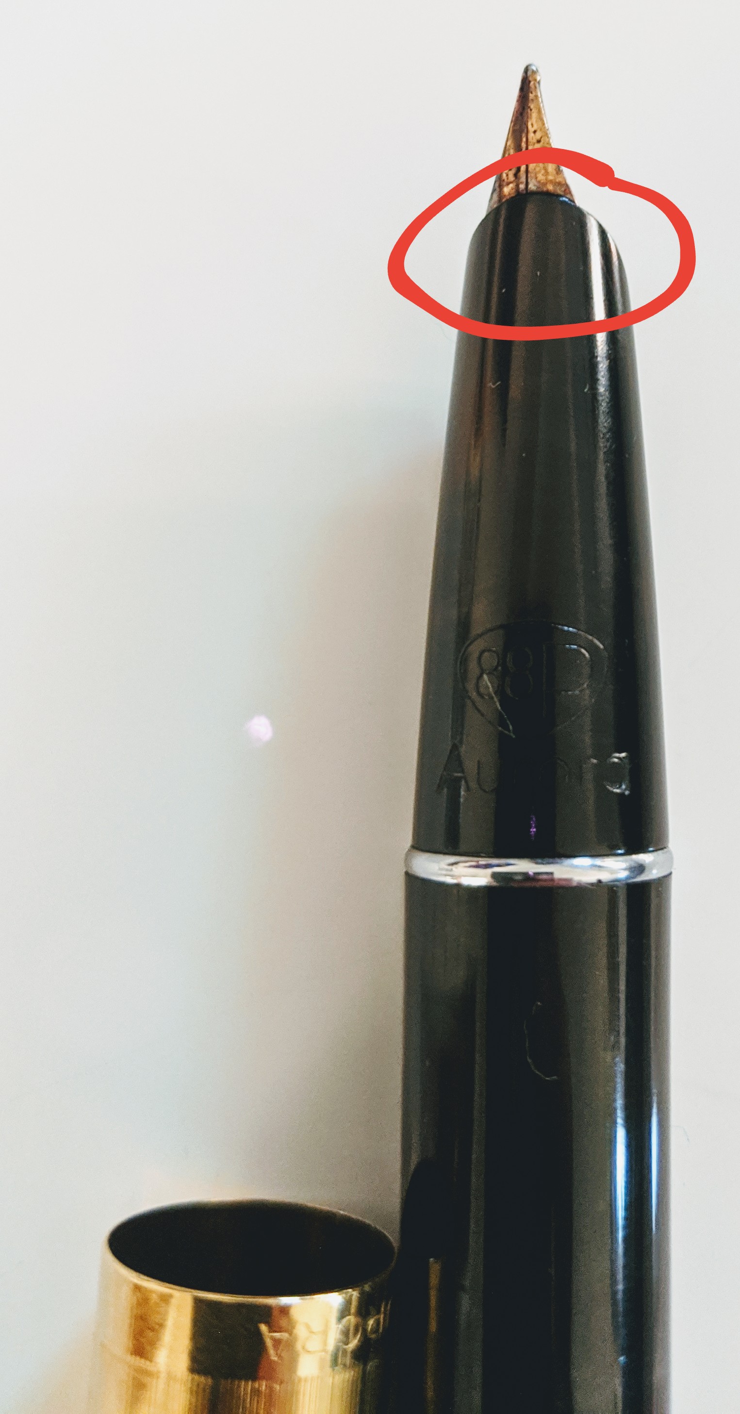 Questo tipo di penne puo' avere piccolo problema di compensazione (molto meno rispetto ad altre coeve o precedenti), in pratica quando c'e' aria nel serbatoio e si riscalda oltre un tot, questa si espande e preme sull'inchiostro provocandone l'uscita di mezza goccia. Sul perche' lo trovi proprio li, a quell'altezza nelle Aurora 88 come quella tua (E in le Aurora simili a queste) c'e' il controcappuccio, l'inchiostro quindi esce e si ferma li.