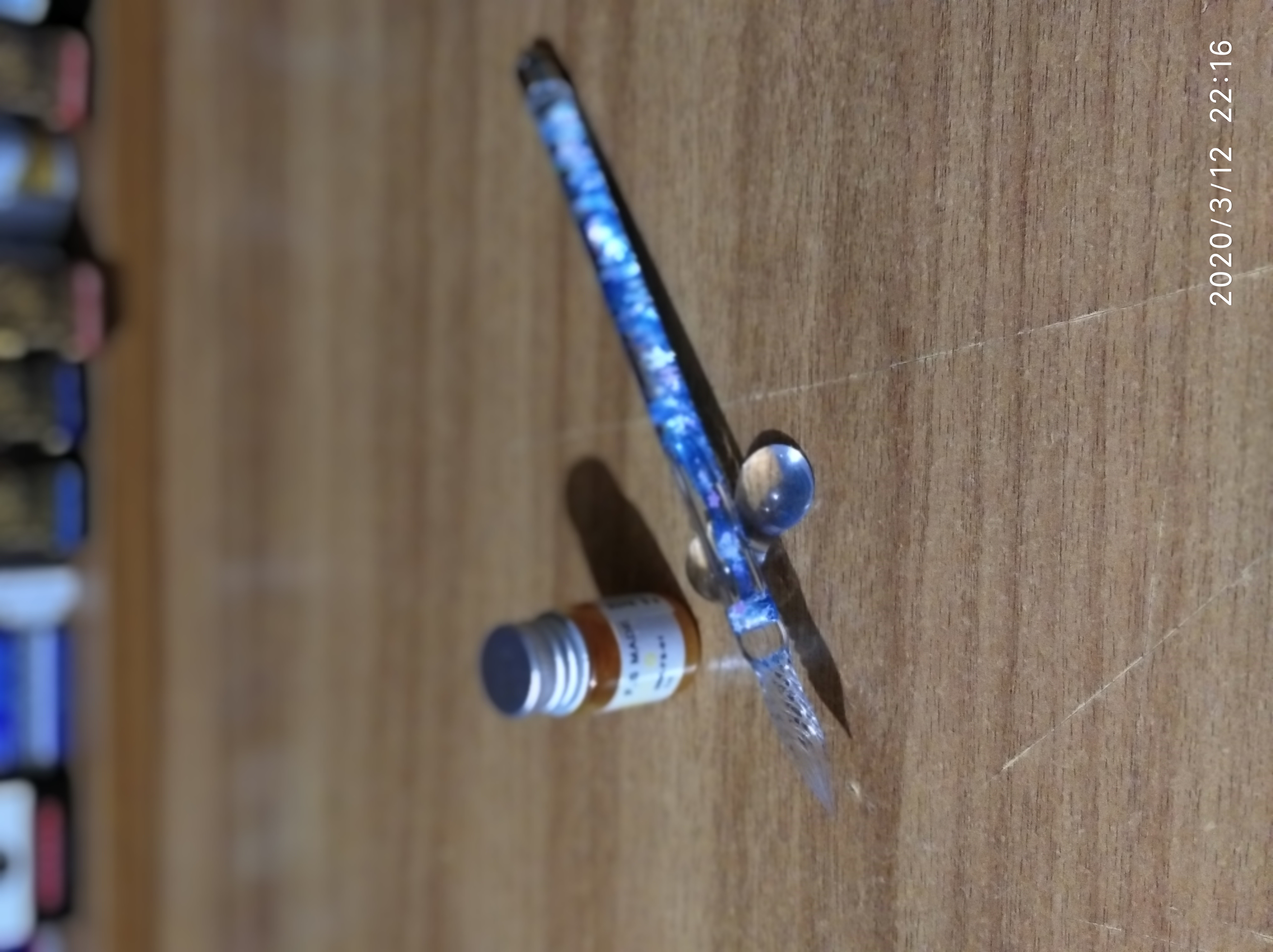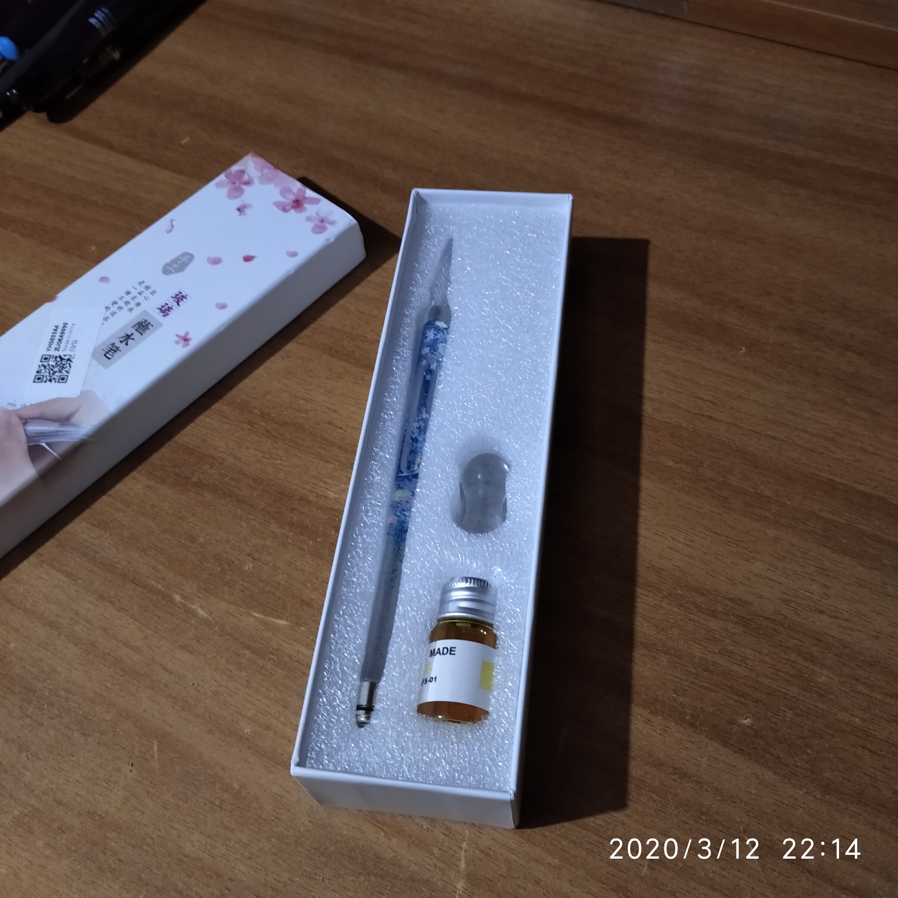 L'ho appena presa per aggiungerla alla mia collezione di strumenti calligrafico. Ha il pennino in vetro intercambiabile su una cannuccia in legno. Molto piacevole scriverci, come già detto rilascia maggiore inchiostro rispetto alla penna stilografica.