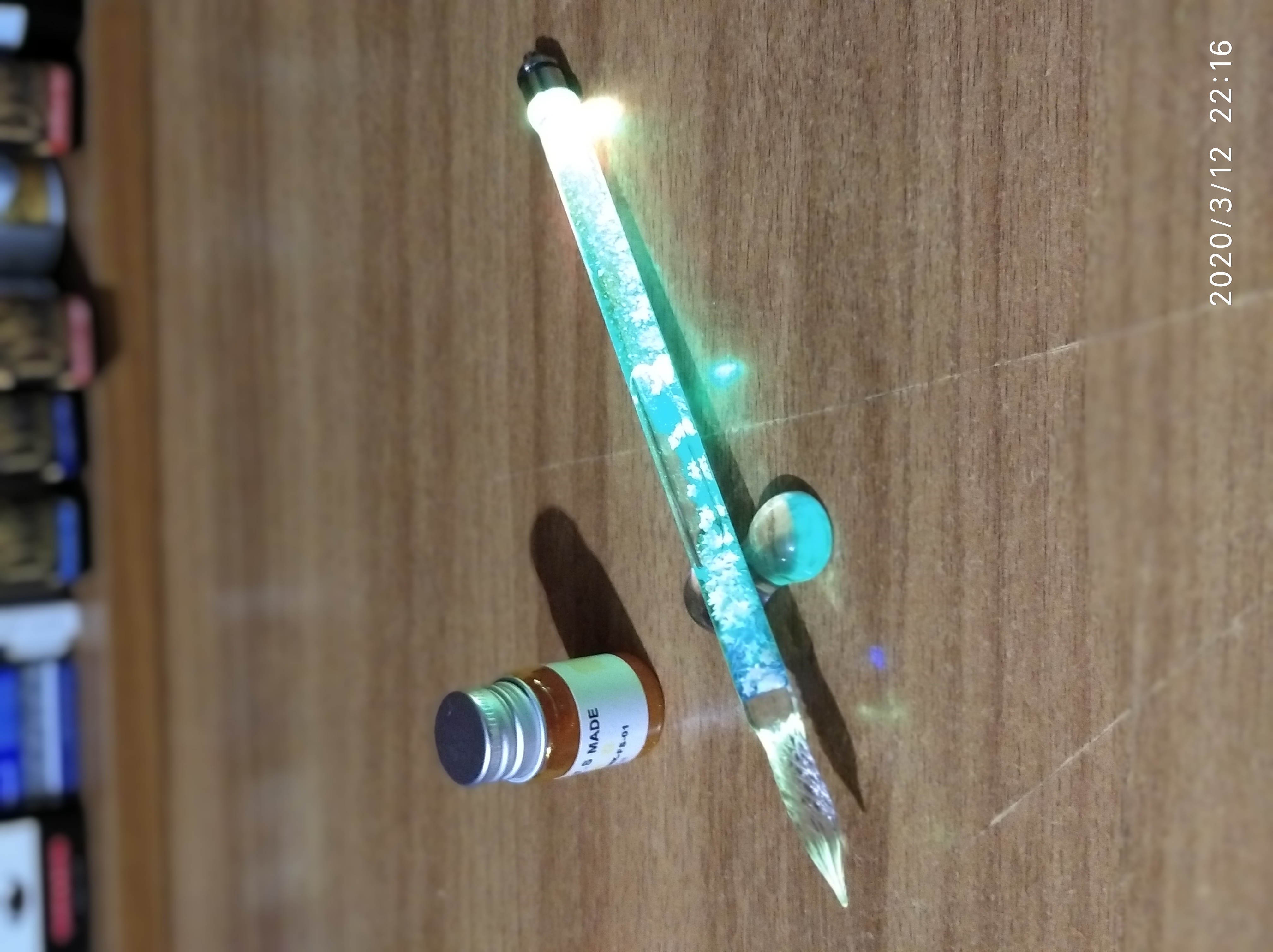La penna ha un led nel fusto, si aziona stringendo a vite il vano porta batteria. Una pacchianata epica.