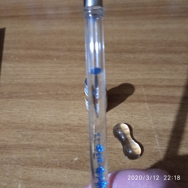 La penna ha un fusto cavo, riempito (non del tutto) di acqua, pieno di stelline e brillantini che danzano girandola... Non avevo letto su Amazon questo dettaglio! Sennò avrei preso qualcosa di meno... appariscente...