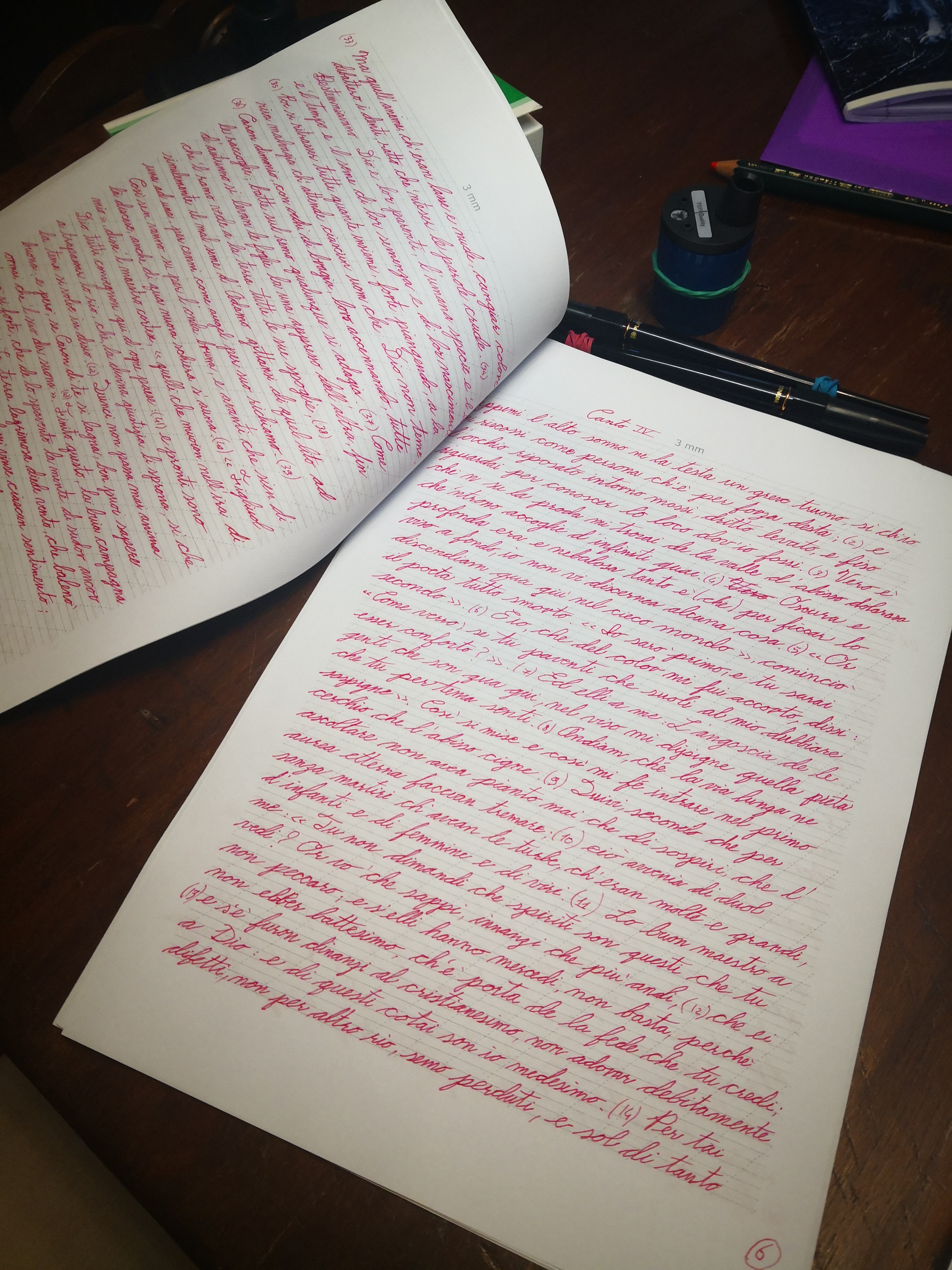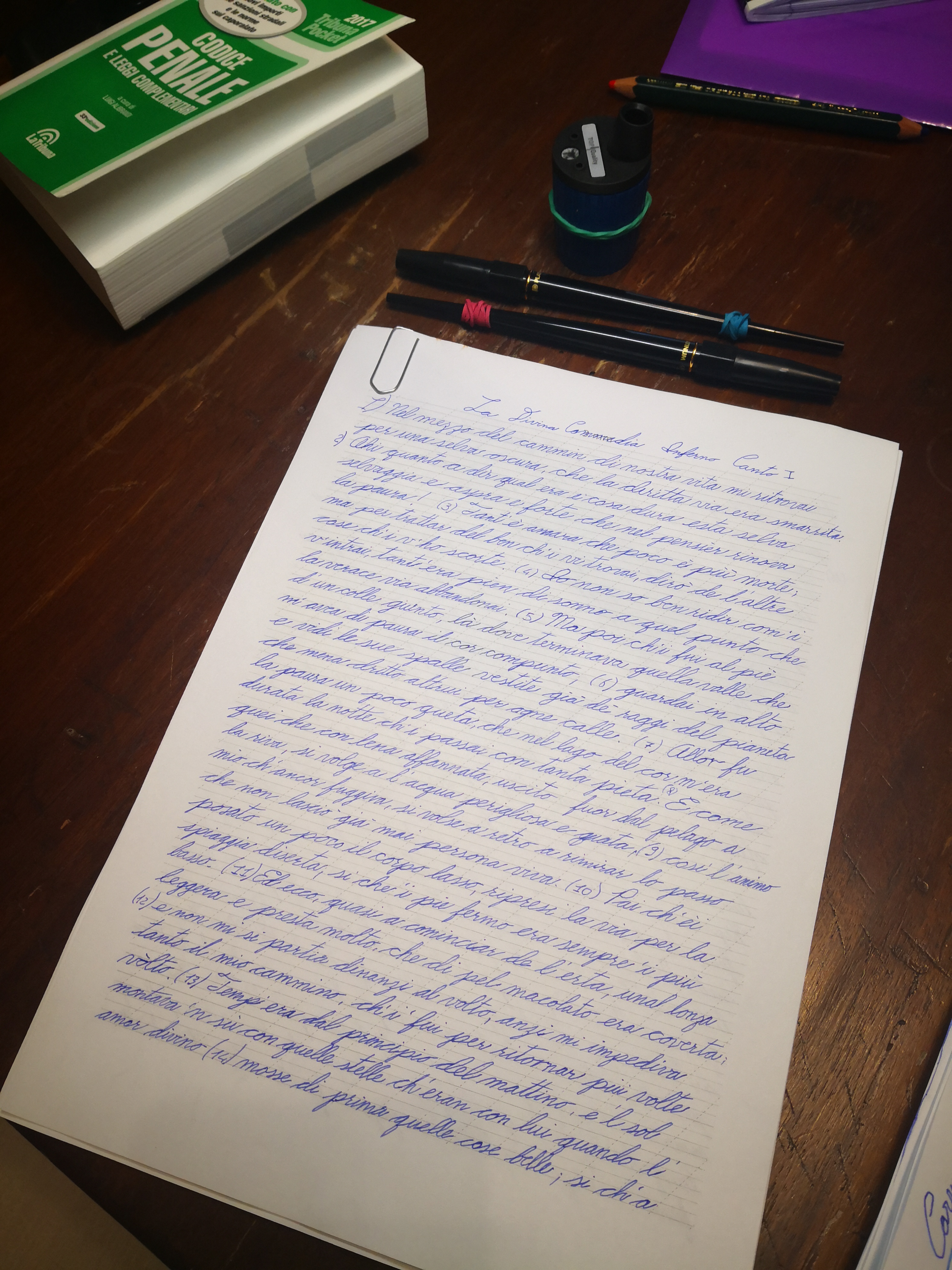 Sono uno studente universitario di giurisprudenza, ultimo anno, ho scoperto il mondo della stilografica grazie ad un collega "veterano" che pratica calligrafia da molti anni. Ho iniziato qualche mese fa al puro scopo di migliorare la mia calligrafia (prima decifrabile solo da me e dai farmacisti) acquistando una lamy safari e un manuale di calligrafia (Corsivo in Calligrafia, Barbara Calzolari), rapidamente mi sono lasciato prendere la mano (letteralmente) al punto dall'aver iniziato (sono a metà dell'opera) la trascrizione de L'Inferno.