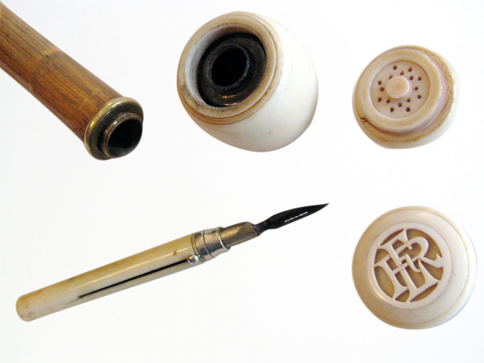Bastone da passeggio in malacca, con pomolo in avorio comprendente calamaio, sandracchiera e penna con porta mine.
