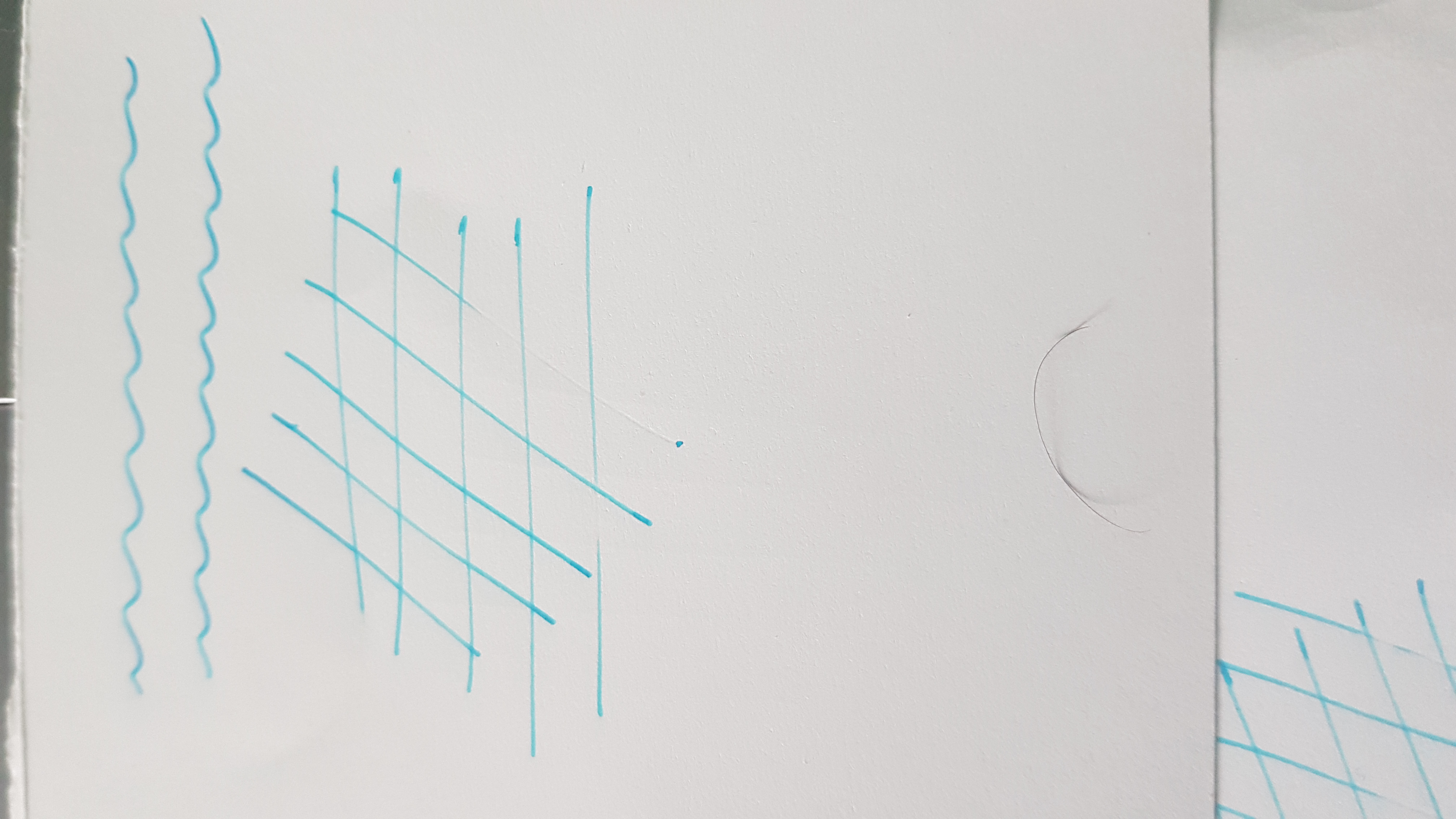 Allego prova di scrittura e foto pennino. Le ondine vengono bene, Le righe, invece hanno problemi nella parte di mezzo, soprattutto se fatte dall'alto al basso. Quando scrivo lo devo fare lentamente se no reato a secco.