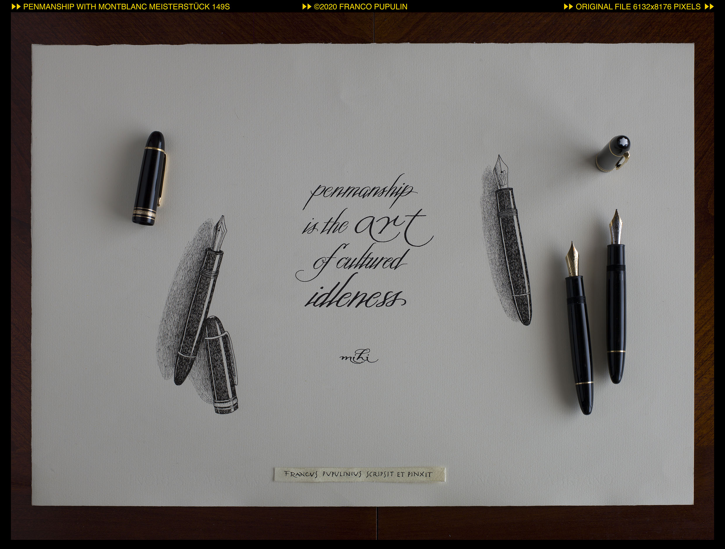 Apro questo argomento nel forum dedicato alla calligrafia, perchè l'operetta che vi presento è nata per dare forma calligrafica alle mie idee, anche se poi si è ampliata al disegno. L'esercizio calligrafico è stato realizzato con due delle mie Meisterstück 149, la recente Calligraphy con il suo bellissimo pennino flessibile e un'altra 149 con pennino BB, una penna del 1984. Tradotto liberamente, l'esercizio dice che "La calligrafia è l'arte di perdere tempo in molto colto"....