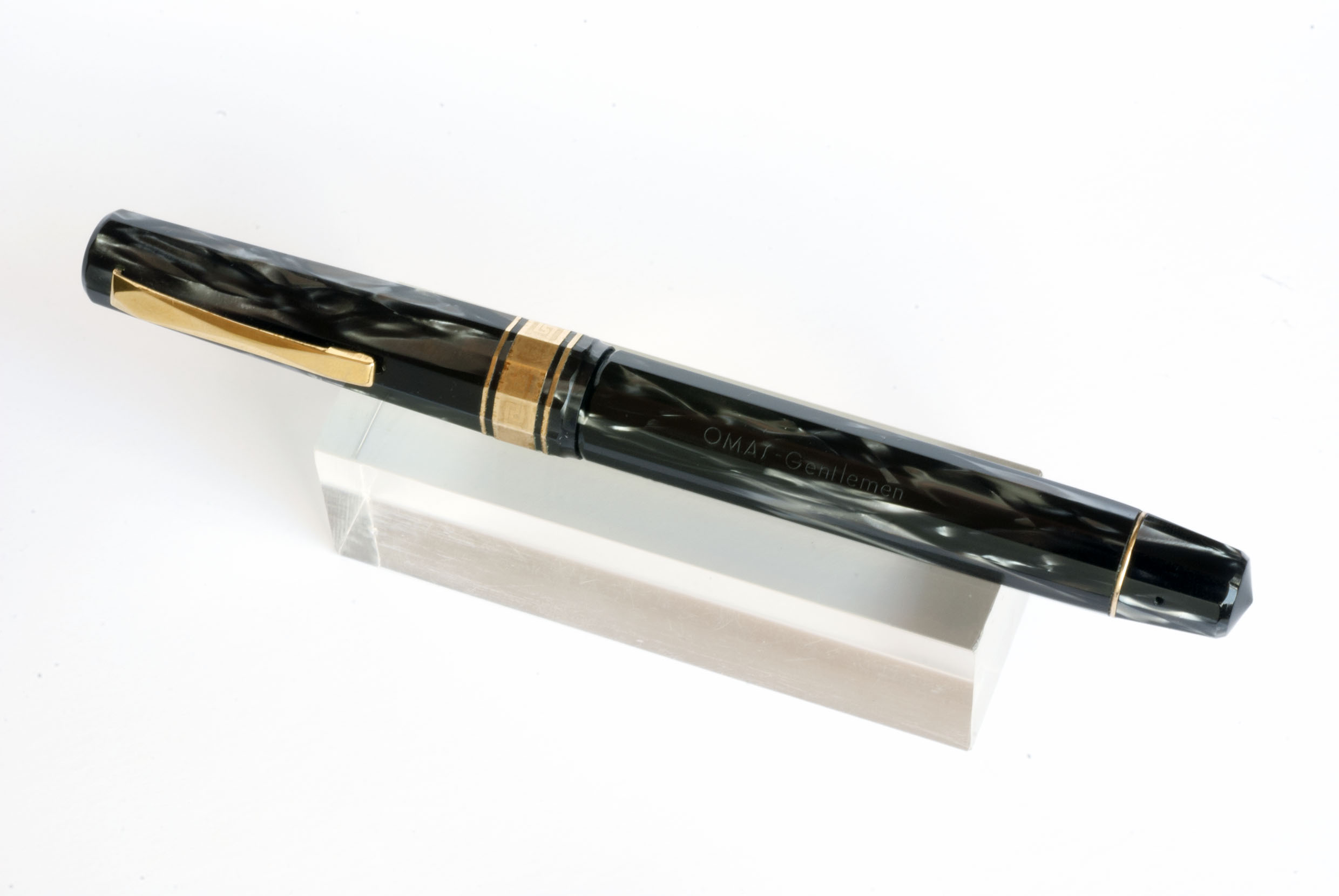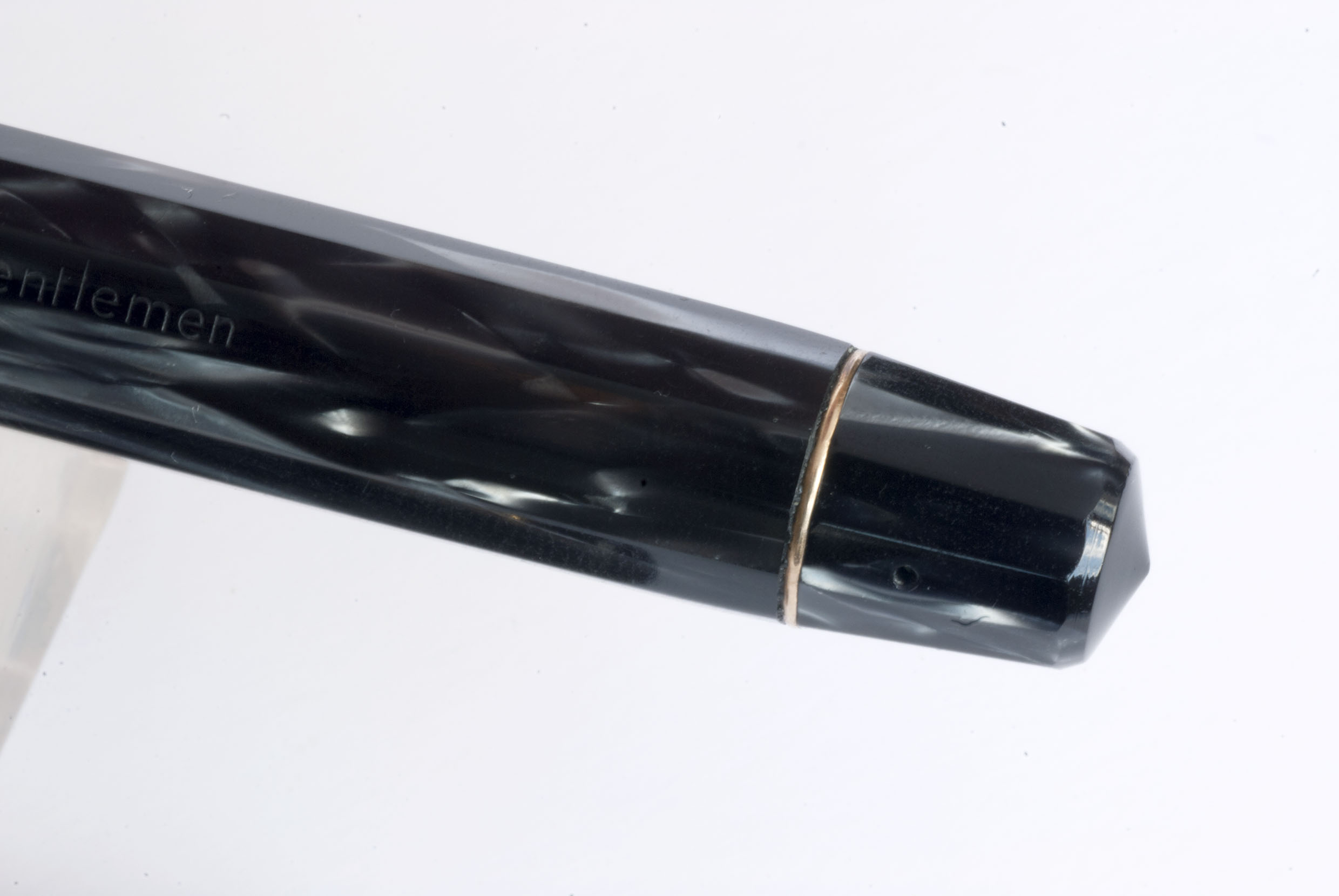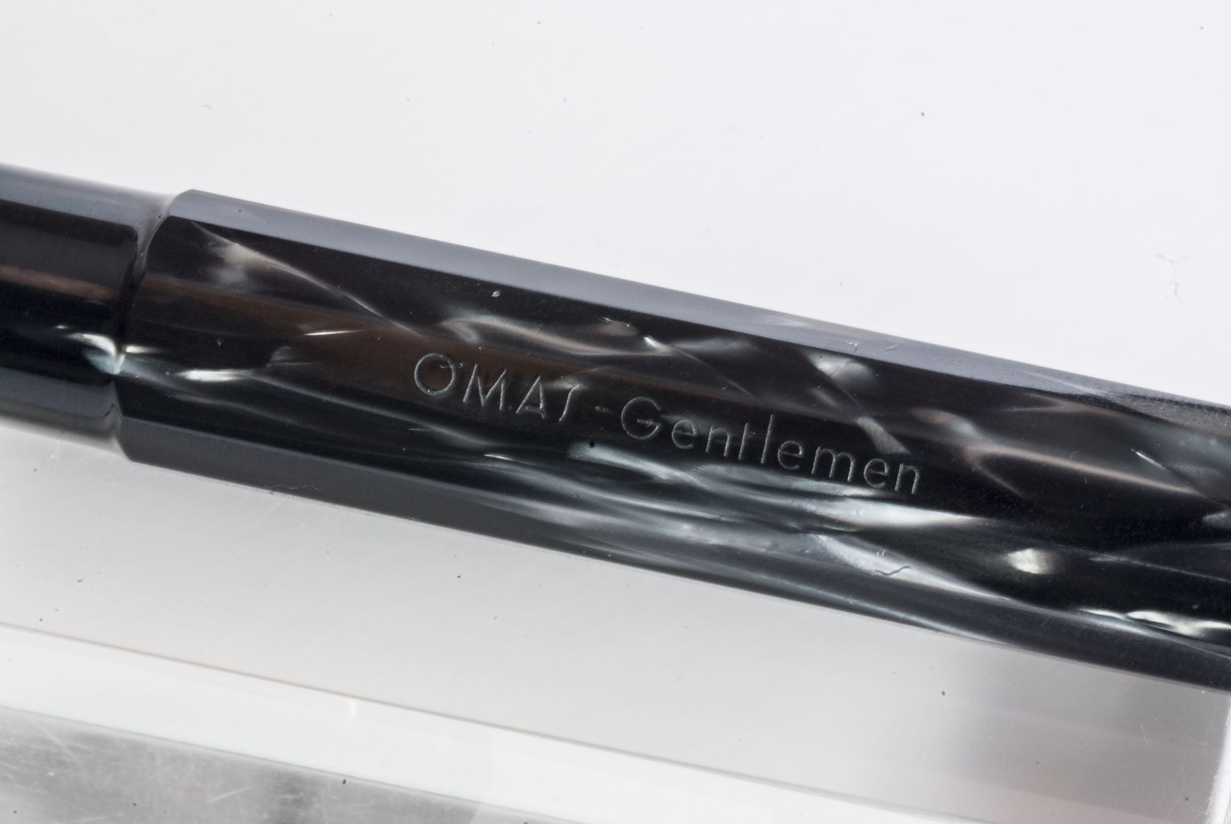 In questi giorni, sulla baia, ho visto in vendita un'altra Gentlemen in celluloide nera - che il proprietario confonde con una Gentleman in resina –, anch'essa nuova. Quest'ultima, però, ha un pennino piú recente, con sfiato rotondo, lo stesso che OMAS montava sul modello in resina, la Gentleman, appunto.