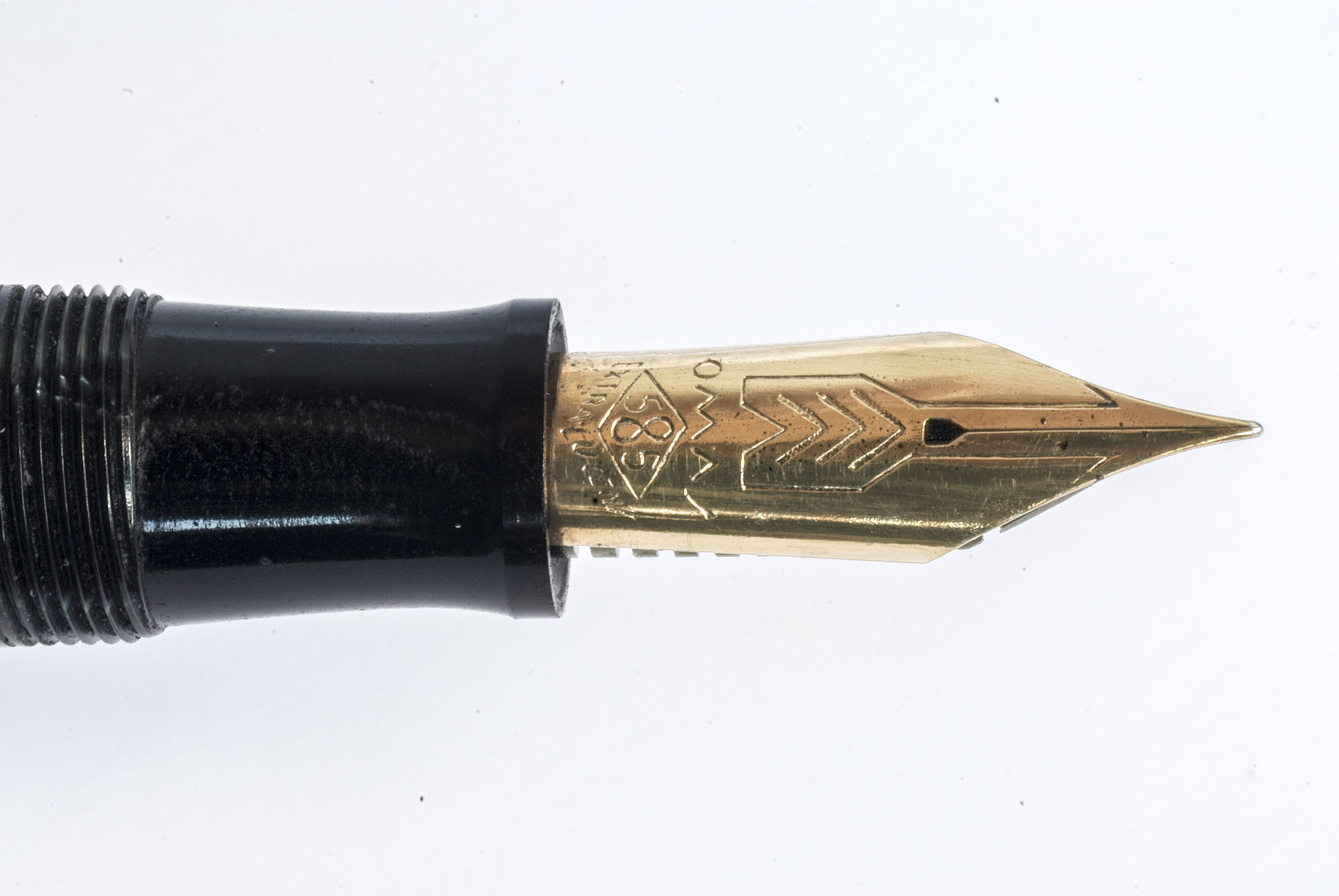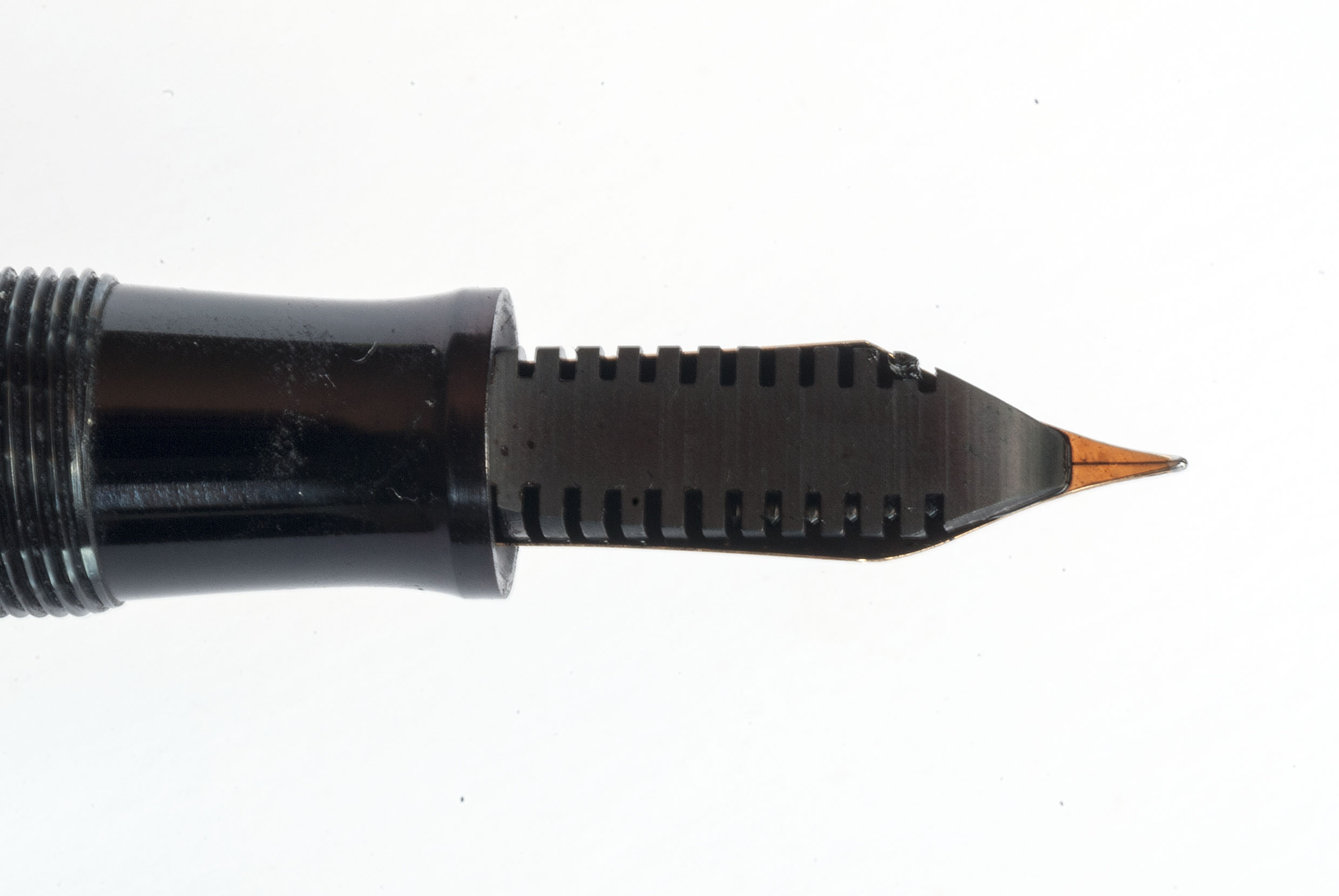 La Gentlemen in celluloide nera, peró, monta un pennino Extra, con sfiato a cuoricino. Non é stato sostituito, perché ho acquistato la penna nuova e intonsa.