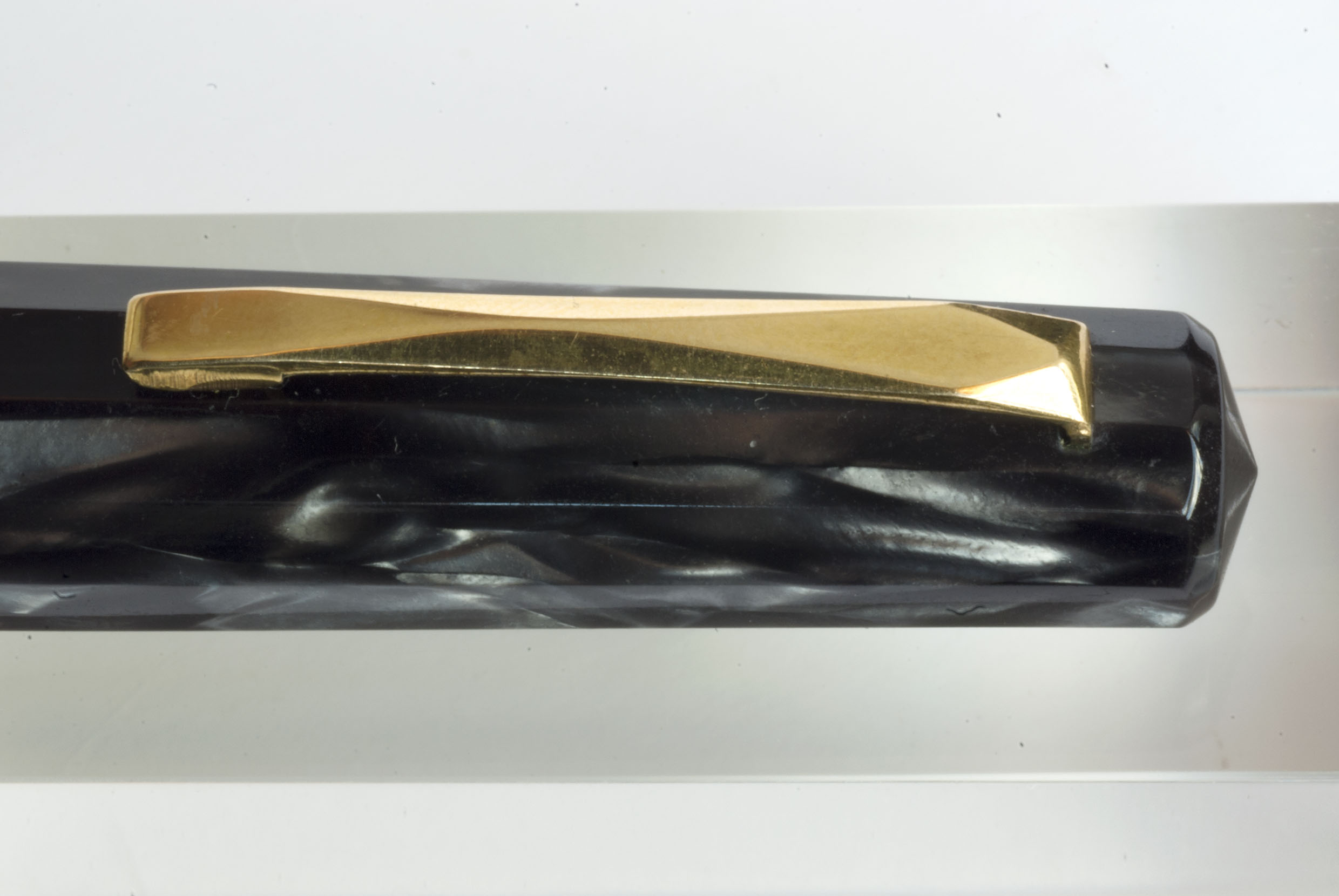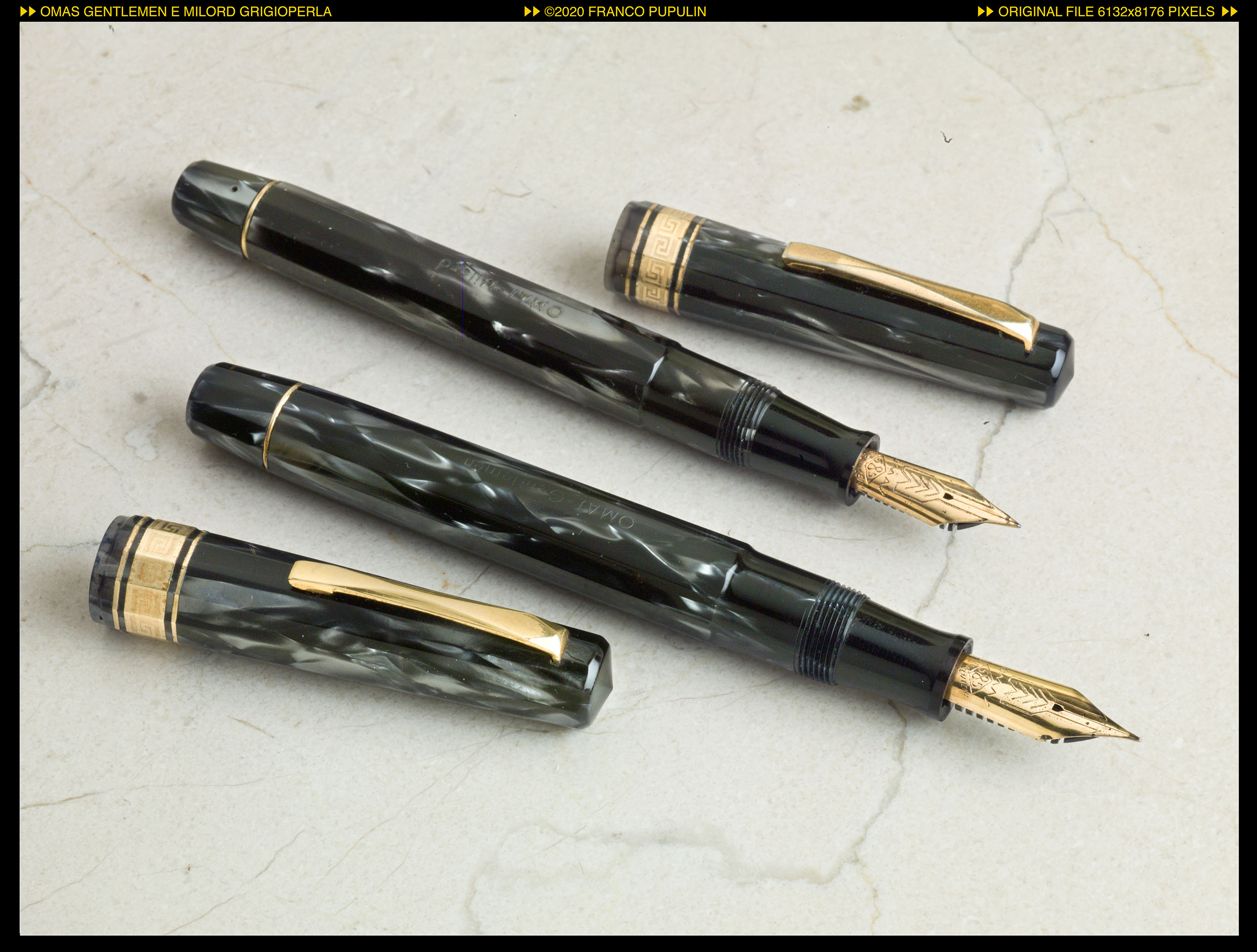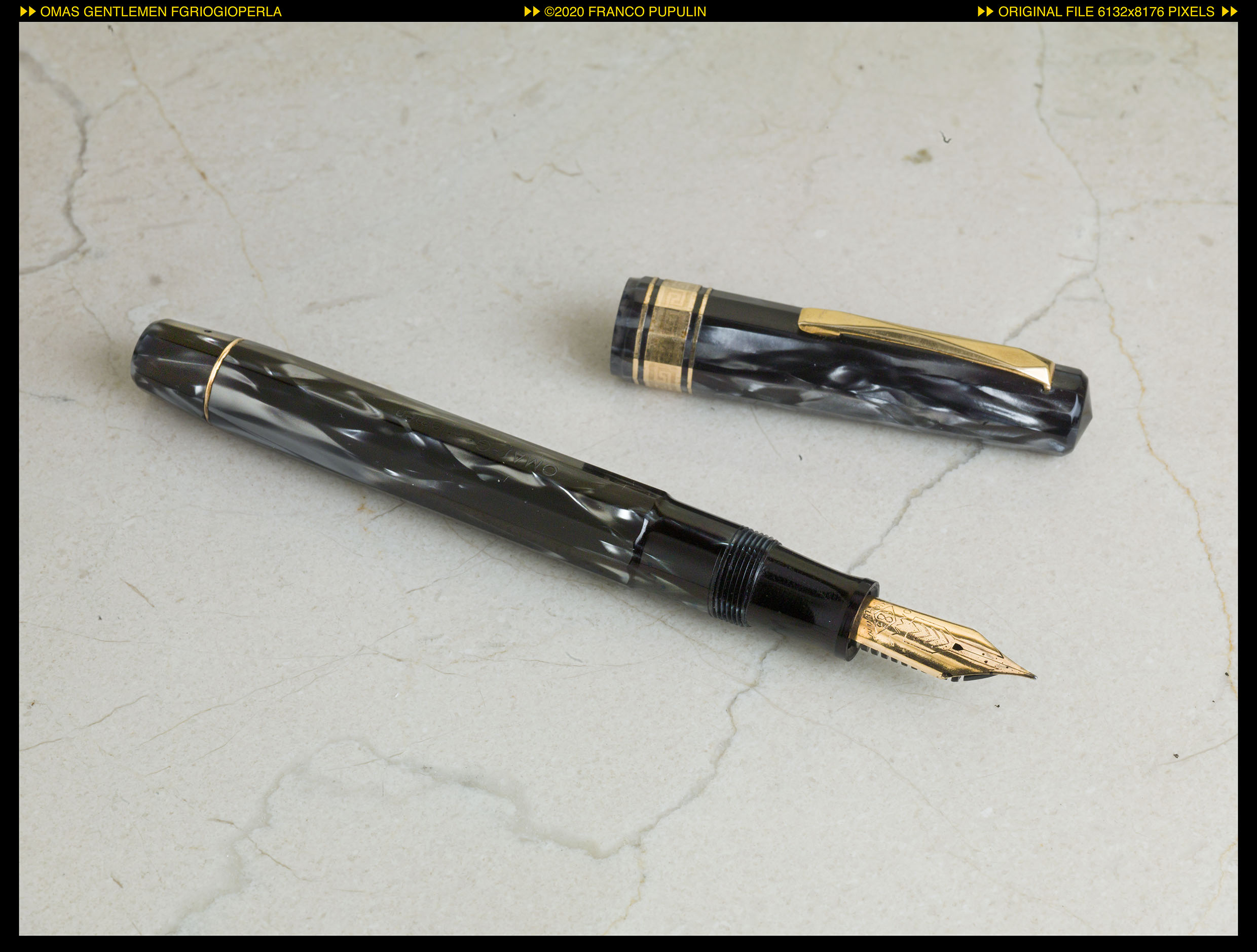 Come ho scritto più sopra, è una celluloide completamente diversa da quella che tradizionalmente OMAS chiama grigio perla, più scura, meno variegata e, in qualche modo, più marmorizzata. Ricordo che mi piacque moltissimo, ma a volte mi chiedo se non abbia sognato...