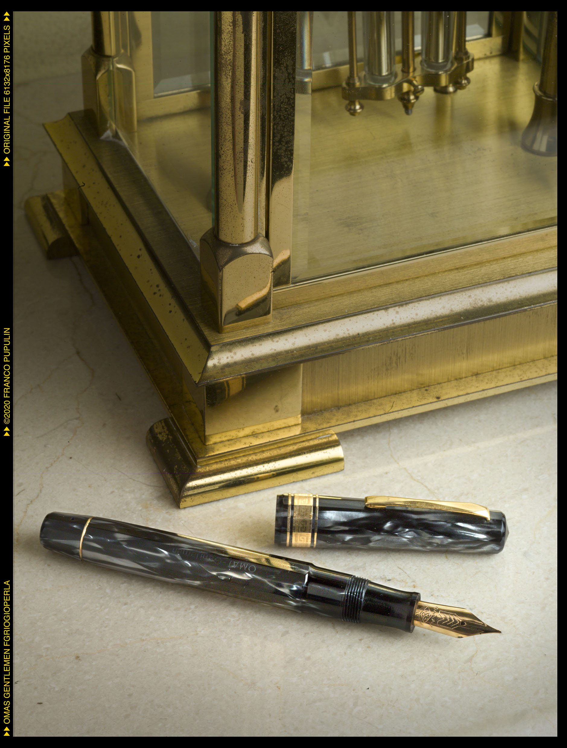 Ho provato ad applicarmi fotograficamente un po' di più, con l'aiuto di un paio di potenti flash monotorcia e relativi banks. Mi sembra che ora ci avviciniamo maggiormente alle intricate screziature della celluloide grigioperla di OMAS: