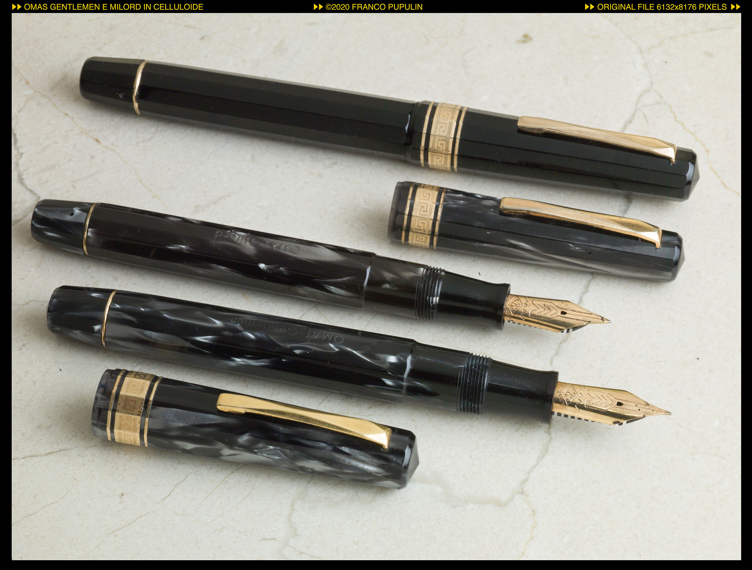 C’è una celluloide grigioperla, diversa da questa, più sobria, come un nero marmorizzato, di fatto quasi un colore nero ma con una variegatura leggera, elegantissima, che OMAS usó quando ripropose le sue penne in celluloide, credo nel 1991 o 1992. La utilizzò solo per un paio d’anni, credo, perché poi la sostituì nuovamente con una celluloide molto simile (se non la stessa) di quella in fotografia e, che io sappia, non la usò mai più per altre penne (forse ne aveva esaurite le scorte). Qualcuno ne avrá una fotografia?