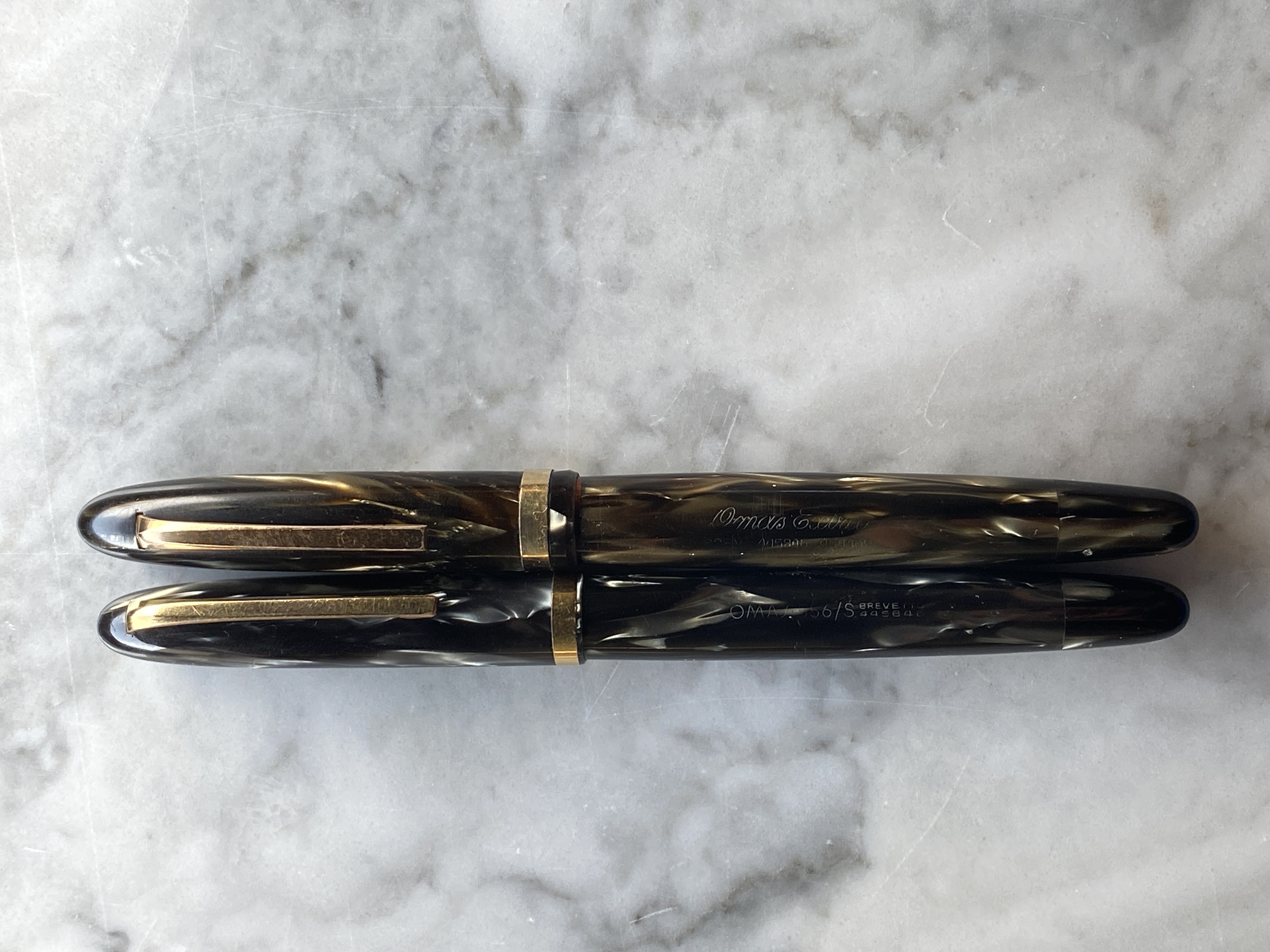 Mi permetto di aggiungere il mio contributo a questo intervento per mostrare la (indecorosa) foto delle mie due ogiva in grigio perla dove si nota come lo stesso materiale sulla OMAS Extra ha decisamente virato verso il verde.