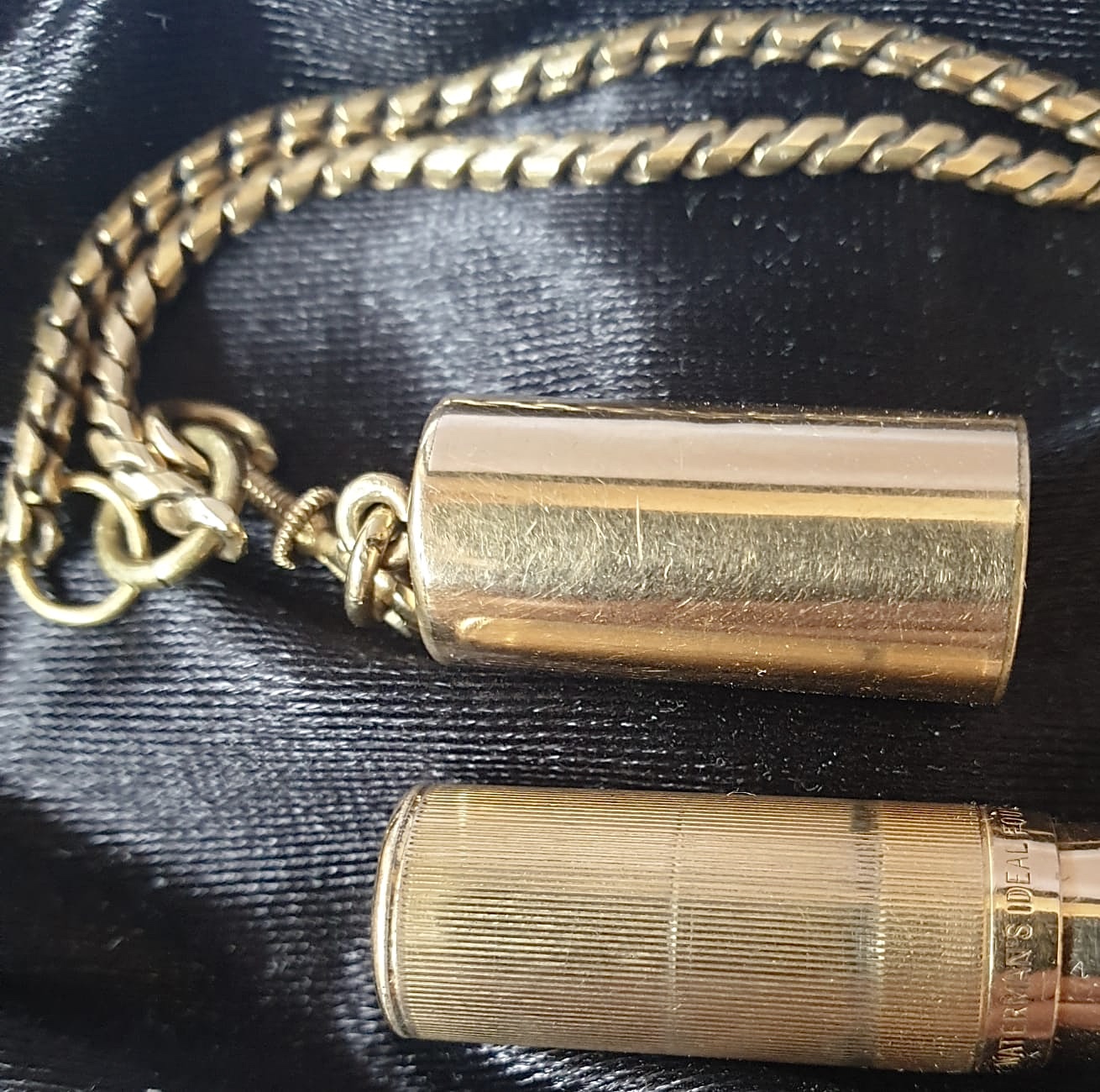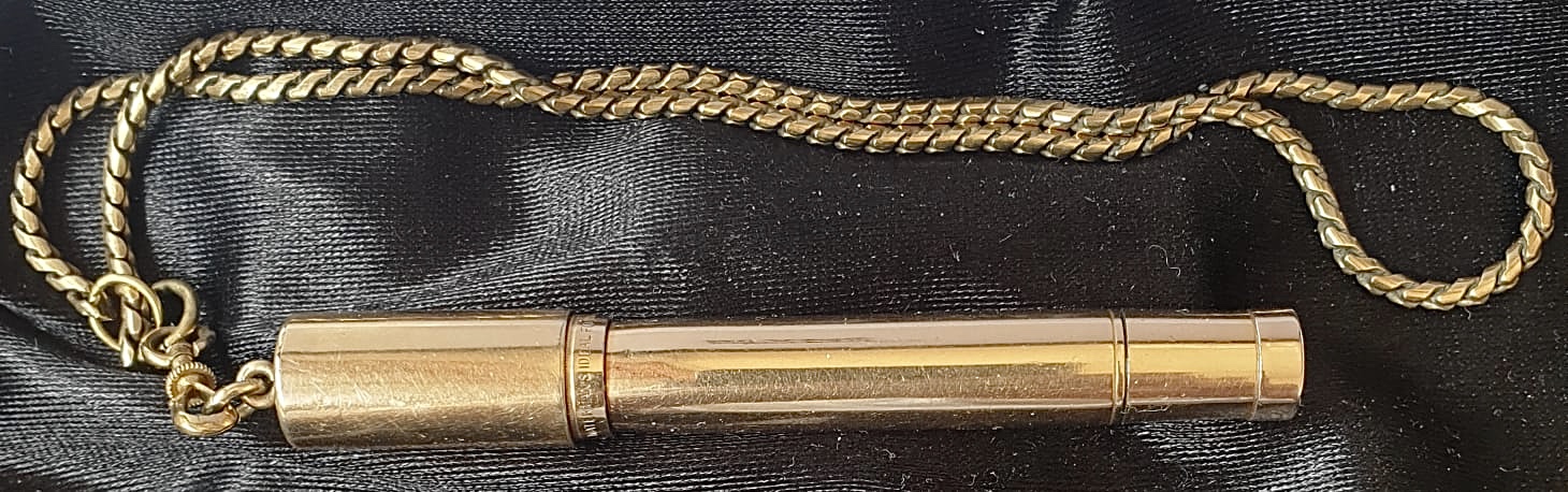 La penna veniva appesa al collo o al panciotto. Il primo cappuccio teneva il secondo (a ritenzione frizionale) con tutta la penna, per cui, all'occorrenza...scrittoria, veniva estratta intera senza dover sganciarla dalla catenella cui rimaneva attaccato il primo cappuccio.