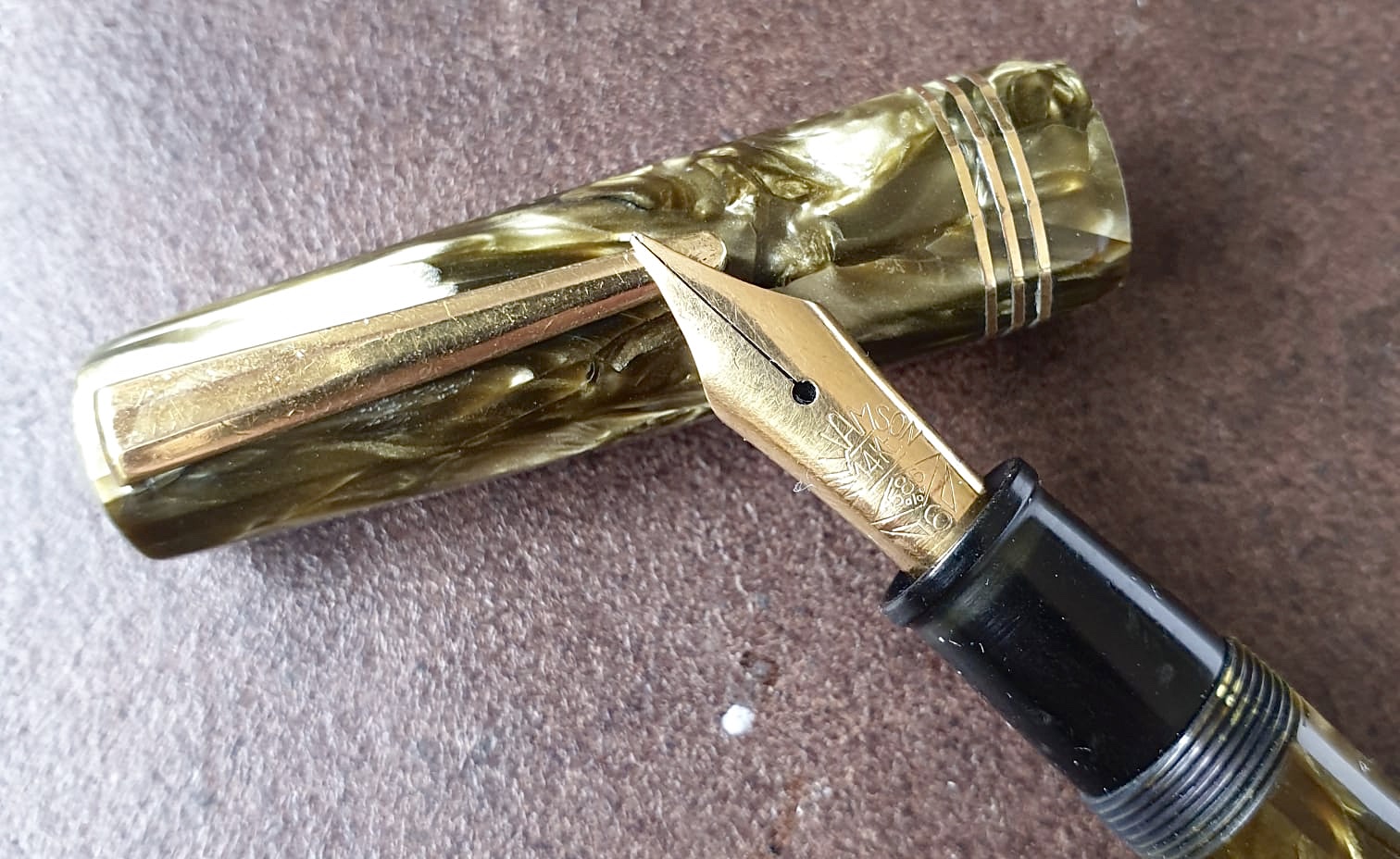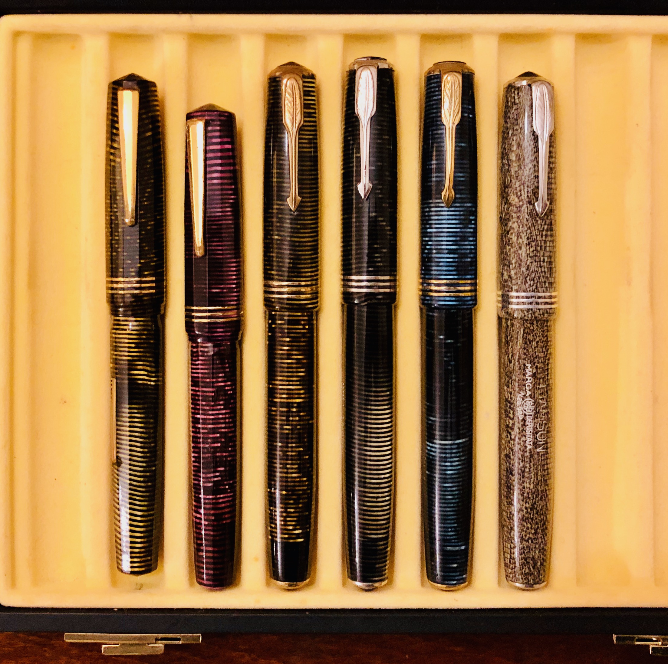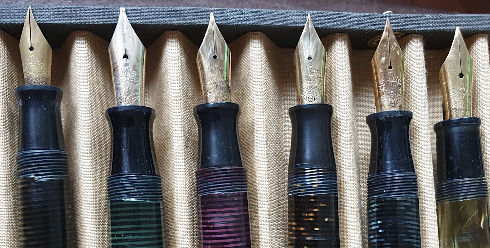 Certo che le quattro anellate, verde, blu, marrone e lilla, la quinta color “cappuccino” e lo stiloforo grigio perla/nero, sono tra le più belle penne mai viste: come celluloide (la lilla è tra le mie preferite), lavorazione, pennino e design, anche se di chiara.. ispirazione Vacumatic.