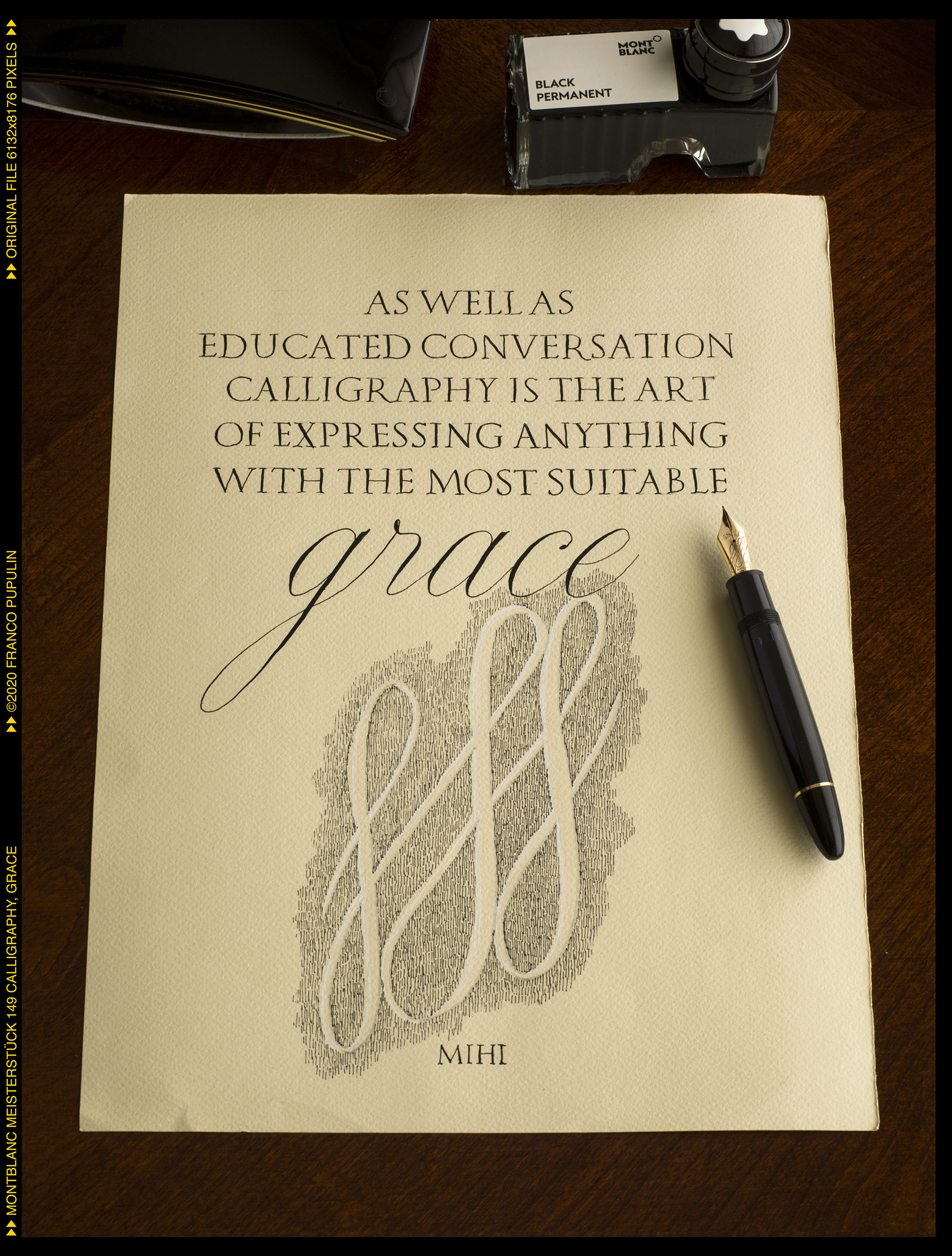 Un pennino appuntito non é forse l'ideale per scrivere i caratteri della capitale quadrata romana, ma l'esperimento consisteva proprio nell'utilizzare per tutte le scritte e il disegno il solo pennino della Meisterstück 149 Calligraphy.