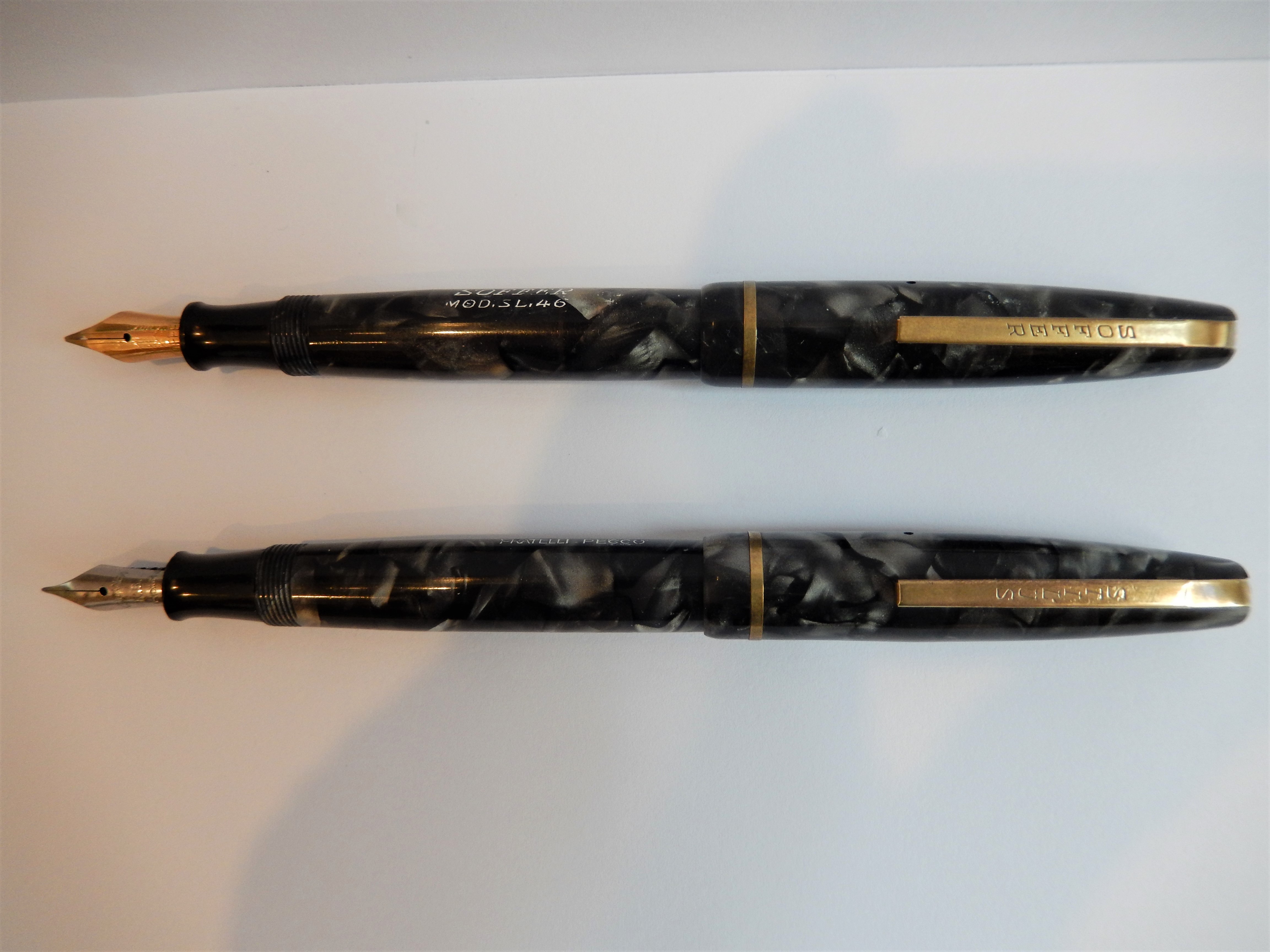 Le penna appaiono identiche, come spero che anche l'inadeguatezza delle due foto possa mostrare. Clip, anellino, forma, dimensione, levetta ed anche il colore di una bella celluloide color grigio marmorizzato. Variano, naturalmente le impronte, entrambe molto nitide, che riportano l'una " Soffer Mod. SL. 46" e l'altra "Mod. Stilus 1050 " e sotto " FRATELLI PECCO" . I pennini sono rispettivamente un Soffer e un Eridanea N.8 Iridium.