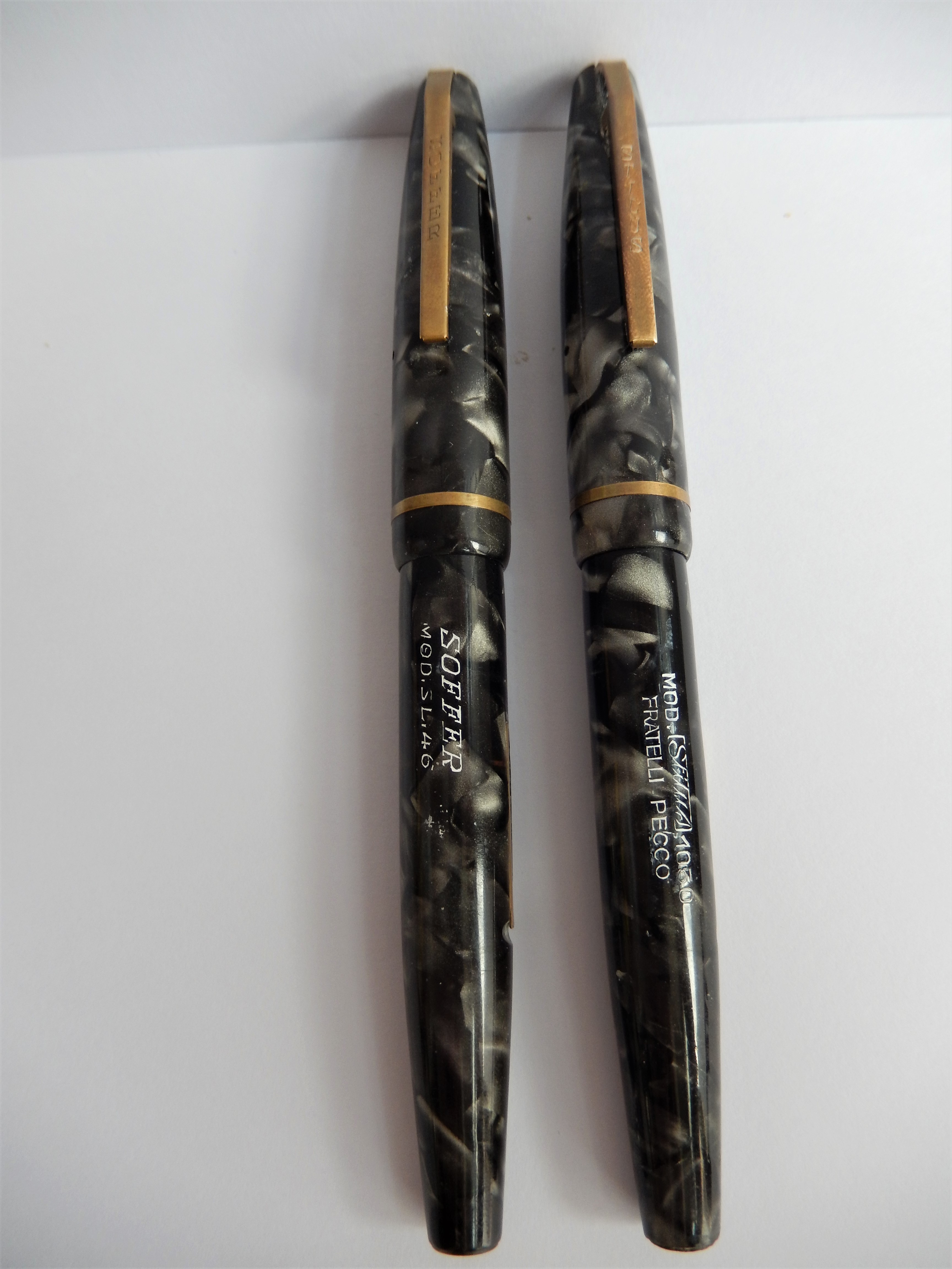 Le penna appaiono identiche, come spero che anche l'inadeguatezza delle due foto possa mostrare. Clip, anellino, forma, dimensione, levetta ed anche il colore di una bella celluloide color grigio marmorizzato. Variano, naturalmente le impronte, entrambe molto nitide, che riportano l'una " Soffer Mod. SL. 46" e l'altra "Mod. Stilus 1050 " e sotto " FRATELLI PECCO" . I pennini sono rispettivamente un Soffer e un Eridanea N.8 Iridium.