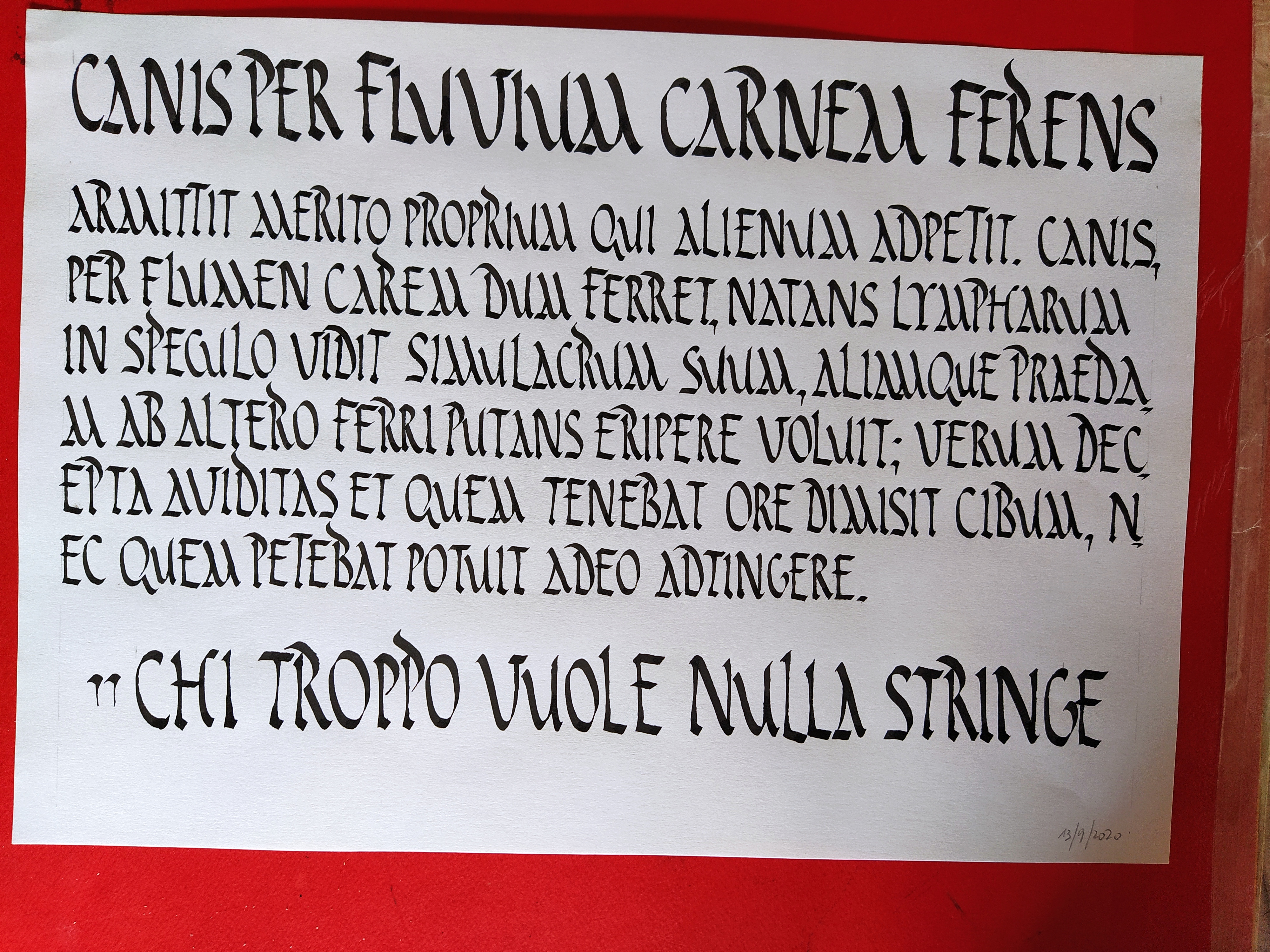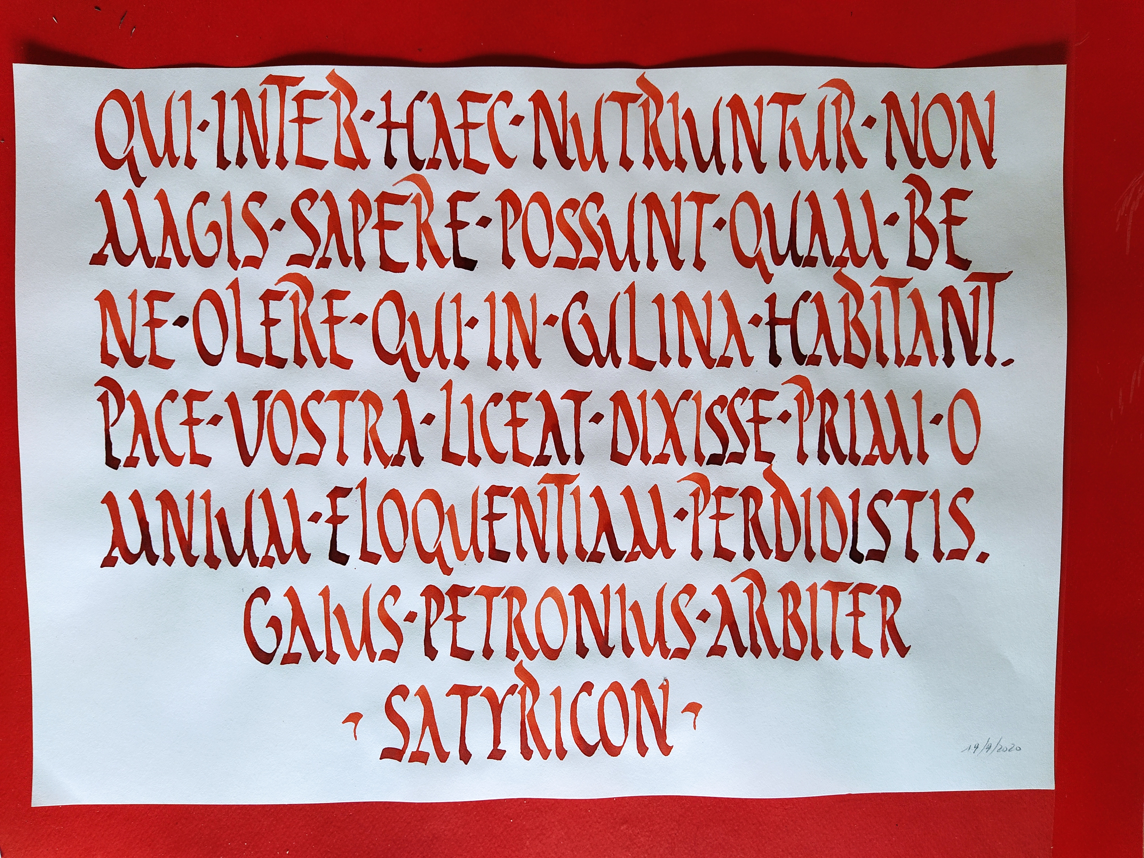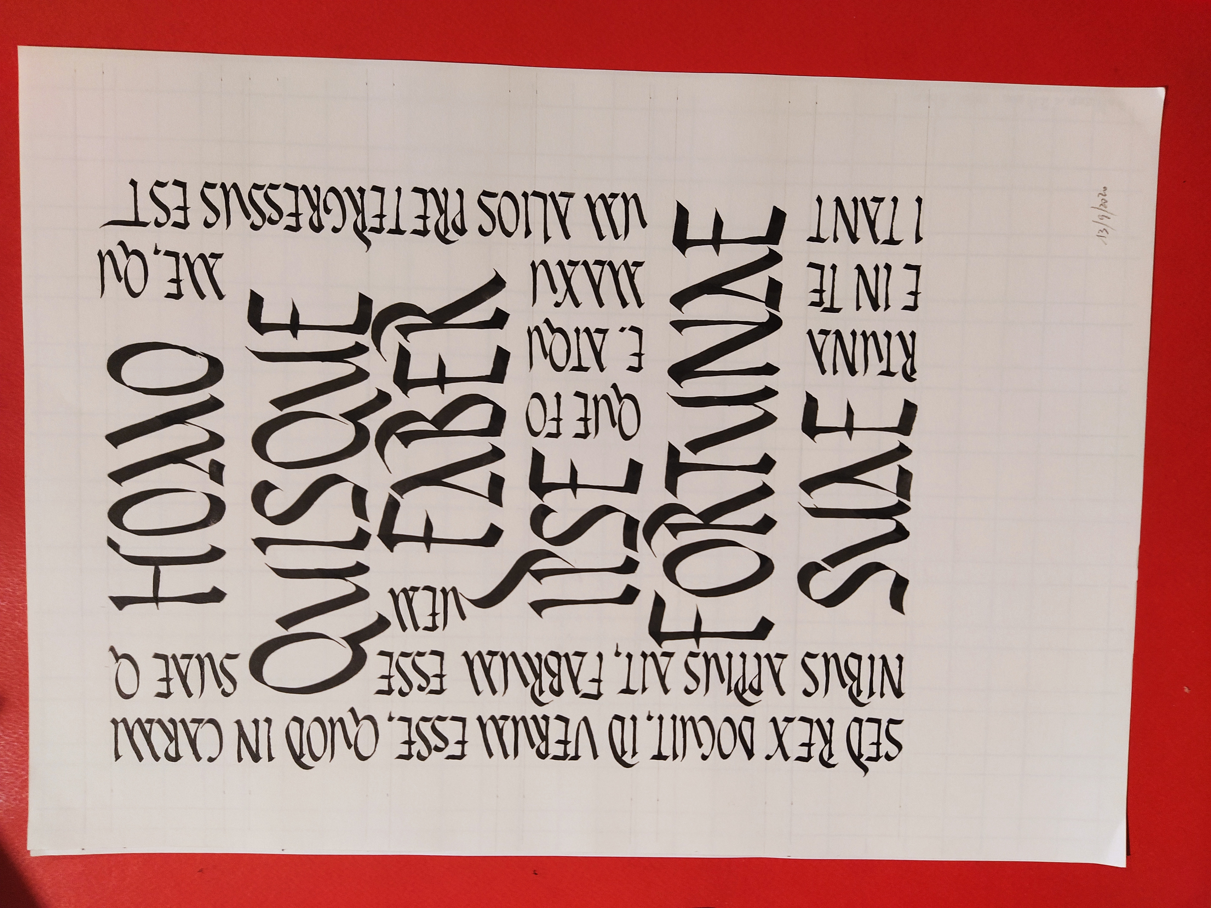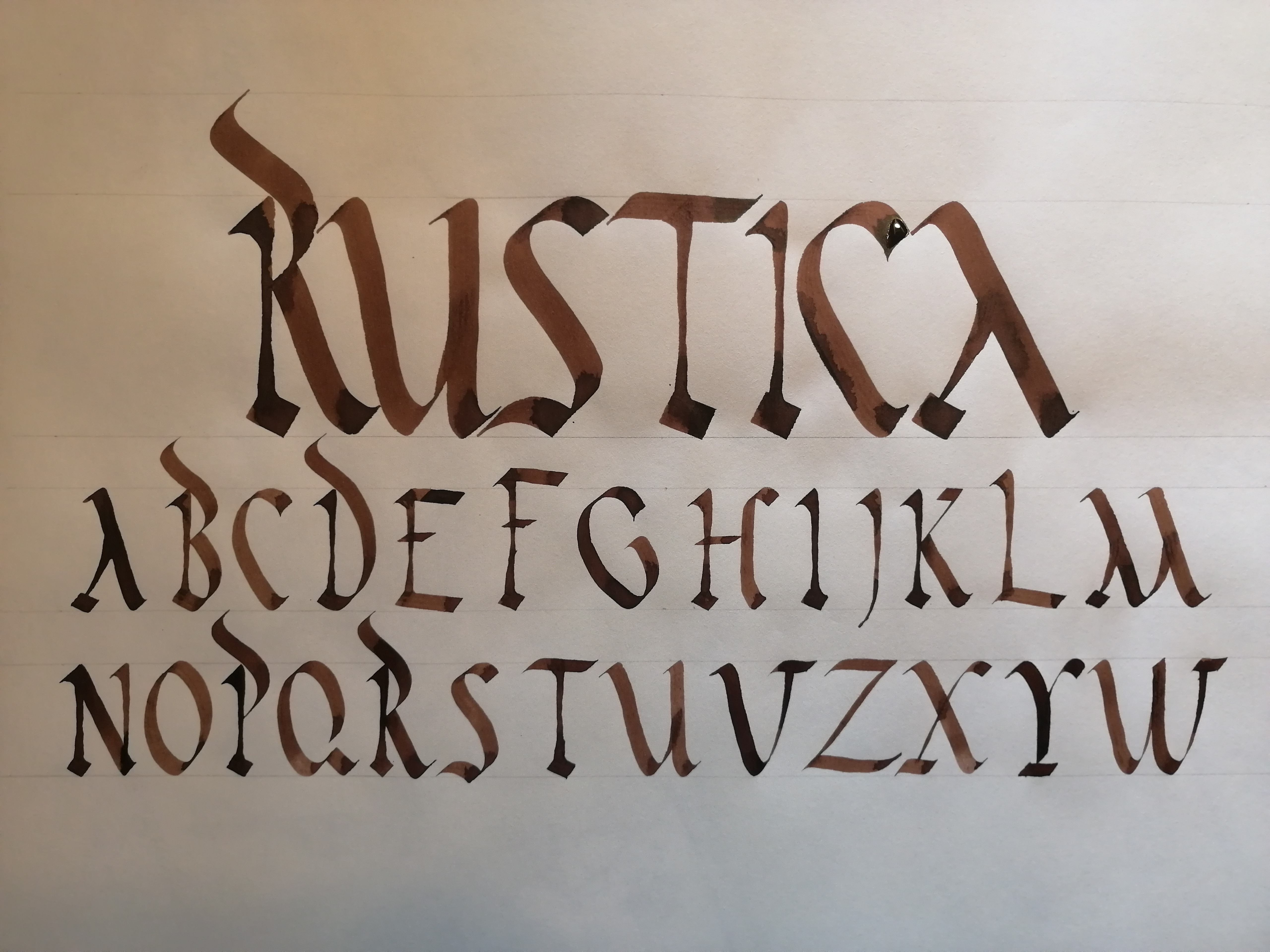 Veramente notevole!!! E bello l'accostamento della Rustica con una Gotica. Complimenti!calli1958 ha scritto: ↑giovedì 17 settembre 2020, 9:44In effetti non si può dire che sia facilmente abbordabile; le aste a a stringere scendendo e poi ad allargare sullo stesso tratta sono un "bel" problema. E' anche vero che provando, con pazienza e costanza, qualcosa comincia a uscire. Tu hai notevoli capacità (osservo sempre con interesse e ammirazione i tuoi scritti e i tuoi disegni) e se volessi di sicuro potresti renderla bene. Certo, dovresti mettere da parte (almeno provvisoriamente) le tue amate stilografiche e usare strumenti a punta tronca più larga (più è stretto il pennino più difficoltosa, o invisibile, è la variazione di tratto), inoltre uno strumento senza i rebbi tipici del pennino (quindi per esempio, calamo, Automatic Pen, Parallel Pen e punte simili) rendono un poco più comoda la rotazione. In più, insistendo nelle prove, a poco a poco la scrittura rende il suo piacevole effetto. Per il momento io sono arrivato a questo punto, come vedi nell'allegato (perdona la censurabile qualità della foto, non ho la tua attrezzatura né tantomeno la tua abilità artistico-fotografica).