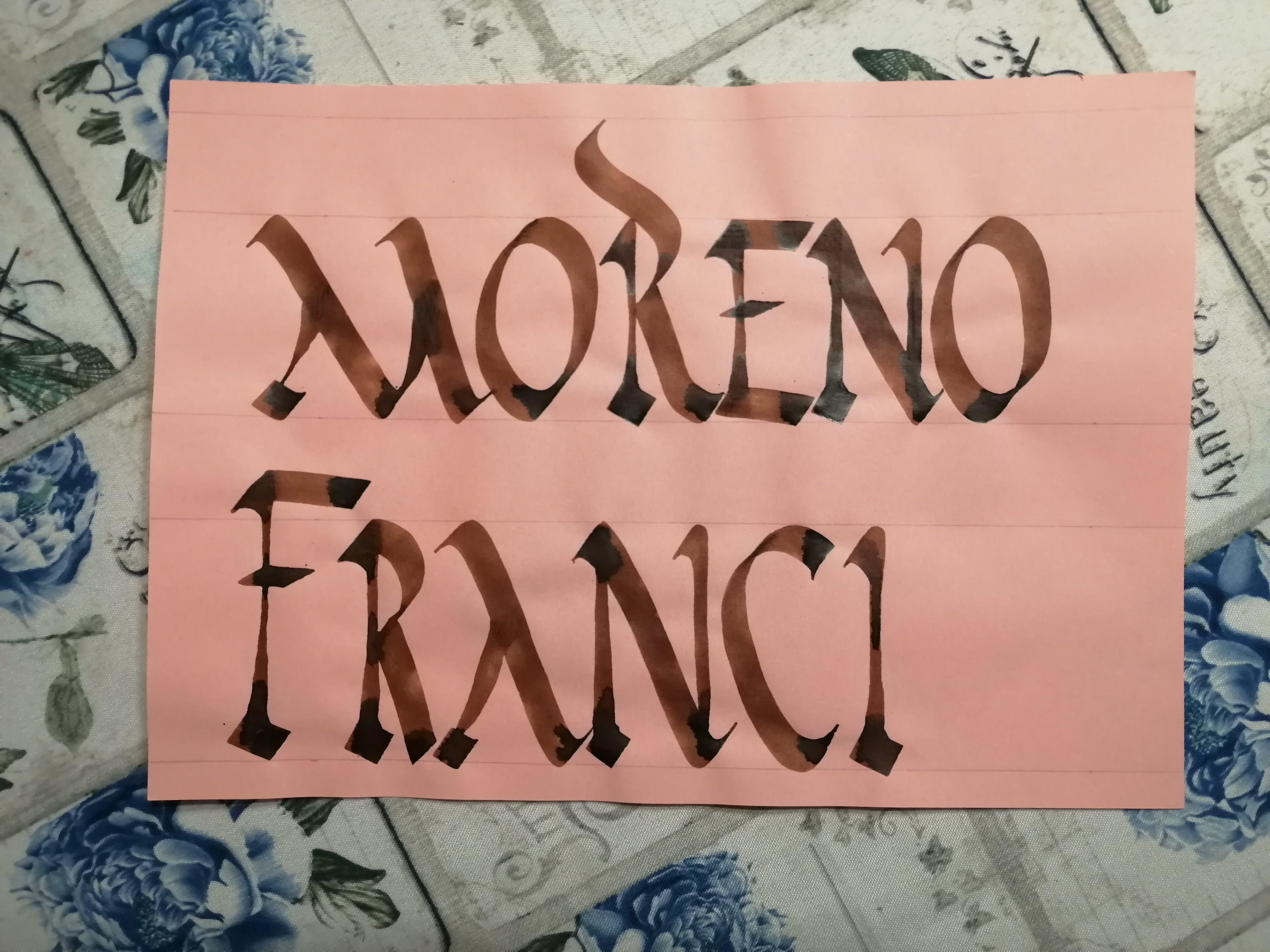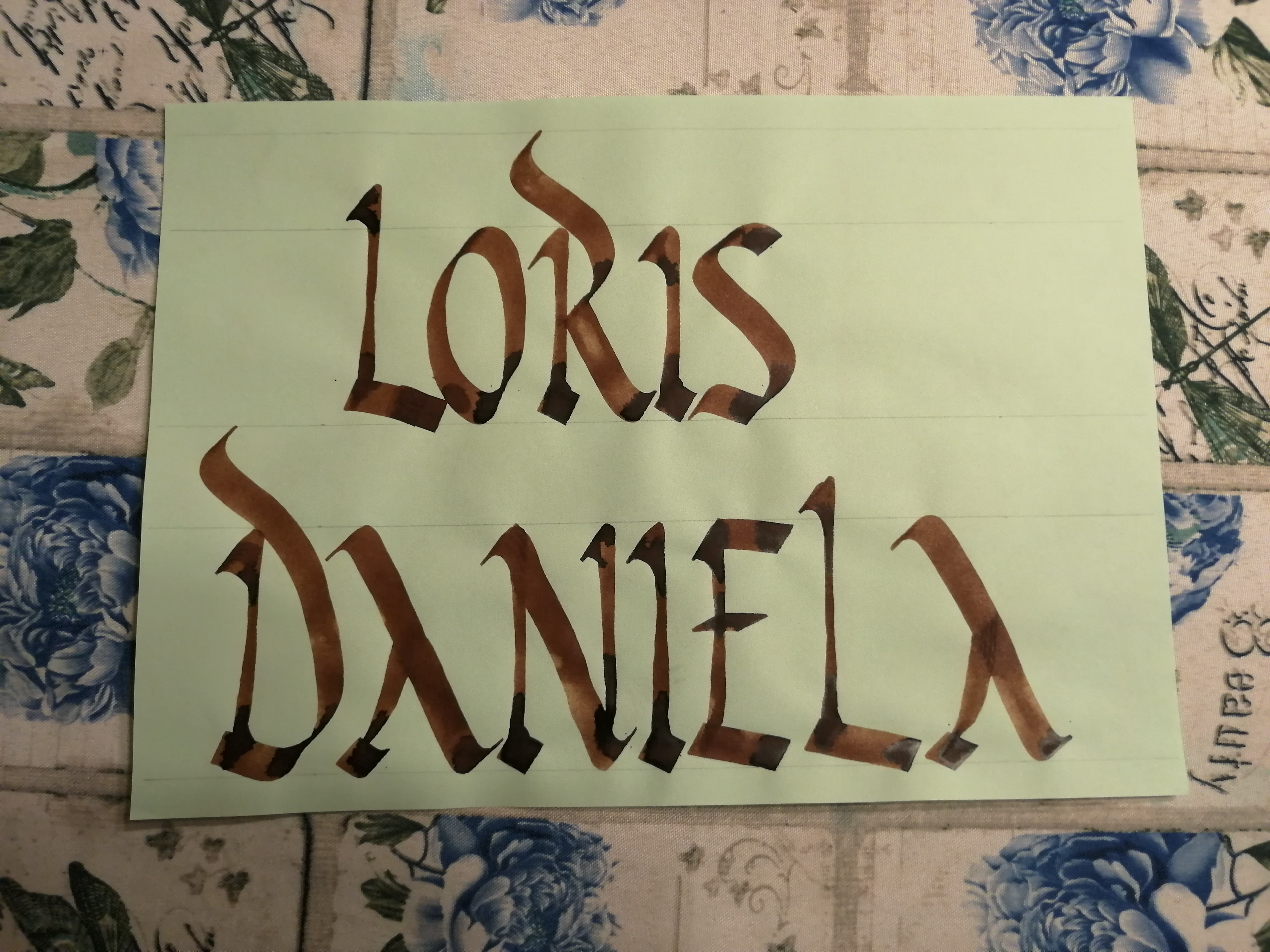 In effetti non si può dire che sia facilmente abbordabile; le aste a a stringere scendendo e poi ad allargare sullo stesso tratta sono un "bel" problema. E' anche vero che provando, con pazienza e costanza, qualcosa comincia a uscire. Tu hai notevoli capacità (osservo sempre con interesse e ammirazione i tuoi scritti e i tuoi disegni) e se volessi di sicuro potresti renderla bene. Certo, dovresti mettere da parte (almeno provvisoriamente) le tue amate stilografiche e usare strumenti a punta tronca più larga (più è stretto il pennino più difficoltosa, o invisibile, è la variazione di tratto), inoltre uno strumento senza i rebbi tipici del pennino (quindi per esempio, calamo, Automatic Pen, Parallel Pen e punte simili) rendono un poco più comoda la rotazione. In più, insistendo nelle prove, a poco a poco la scrittura rende il suo piacevole effetto. Per il momento io sono arrivato a questo punto, come vedi nell'allegato (perdona la censurabile qualità della foto, non ho la tua attrezzatura né tantomeno la tua abilità artistico-fotografica).