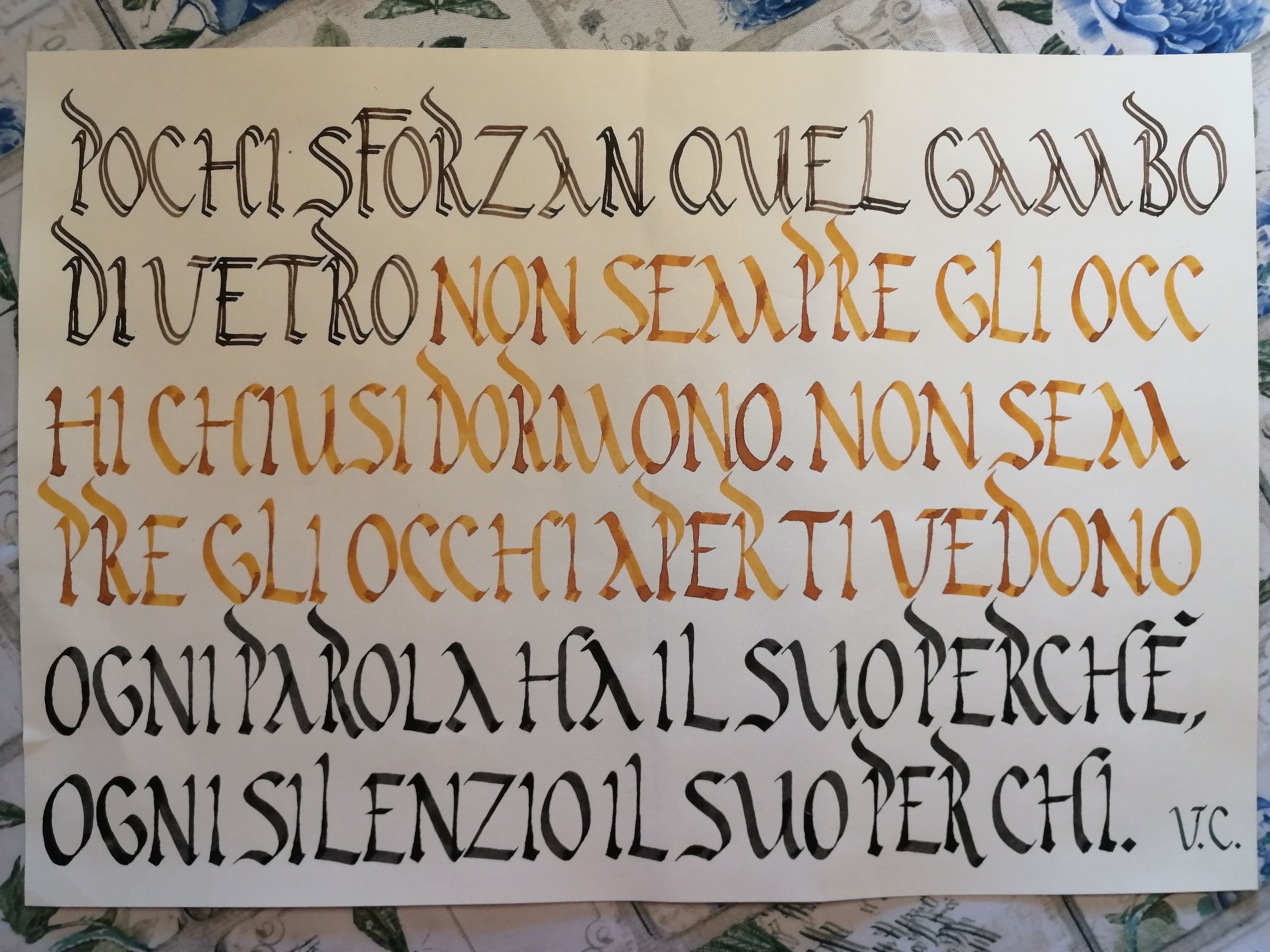 Buongiorno Dory, domenica 30 ho fatto anch'io il corso di rustica e devo ringraziarti perché, se non ricordo male, ne avevo avuto notizia proprio da un tuo post qui. Mi è piaciuto molto il corso e molto la scrittura, ma non ho ancora raggiunto il tuo livello. Ti allego l'ultima prova che ho scritto ieri( A3, Parallel per 3.8 e 2.4, carta Canson Croquis), non mi sono preoccupato molto delle rifiniture (in particolare dei piedi delle lettere) perché la misura contenuta della penna mi rende particolarmente difficoltoso il ritocco (a dir la verità anche con misure più larghe sovente i ritocchi mi vengono degli obbrobri inguardabili). Spero comunque di riuscire a migliorare.... magari approfitterò per chiederti qualche consiglio.
