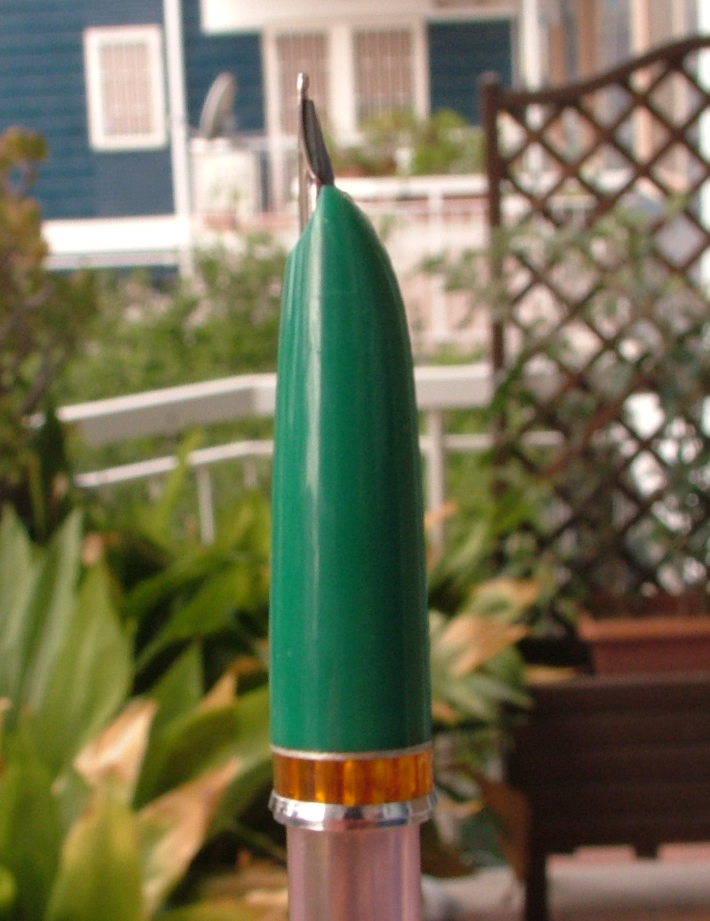 Curiosamente, il pennino in acciaio dorato, con la punta arrotondata per schiacciamento ma senza "iridio", è marcato "Wing-Flow 1 U.S.A." ...