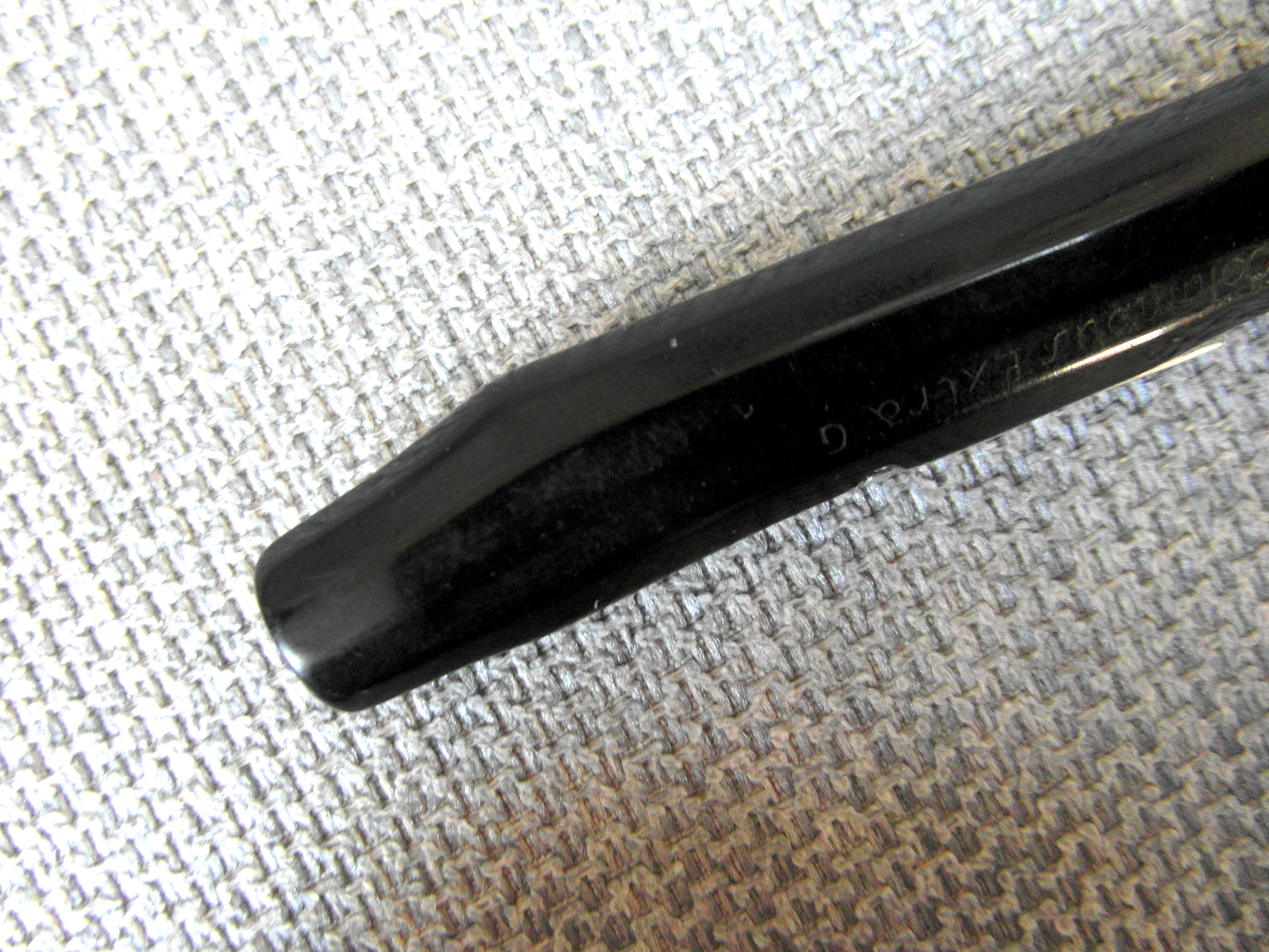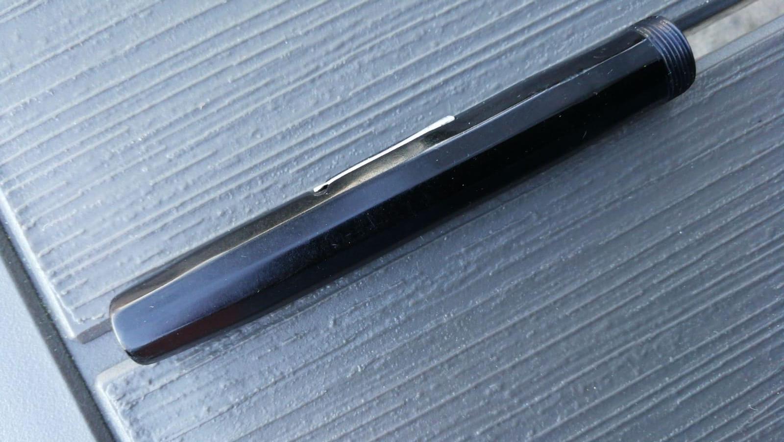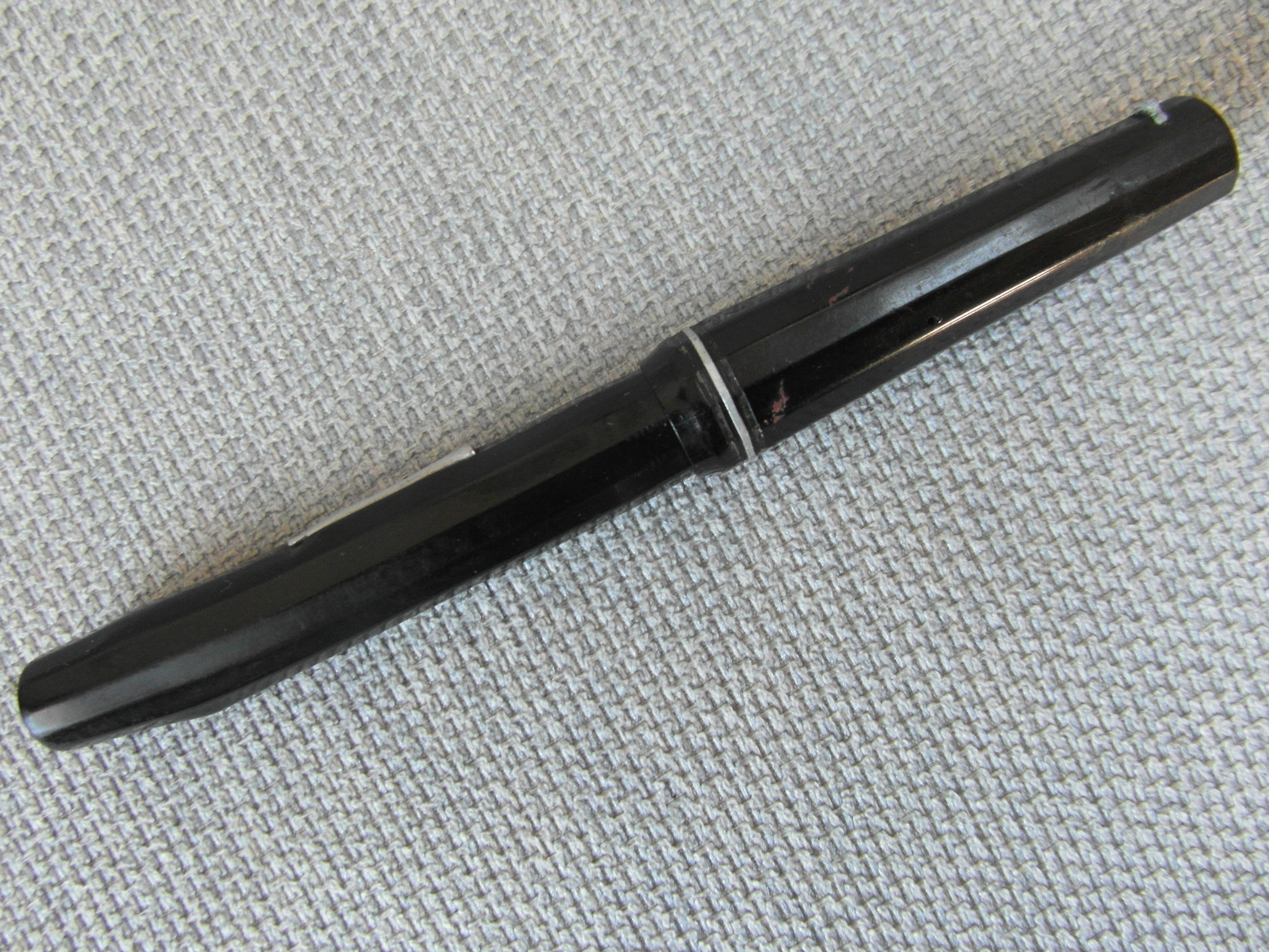 La clip spezzata alla radice, il pennino non è l'originale, l'attacco del serbatoio sul puntale è parzialmente rotto e mancano due anelli su tre. Il problema più grande è comunque la paurosa deformazione della parte terminale del corpo, che fanno somigliare la penna ad un bastone da golf.