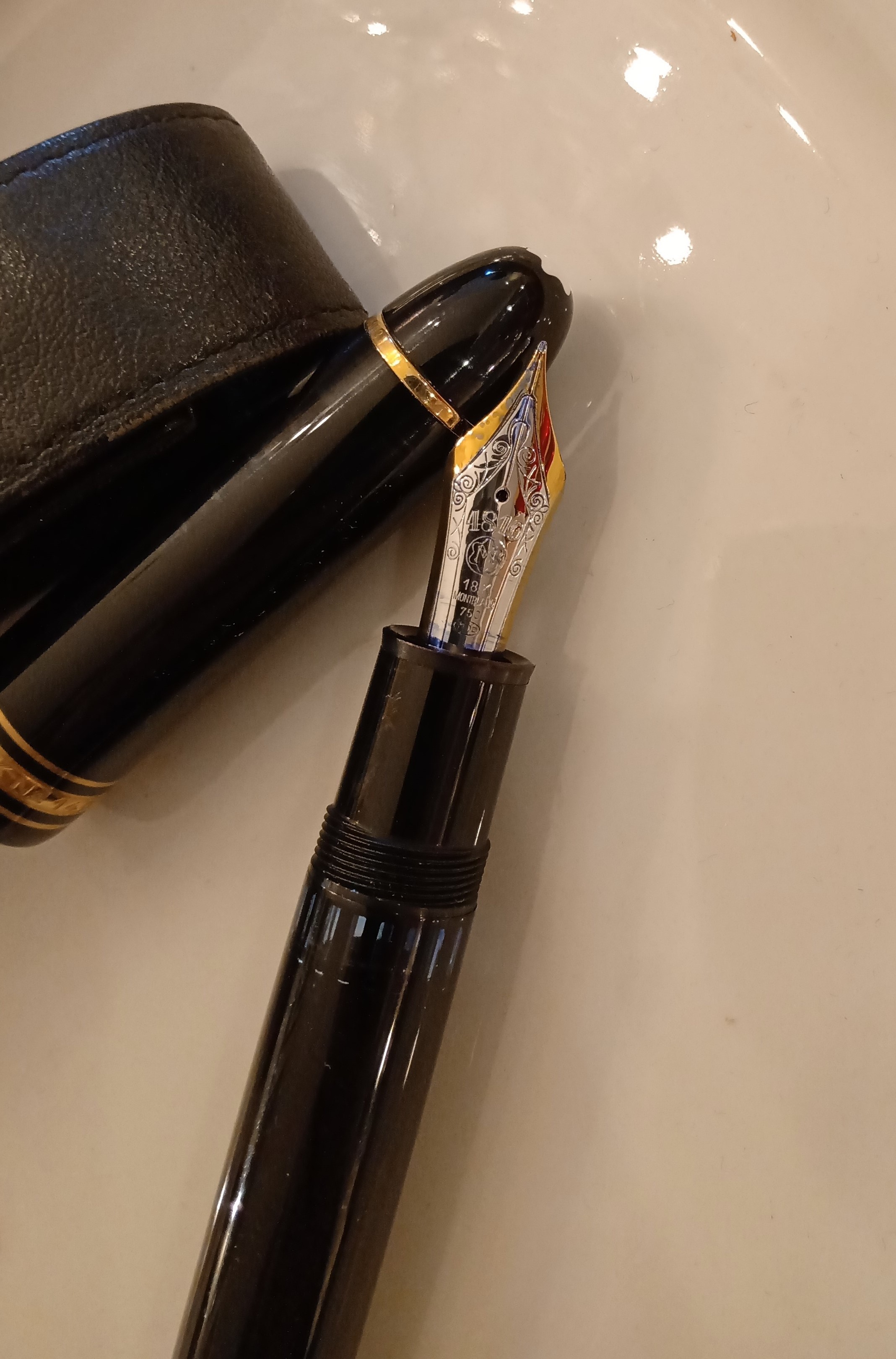Basandomi su quanto ho letto e facendo riferimento alla 149, ho cercato in rete e mi sono accorto di quanto sono imbranato, il modello è scritto sulla fascetta del cappuccio, mentre ero preso dal fotografarla ho trascurato di vedere molte altre cose, per fortuna su di uno scatto sono riuscito a vedere la scritta 149, mi resta ancora il dubbio se è una Le Grand, cosa più grave non ho nemmeno controllata che fosse a pistone anche perchè l'ho dato per scontato, ho controllato che ci fosse il numero di matricola, ma credo non sia una prova certa, sono un ingenuo e il fatto di vedere una custodia di pelle con il marchio Montblanc mi rassicura
