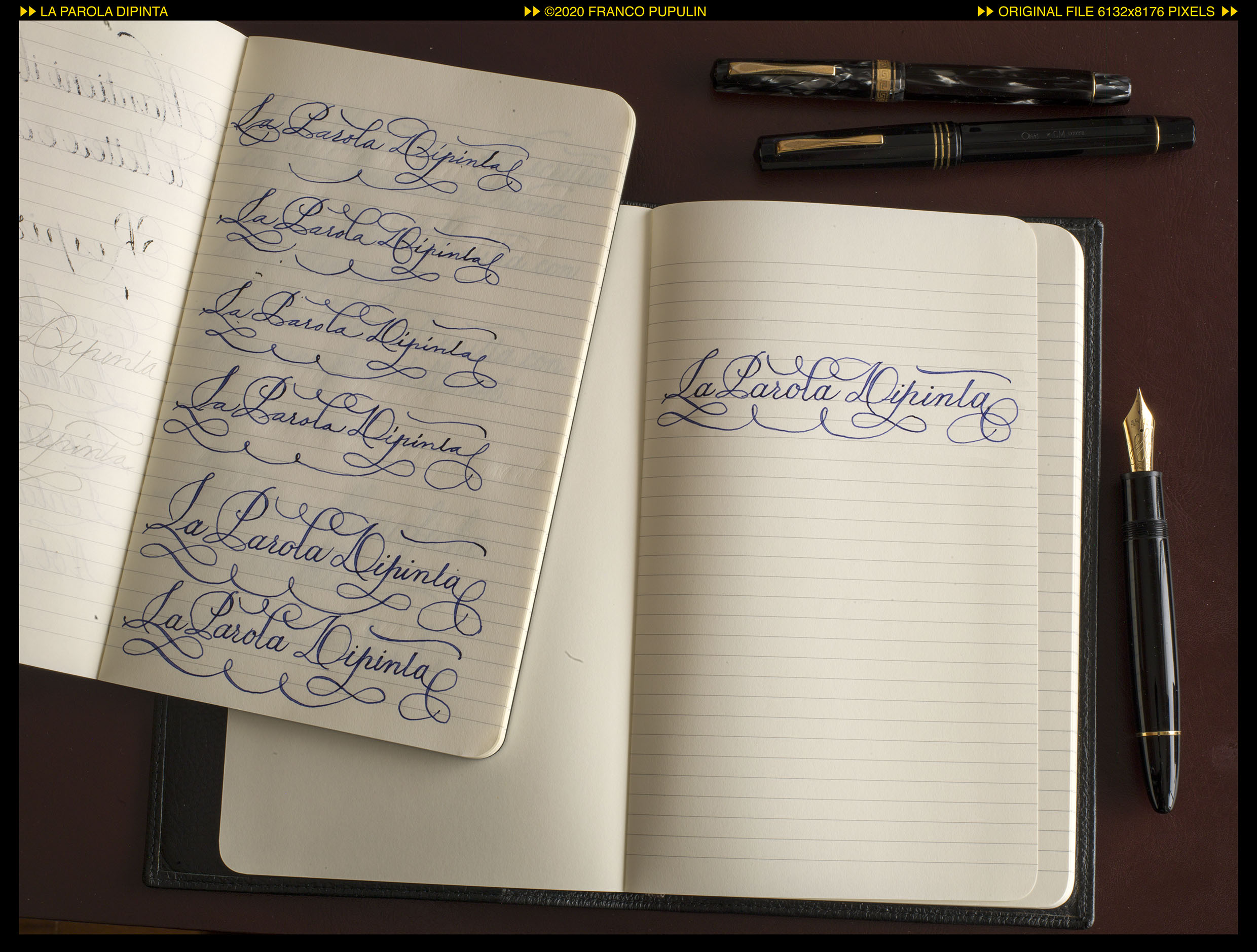 Qui volevo farvi vedere la genesi dell'ultimo titolo, "La parola dipinta". Sulla sinistra della fotografia si può vedere come nasce addirittura a matita, e poi come con l'inchiostro va prendendo forma e si perfeziona, finché mi pare pronto e allora lo scrivo, di getto, sulla prima pagina "utile" del quaderno (di solito lascio sempre una bianca").