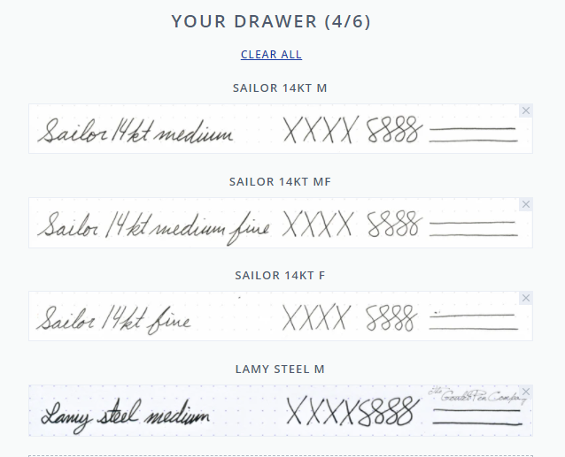 Ho avuto una 1911 Standard con punta F, una 1911 Standard con pennino M, una Pro Gear con tratto M e ora ho una Sailor Pro Gear con pennino MF. Puoi vedere delle brevi prove di scrittura tra gli annunci (già scaduti!) che ho pubblicato nel mercato quando ho ceduto le prime 3.