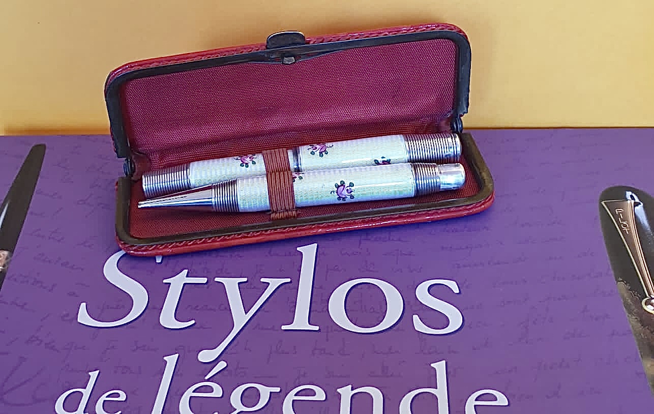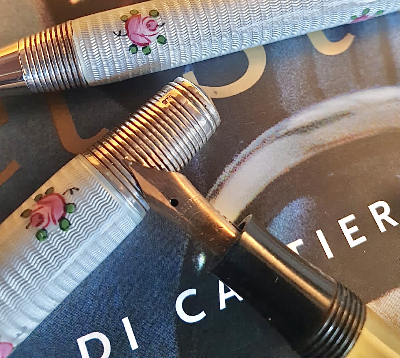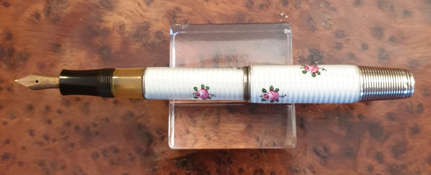Delizioso, sontuoso set in argento rivestito in smalto. Anonimo, anni ‘30. Il portamine identico al Pix Mont Blanc ed i particolari della stilografica me ne fanno attribuire all'azienda tedesca la produzione. Graditissimi chiarimenti da chi ne sa più di me.