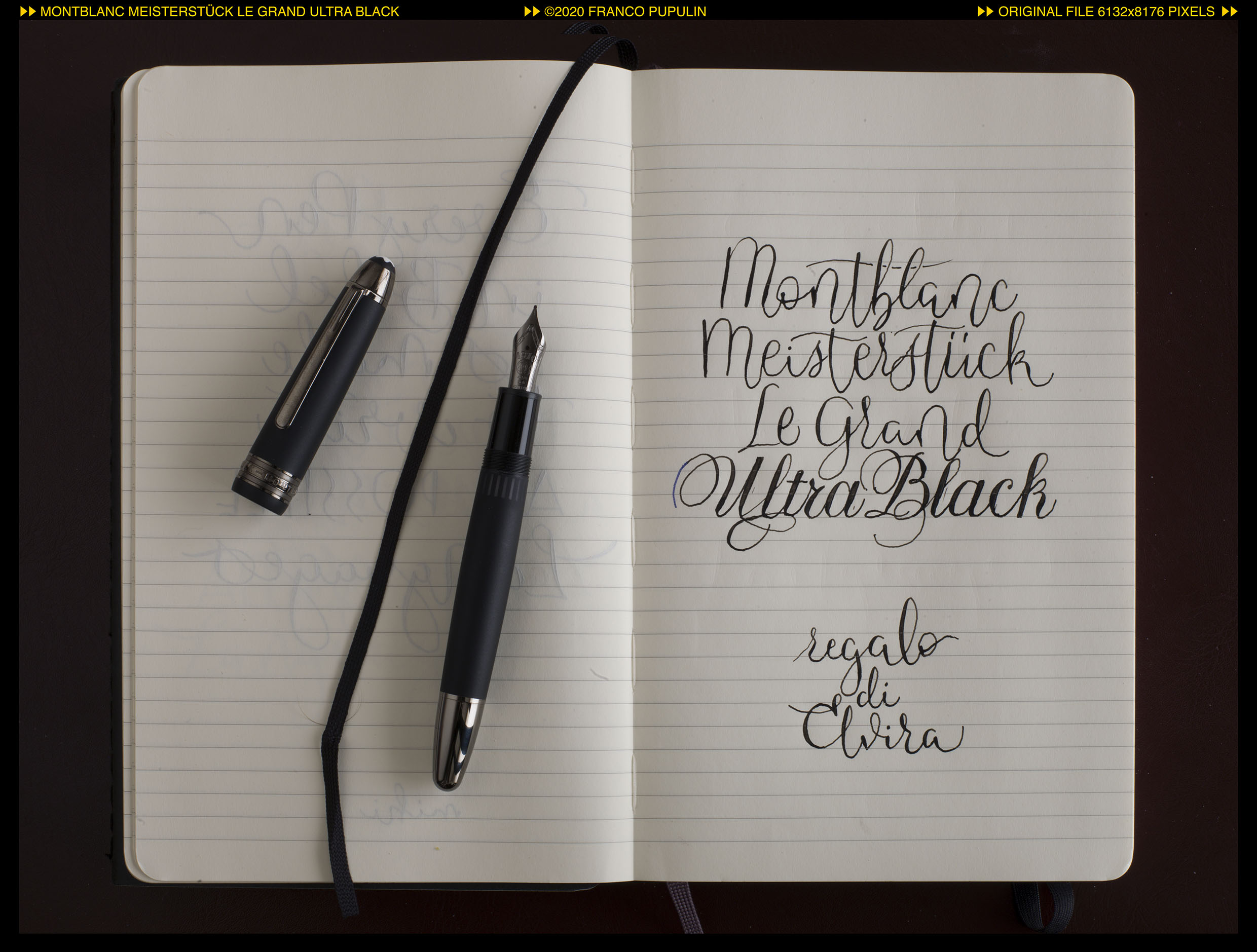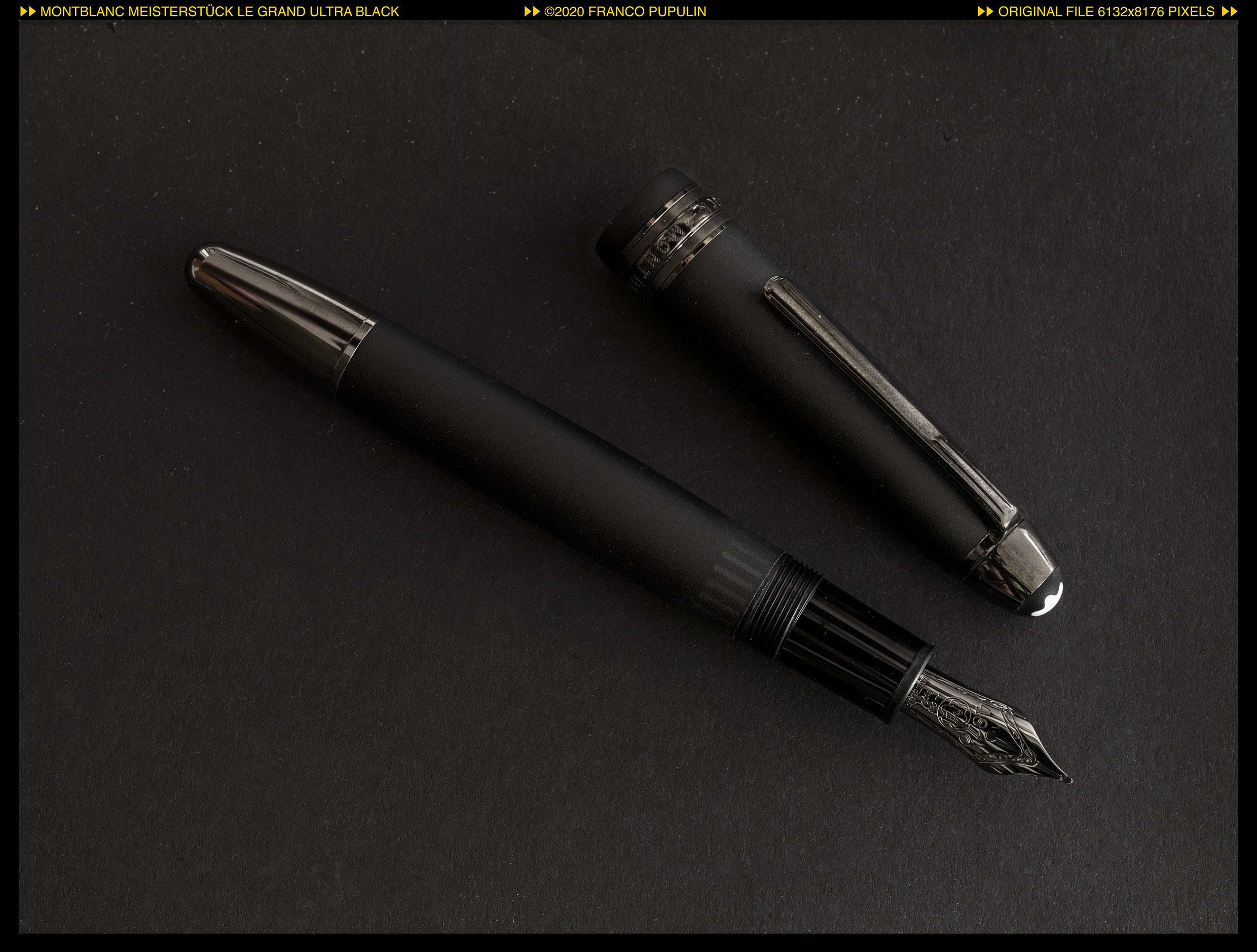 La Montblanc Meisterstück Ultra Black è stata prodotta, in edizione speciale, nel 2016. La serie comprendeva due stilografiche e due rollerball, nelle taglie Le Grand e Classica, e due penne biro nella nuova dimensione Media e nella taglia Classica. Quella che ho ricevuto io è una stilografica Meisterstück Le Grand (le dimensioni sono quelle di una 146 contemporanea). Per Edizione Speciale, Montblanc intende degli strumenti da scrittura la cui produzione non è limitata in numero, ma nel tempo. La Ultra Black, come dicevo, è stata prodotta esclusivamente nel 2016 e, a giudicare dalla rarità di queste penne sul mercato, deve essere stata venduta fulmineamente. Non mi stupisce che sia stato così.