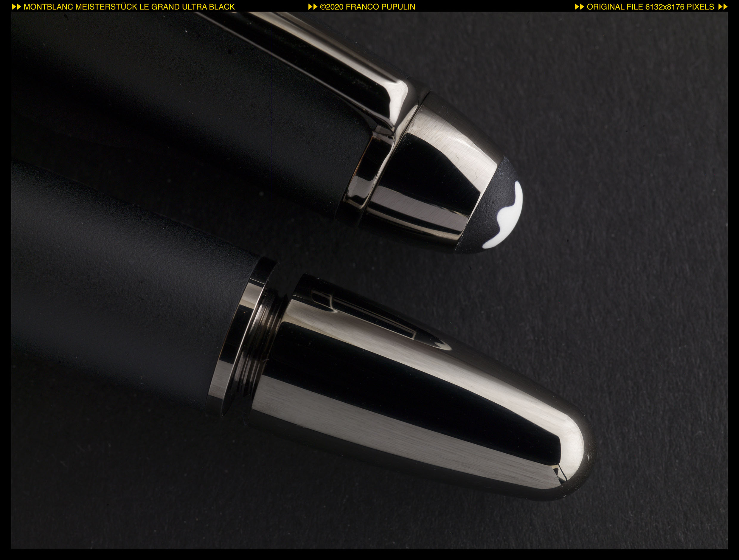 Opaca. La sabbiatura è perfetta. La resina è irriconoscibile come una classica resina “preziosa” di Montblanc. Anche osservata con una lente d’ingrandimento piuttosto potente (10x), la finitura è perfettamente uniforme, e l’effetto opaco impressionante. Il corpo e il cappuccio della Ultra Black non hanno alcun tipo di riflesso.