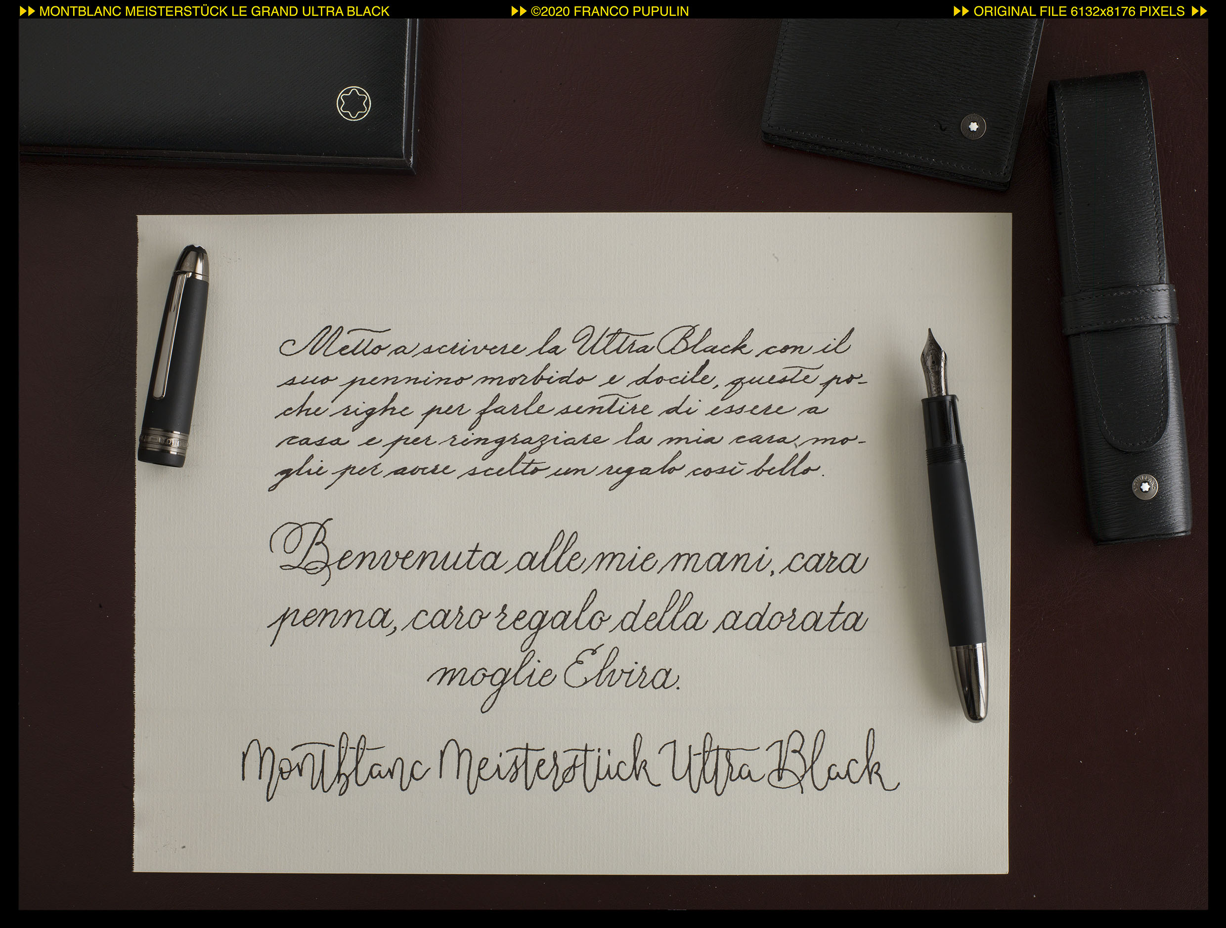 Scrittura. La penna è più pesante di una 146, in un modo che si può notare sin dalla prima presa. Il cappuccio ha un finale parzialmente metallico, e questo contribuisce al peso maggiore, ma il cappuccio è ininfluente alla scrittura per chi, come me, non lo calza per scrivere. La penna rimane però più pesante anche quando ci si limita a sostenerne il corpo: il fondello di metallo, anziché in resina, si fa sentire. Io prediligo le penne con un certo peso (vedi le mie OMAS Grand Paragon e le Montegrappa Extra), ma la Ultra Black è diversa. Nelle mie altre penne pesanti, l’aumento di peso è dato dalla sezione metallica, cosicché il peso aggiuntivo grava sulla punta. Nella Ultra Black il fondello metallico sposta invece il punto il equilibrio della penna all’indietro, rilevandolo dal pennino. La penna è, allo stesso tempo, più pesante e più leggera. Io l’ho sentita, piacevolmente, molto leggera sul pennino, che appena sfiora la carta. È una sensazione unica. Dal punto di vista del piacere della scrittura, questo dipenderà ovviamente dai gusti personali.