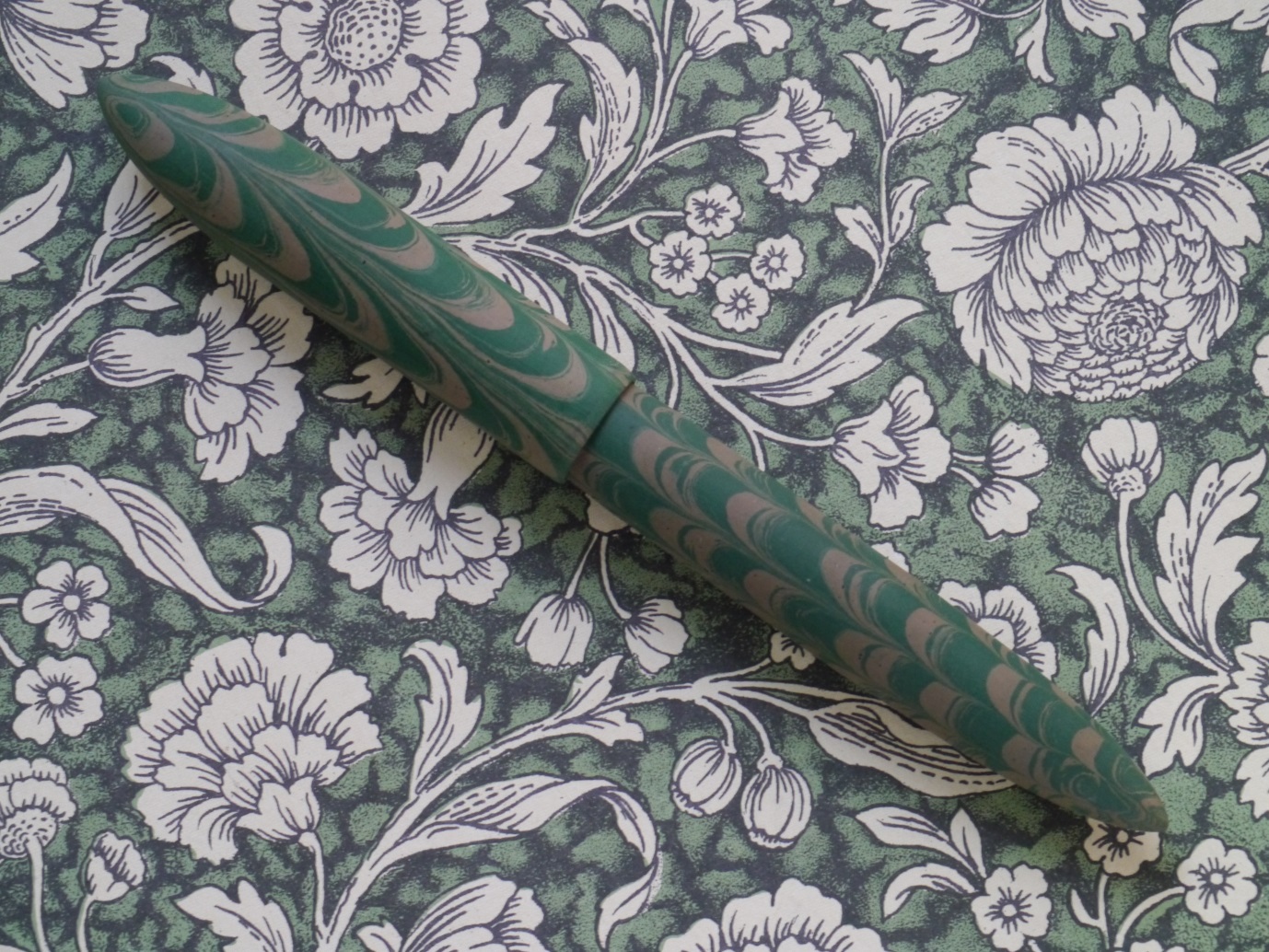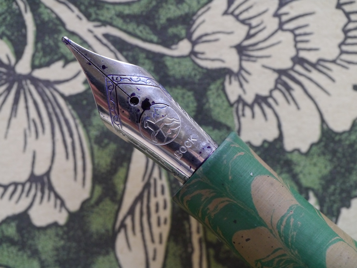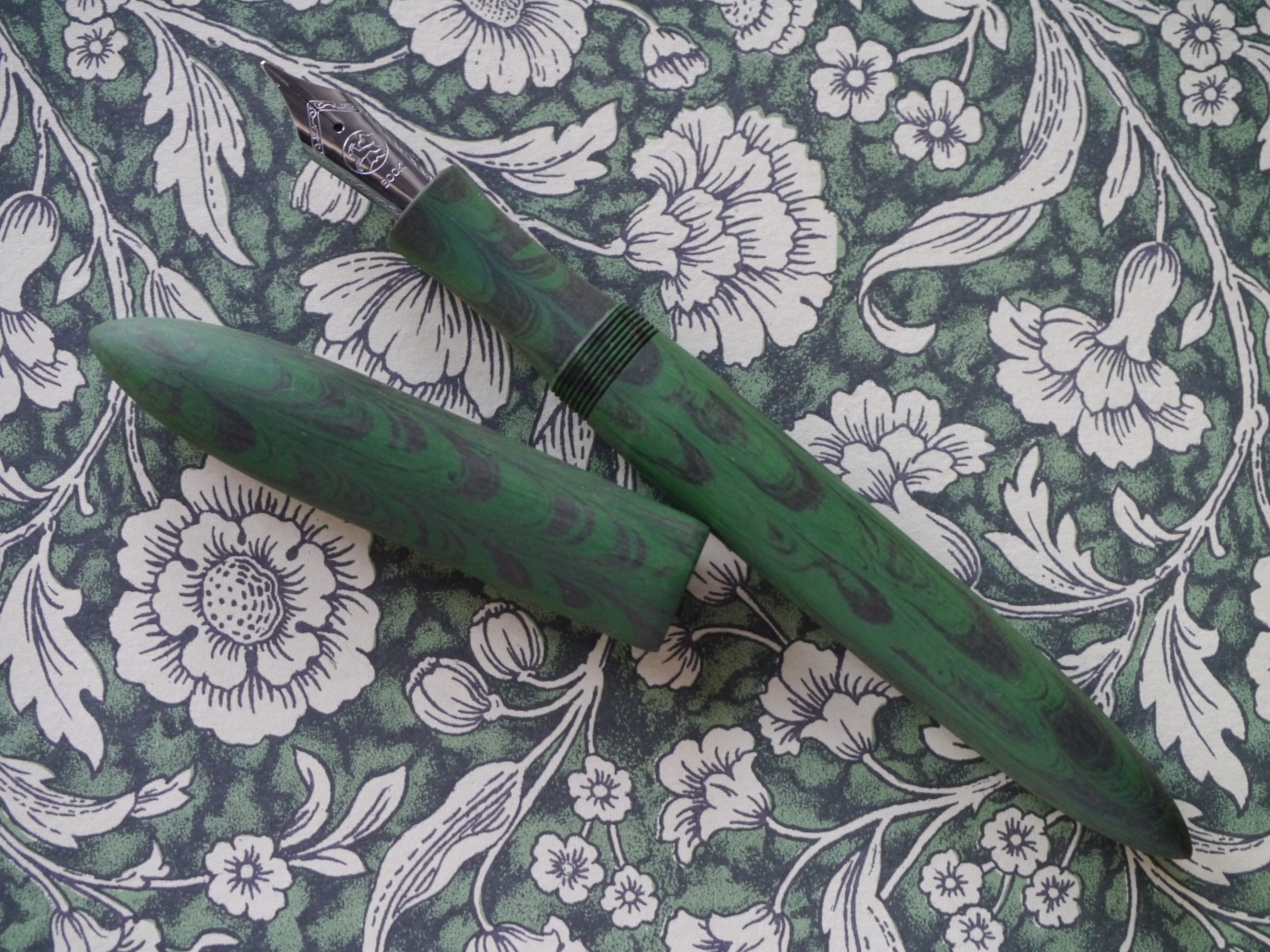 Ranga 8B regular ebanite green ripple bakul (finitura non lucidata), converter, pennino acciaio Bock B (sulla quale è stato sostituito successivamente il pennino con un Omas 14k, orfano della versione più grande della Bologna, che non ricordo se si chiamasse Portico.)