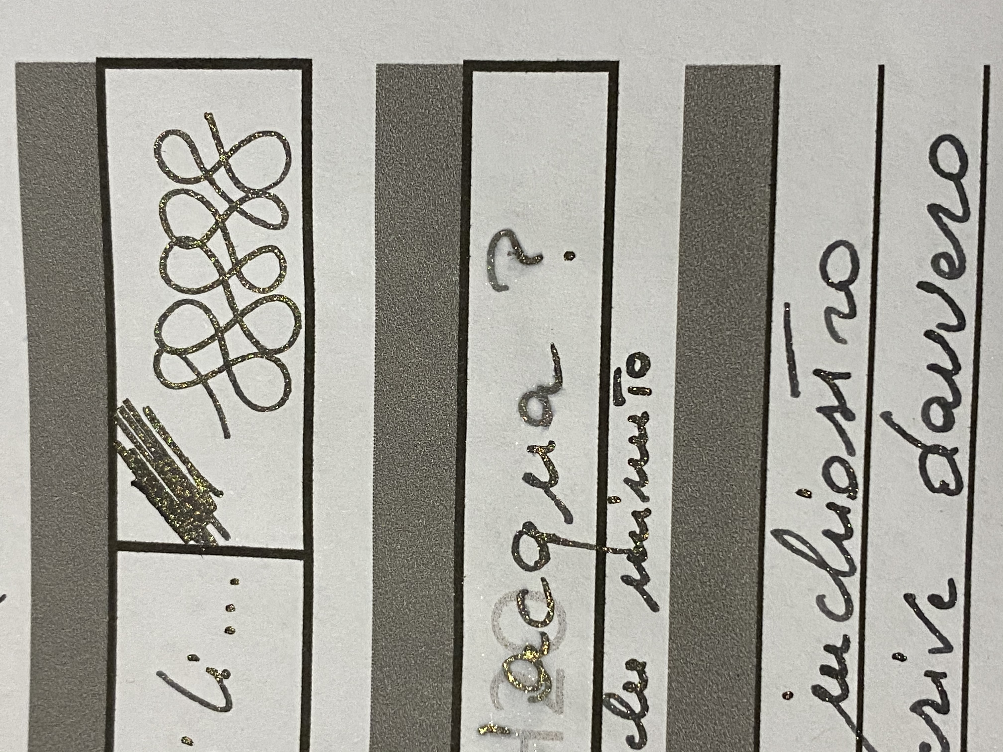 Allego la scansione del modulo, ma devo dire che non rende del tutto giustizia alla bellezza dell'inchiostro. Una precisazione sulla prova dell'acqua, nel primo caso, a sx, ho fatto cadere delle gocce subito dopo aver scritto, mentre nel secondo, a dx, ho prima atteso qualche minuto prima di bagnare il testo. In entrambi i casi, pur non avendo trovato indicazioni se sia o meno un waterproof, direi che alla prova dei fatti si comporta molto bene. Sulla Lamy2000 con pennino F scorre che è una bellezza, ma forse il suo utilizzo più indicato, visto il piacevole effetto dorato, potrebbe essere quello con pennini più generosi. Per meglio apprezzarne l'effetto, consiglio di vedere qualche video di prova.