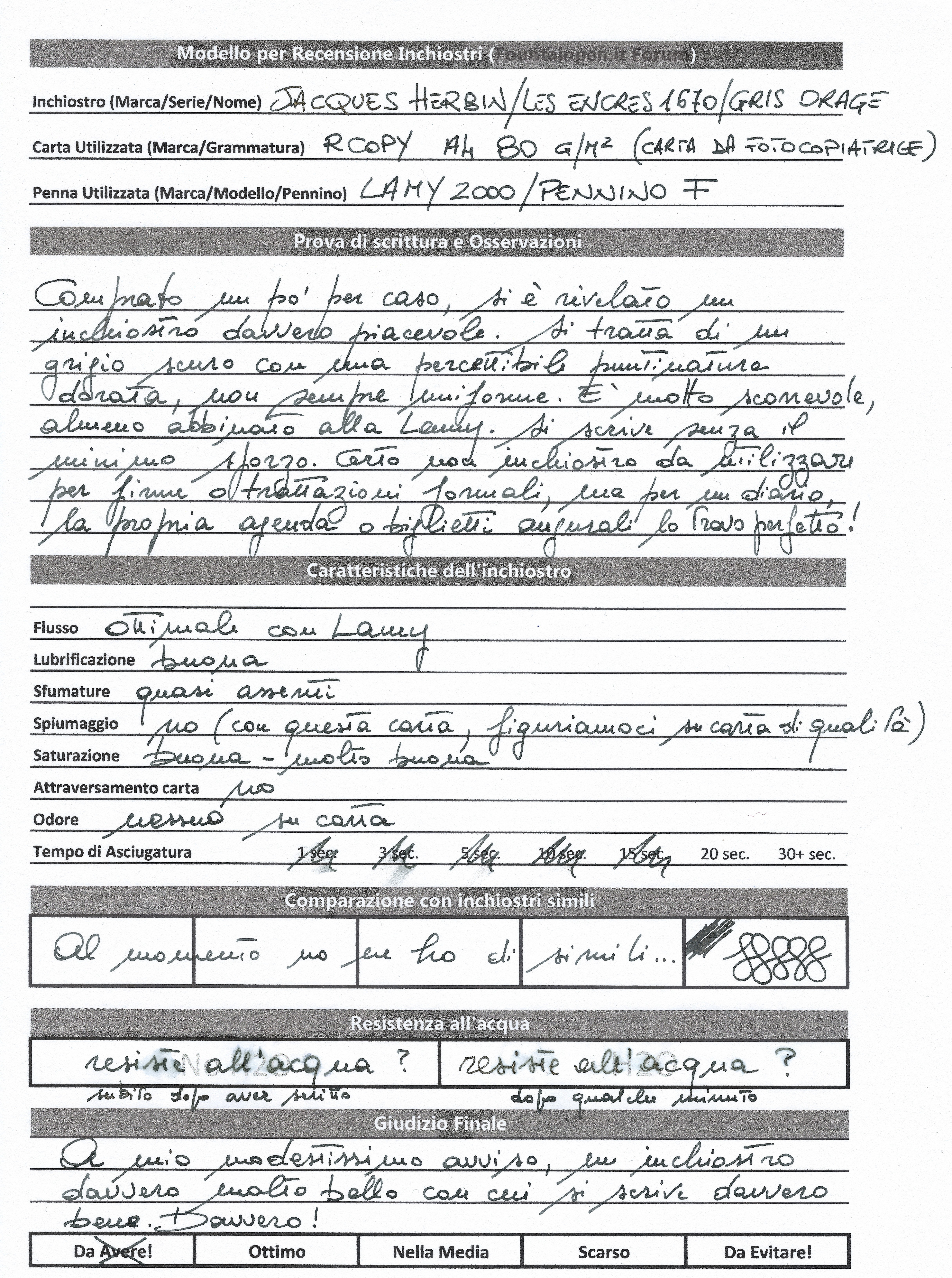 Allego la scansione del modulo, ma devo dire che non rende del tutto giustizia alla bellezza dell'inchiostro. Una precisazione sulla prova dell'acqua, nel primo caso, a sx, ho fatto cadere delle gocce subito dopo aver scritto, mentre nel secondo, a dx, ho prima atteso qualche minuto prima di bagnare il testo. In entrambi i casi, pur non avendo trovato indicazioni se sia o meno un waterproof, direi che alla prova dei fatti si comporta molto bene. Sulla Lamy2000 con pennino F scorre che è una bellezza, ma forse il suo utilizzo più indicato, visto il piacevole effetto dorato, potrebbe essere quello con pennini più generosi. Per meglio apprezzarne l'effetto, consiglio di vedere qualche video di prova.