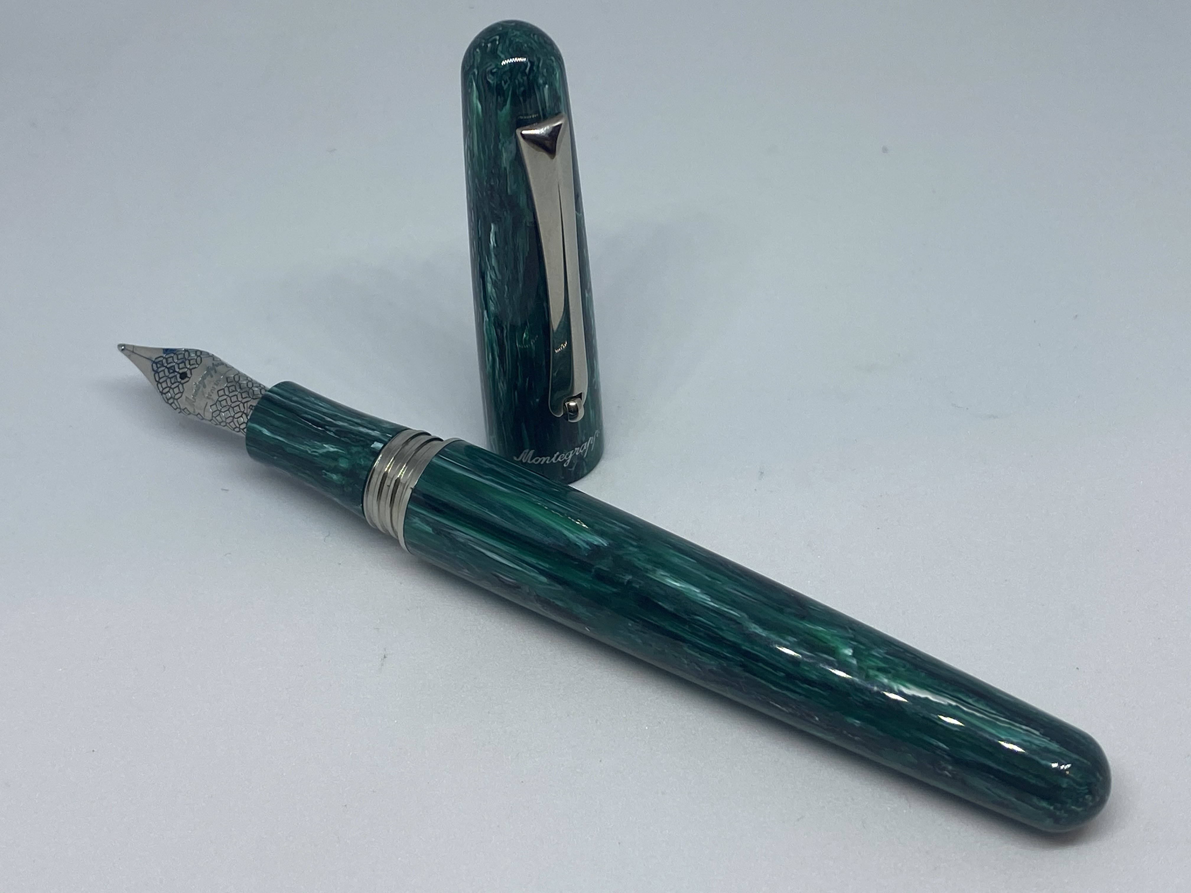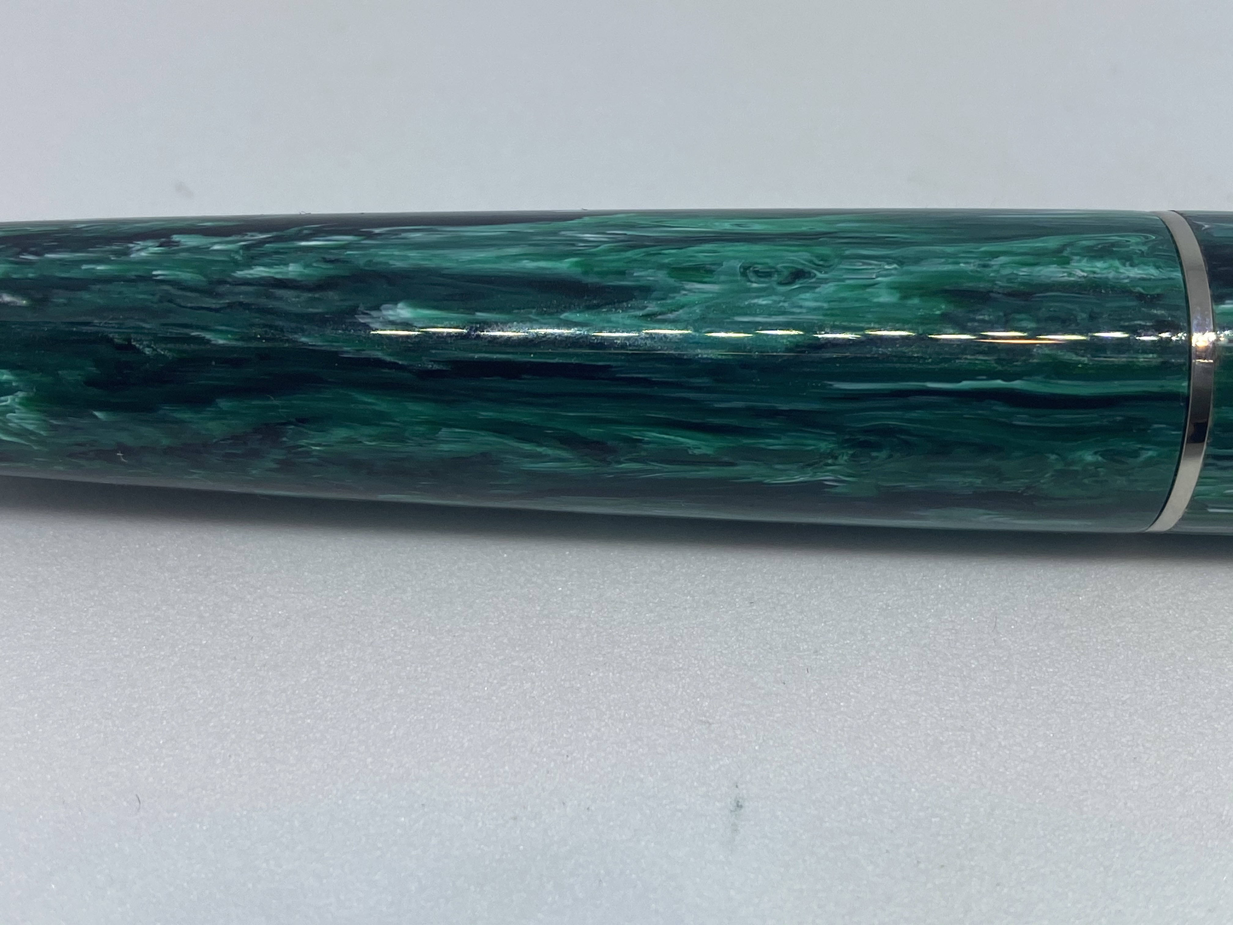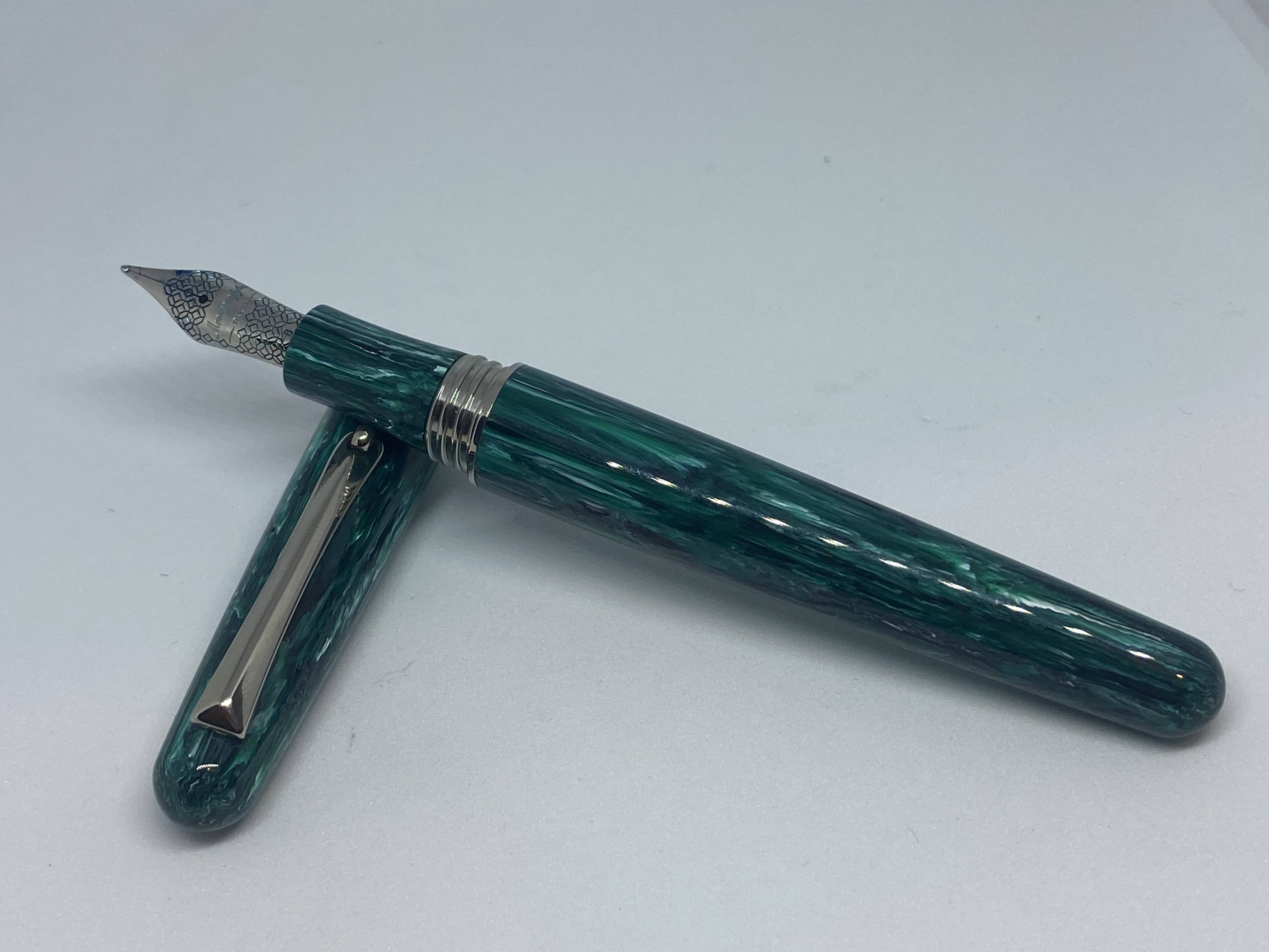La Elmo 01, è una penna semplice ed efficiente, ed è da questo che si vede il legame con l’Ing. Helm, da cui viene proprio la denominazione Elmo, che si ispirò ai dettami della scuola Bauhaus e del movimento modernista nelle sue realizzazioni. La penna ha delle linee molto pulite, è di taglia media, usa un buon gruppo di scrittura in acciaio JoWo ed implementa un efficace sistema di ricarica a cartuccia/converter. Personalmente era da molto che puntavo ad una Elmo, poi questa edizione limitata con una delle nuove resine note come Montegrappite, mi ha fatto decidere all’acquisto. La versione specifica è la Elmo Chrysocolla, prodotta in soli 300 esemplari per un eShop statunitense. Tra le nuove resine Montegrappite trovo che sia una delle più belle, finora l'avevo vista usata precedentemente solo su una versione speciale della Mia.