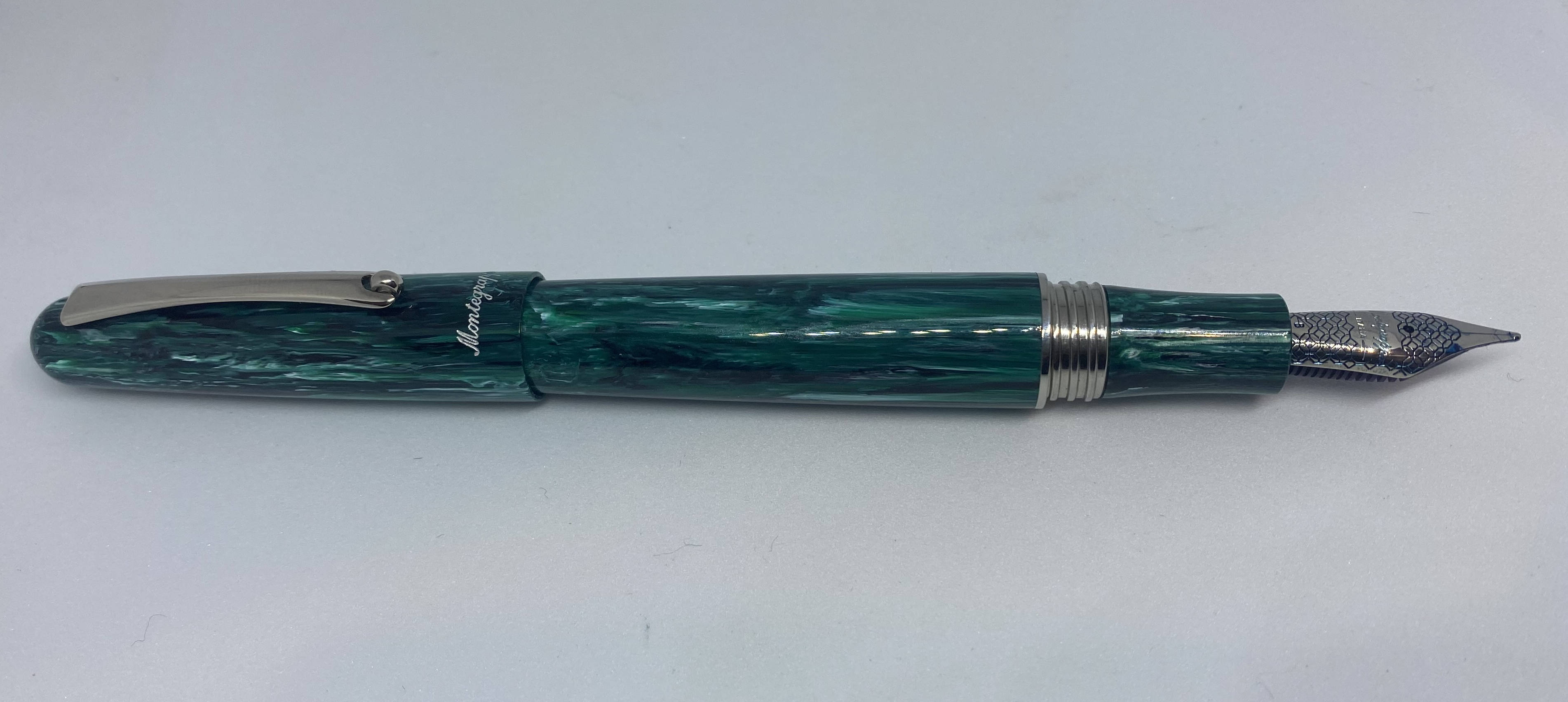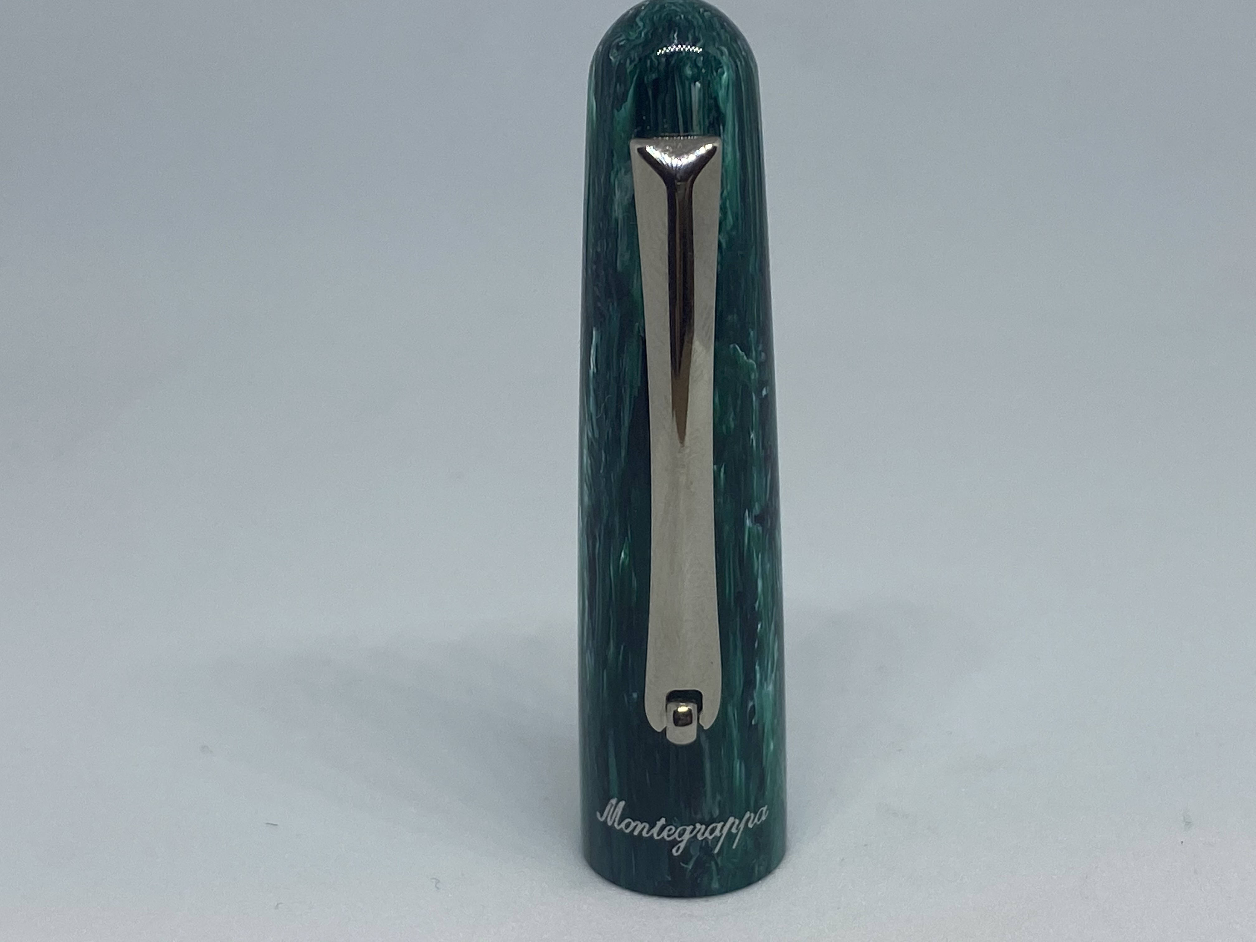 La scritta Montegrappa alla base del cappuccio è incisa nella resina ed e l’altro elemento che caratterizza questa penna.