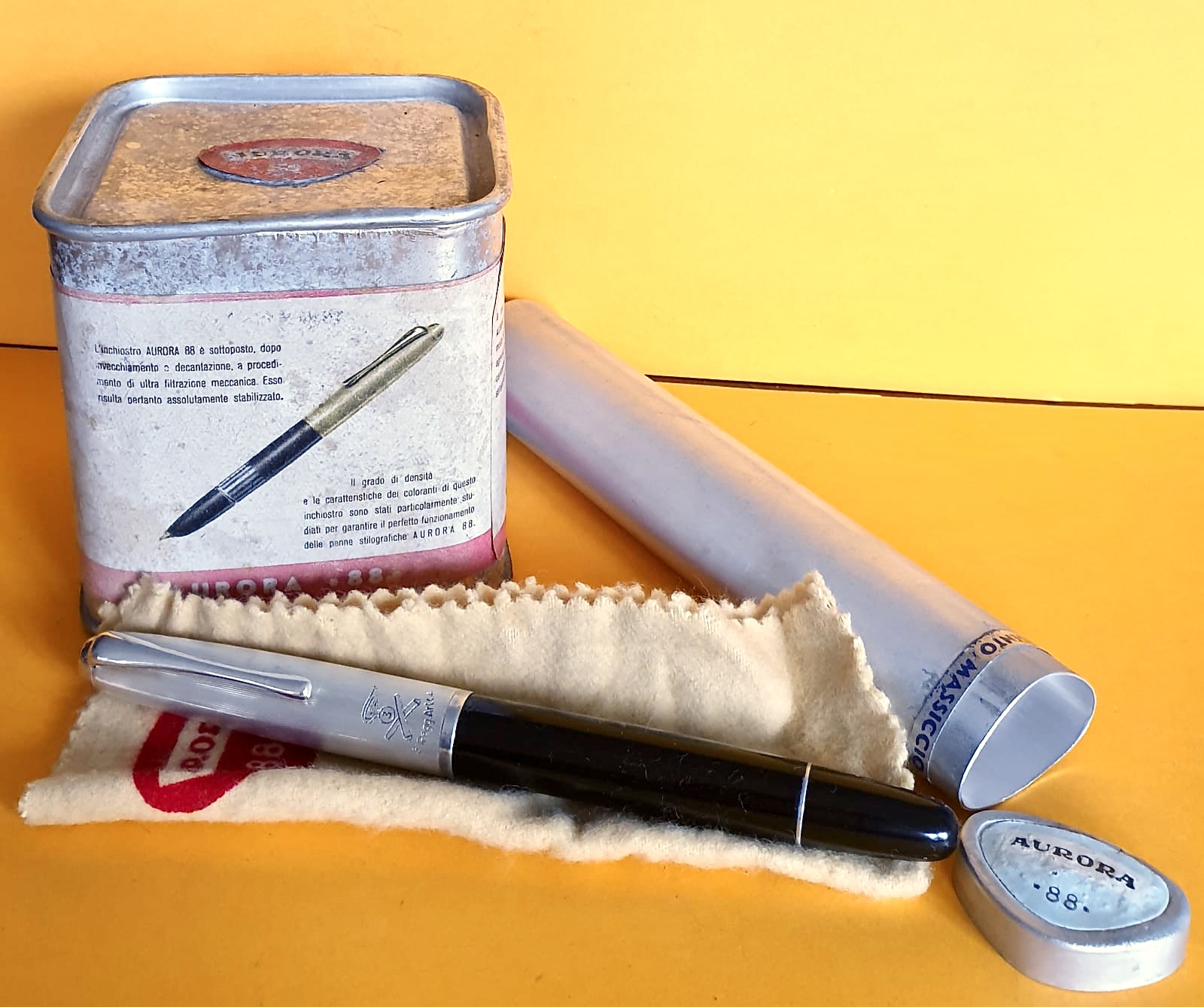 Bella Aurora 88, cappuccio arg. 925, con contenitore in alluminio per boccetta inchiostro rosso in vetro.