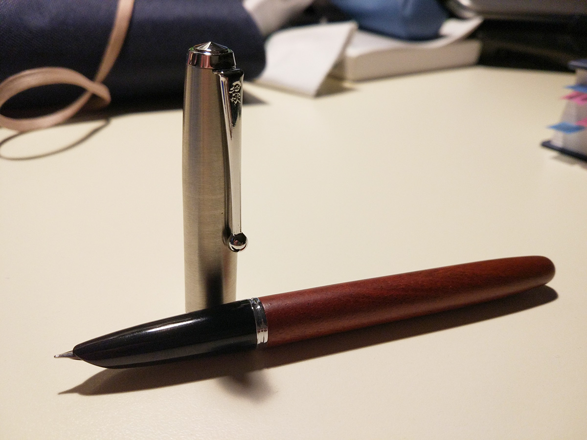 Mi sto invece trovando bene con la Jinhao 51a (versione con pennino coperto, fusto in simil legno, ma soprattutto filettatura metallica e non in plastica). Pagata una sciocchezza (con tanto di converter incluso), scrive bene (tratto una via di mezzo tra il fine e il medio), 0 false partenze e impuntamenti. Fa anche la sua figura... (è una delle varie imitazioni della Parker 51).