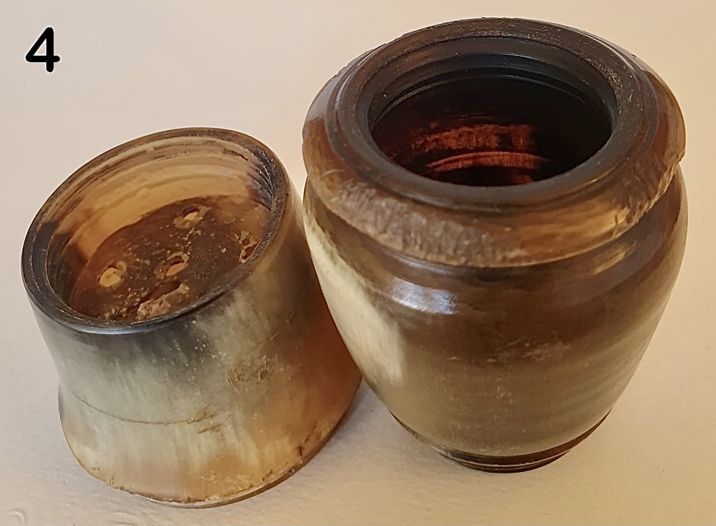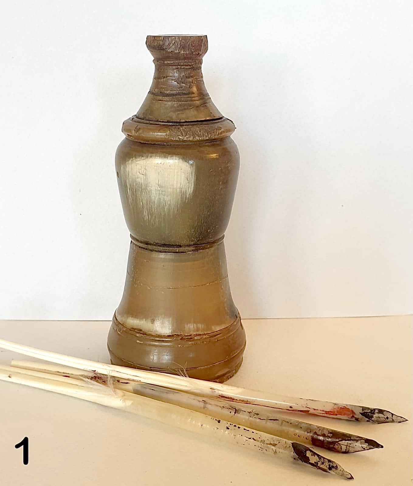 Un'altra delle mie "star" uniche! Foto 1: cinque/seicentesco penner in corno, da cintura. Foto 2: nel dettaglio, da sinistra: porta pennini d'oca (vedi foto 7), sandracchiera, calamaio, coperchio. Foto 3: sandracchiera. Foto 4: sandracchiera e calamaio. Foto 5: dettaglio del coperchio con la gola sede del mancante laccio per cintura. Foto 6: una confezione originale di penne d'oca. Foto 7: confezione di pennini d’oca. Foto 8: stupendo cinquecentesco, coltellino in avorio, argento ed acciaio, proveniente da casa dei nonni, a Montagnana.