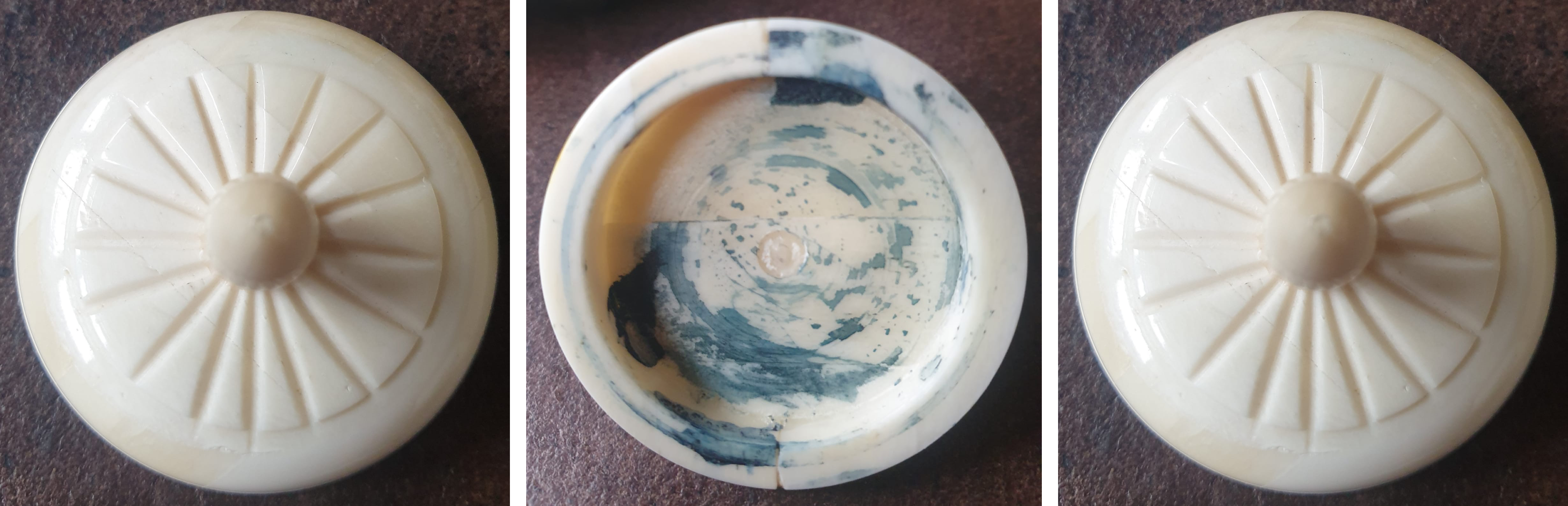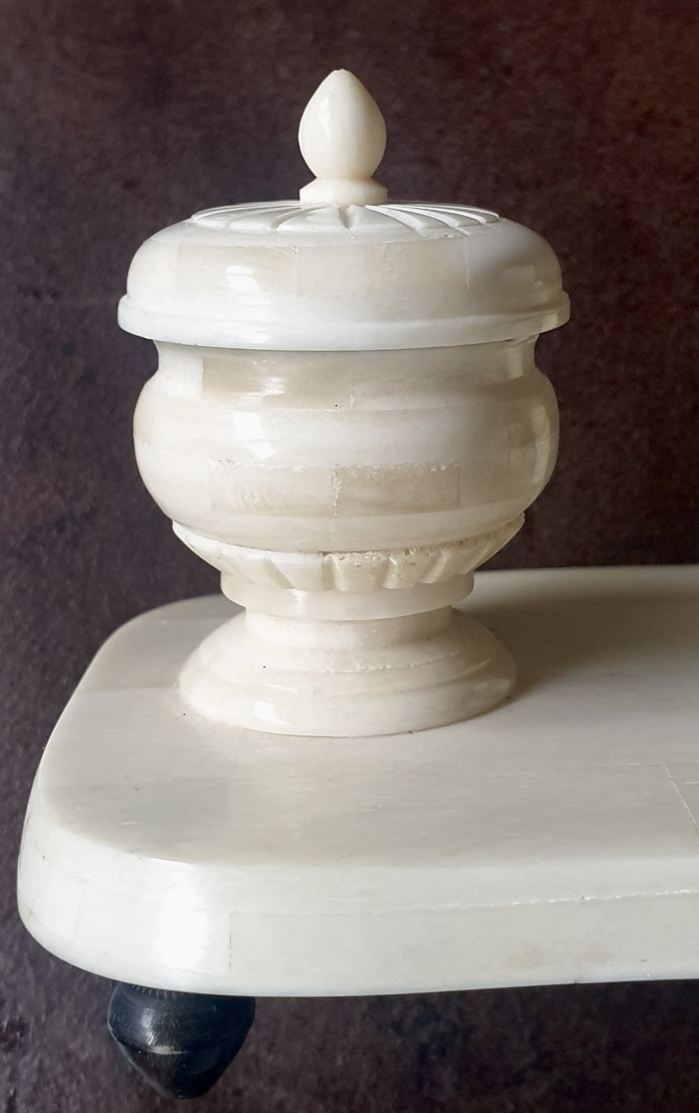 Set da scrivania in osso di bufalo d'acqua, composto da un alloggiamento per la penna e due calamai, completi ciascuno di bicchierino in ottone fissato all’osso con un perno e chiusi da coperchi incisi con motivo a spicchi.