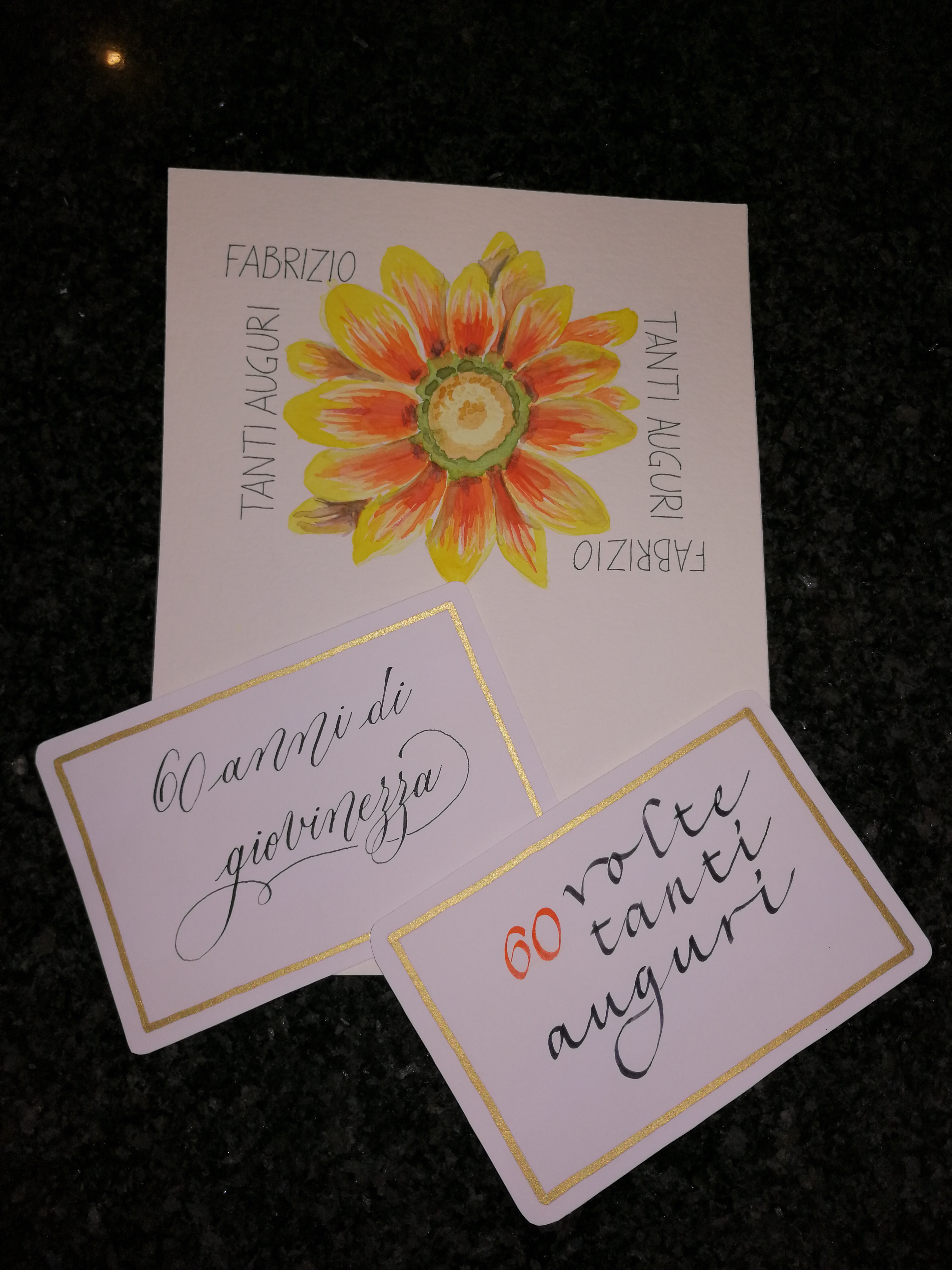 Ho fatto questo set di etichette e biglietto per un compleanno. Il disegno é fatto ad acquerello (ho finito le sei lezioni di un corso base), le scritte con inchiostro ferrogallico, l'oro é un pennarello della pentel.