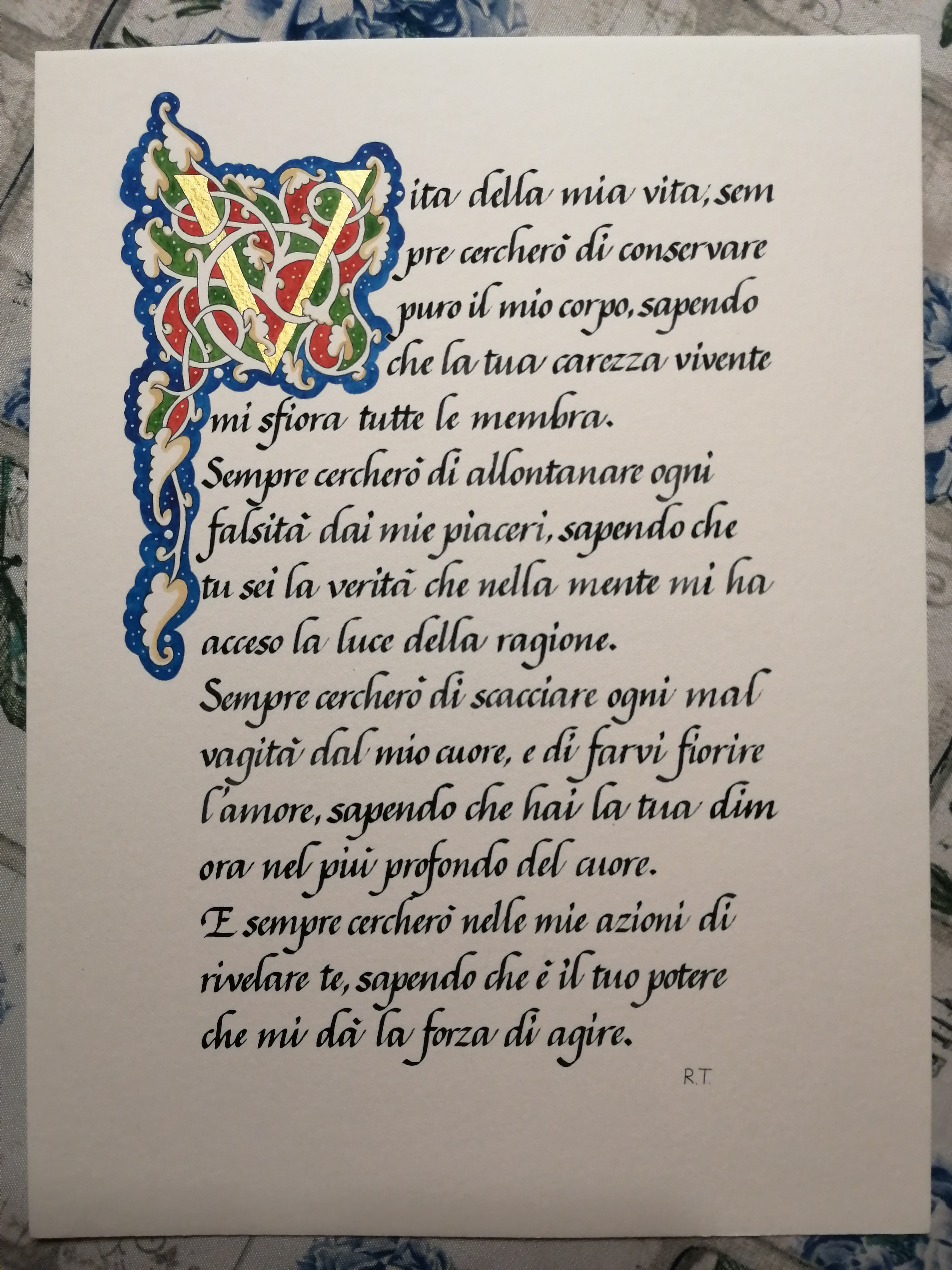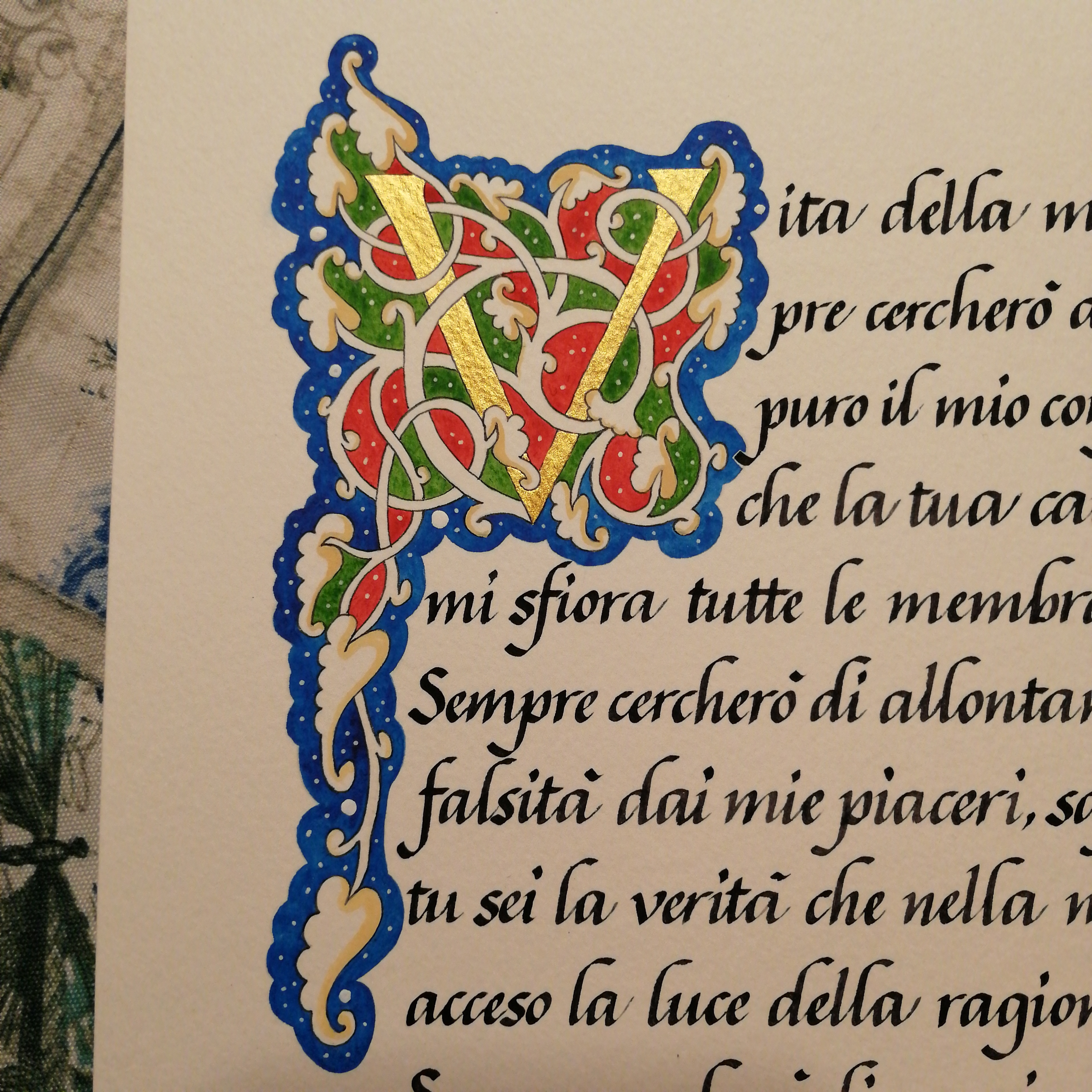 Riprovato con lo stile manoscritto. Questa volta il capolettera é tipo Bianchigirari. Il pennino usato é un Tape 1,5 che é leggermente troppo grande per l'interlinea scelta, ma mi sono accorta di aver preso il pennino sbagliato dopo la prima riga e ho temuto che cambiandolo si sarebbe notato.