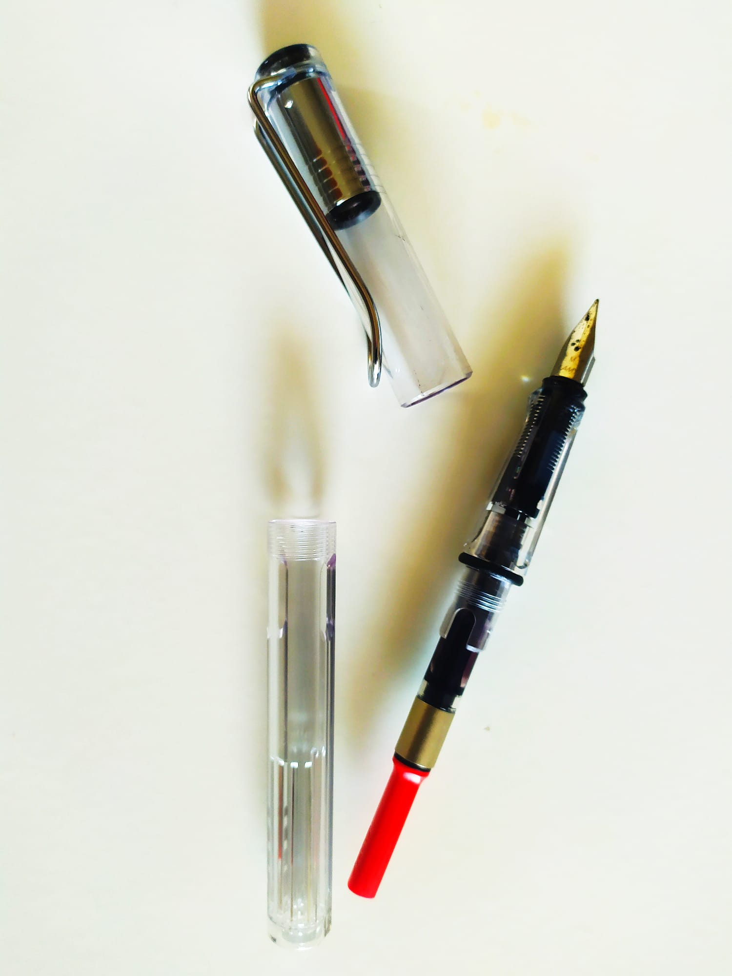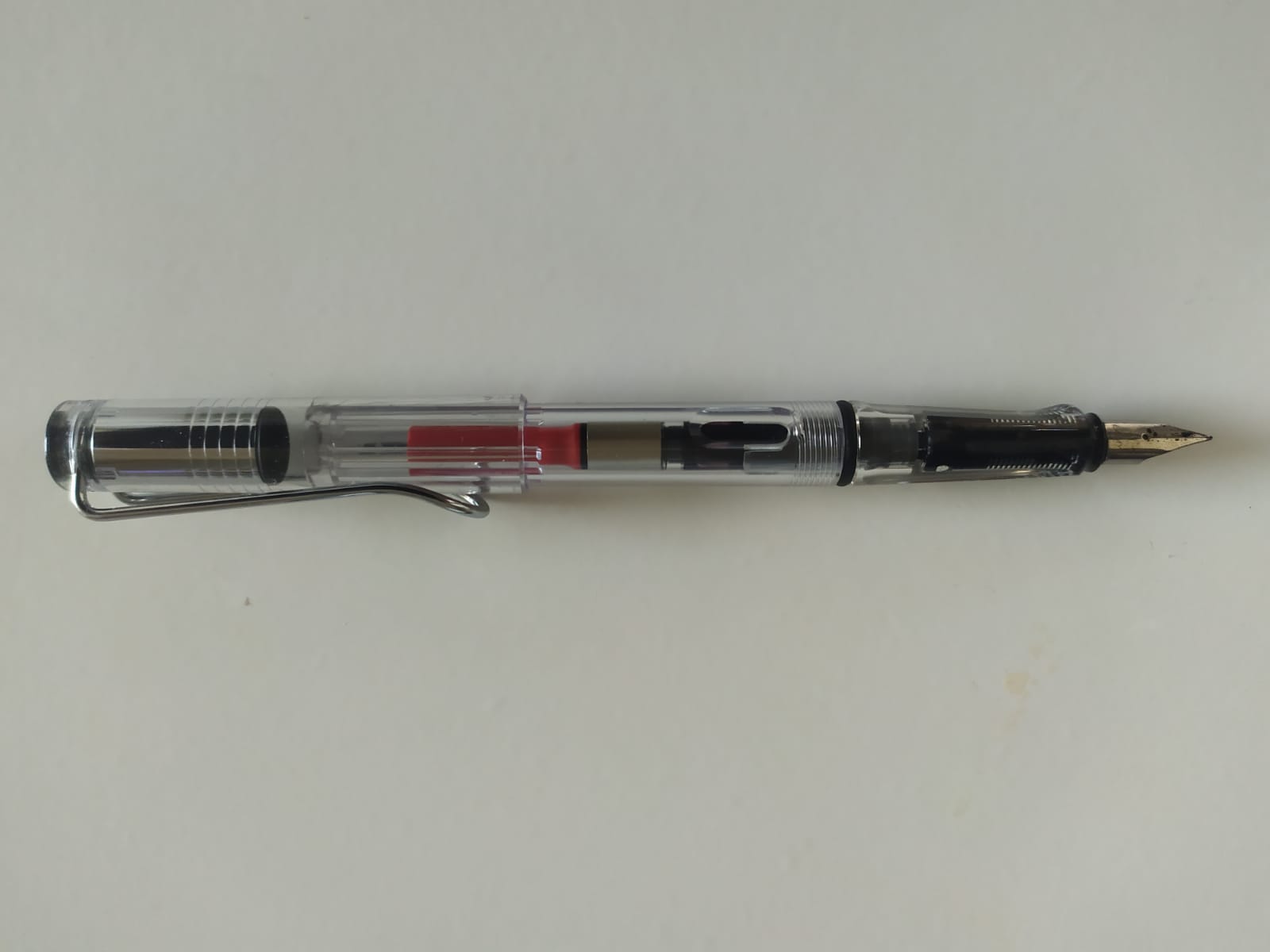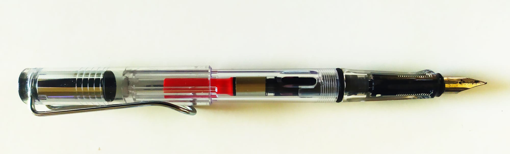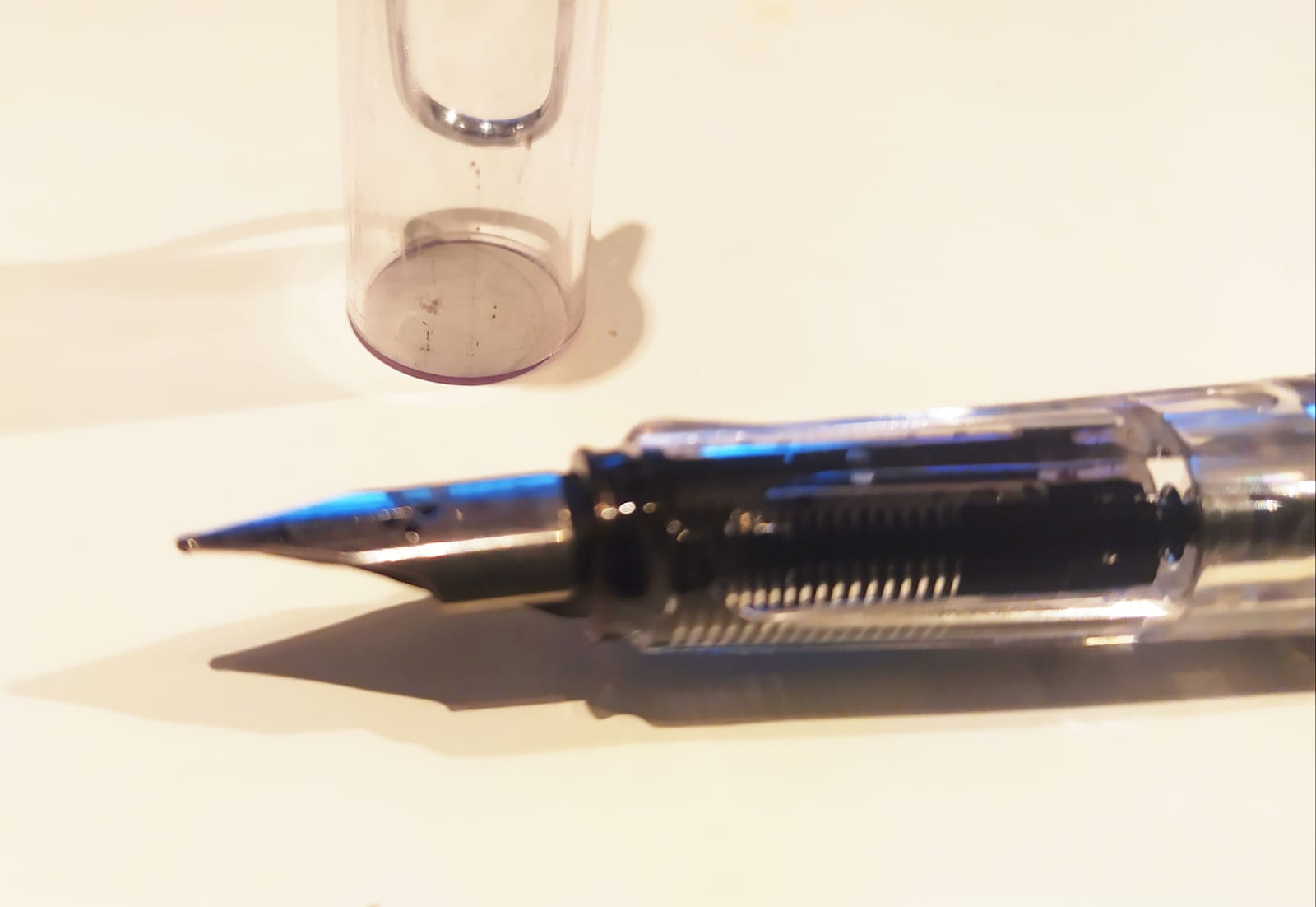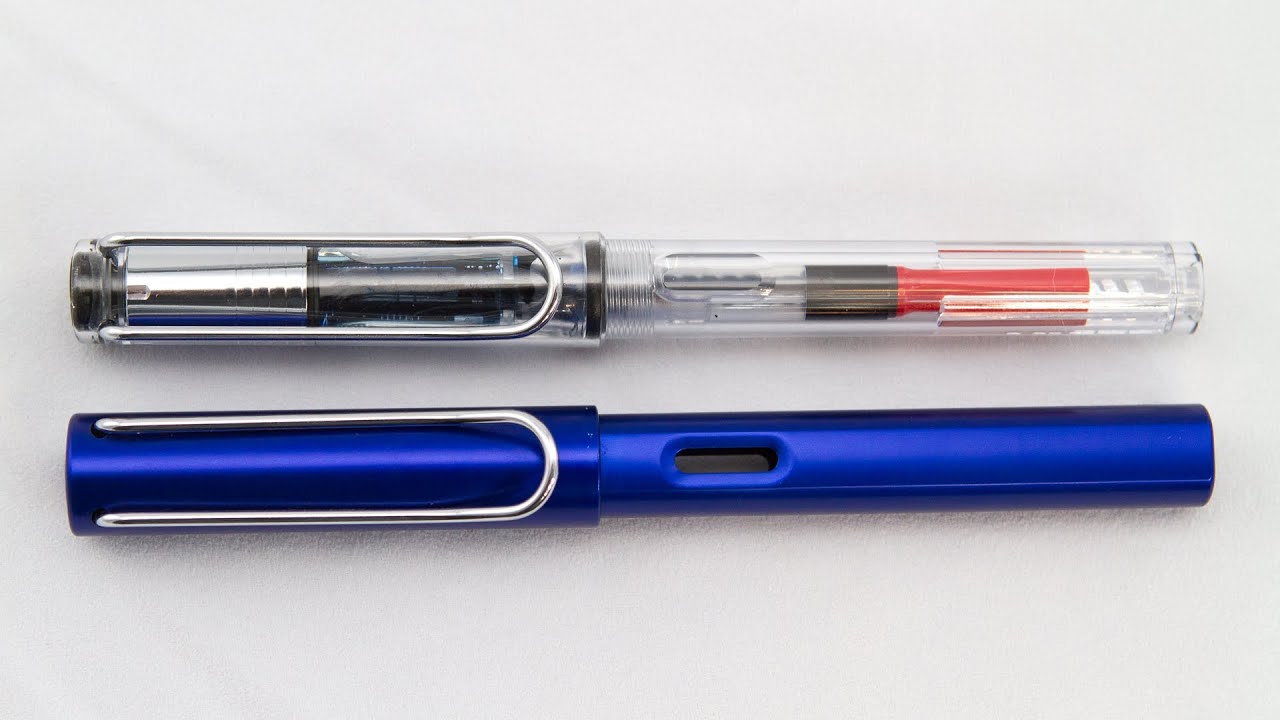 Io ho una Safari normale, nera lucida. Niente da dire, si comporta sempre bene, mi pare abbastanza robusta e affidabile, e cambiare pennino è un attimo. Solo che sulla mia, rimettendo l'alimentatore al suo posto, devo averlo leggermente ruotato, e ora è irrimediabilmente incastrato. Su questa trasparente, viene proprio voglia di caricarci inchiostri particolari come gli shimmer, tanto pulire oenna e converter a fondo è semplice e rapido.