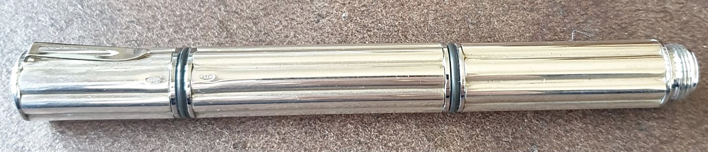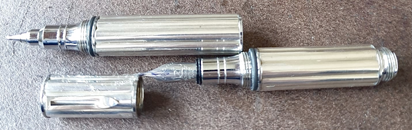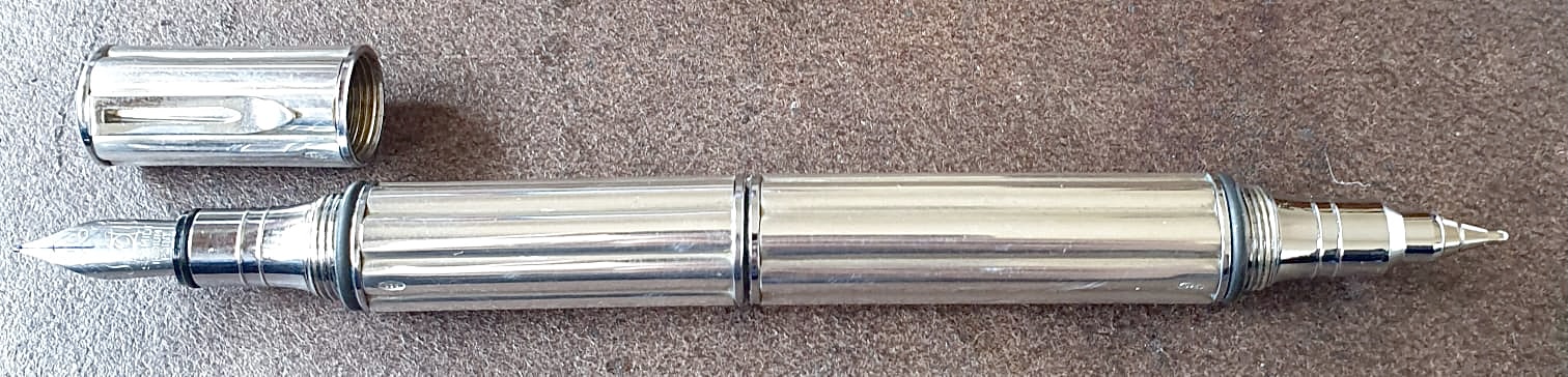 Vi ringrazio tutti e aggiungo questo esempio, “belloccio” ma senza fantasia, anche se pratico, di penna a scrittura doppia. Anonimo, arg. 925. Pennino originale siglato M-Schmidt. Comunque lontana anni luce dalle star degli anni ‘30 condivise i giorni scorsi!