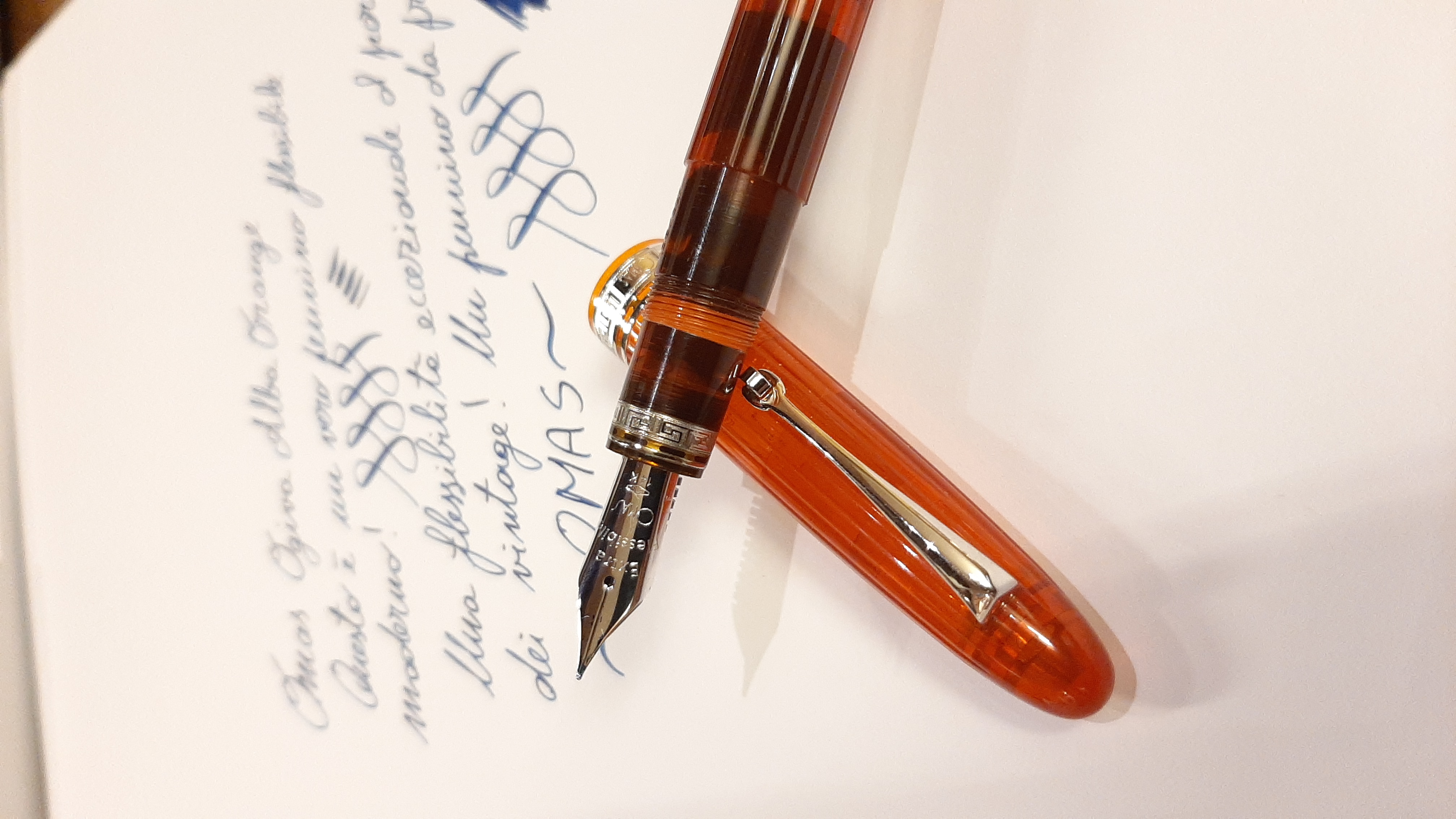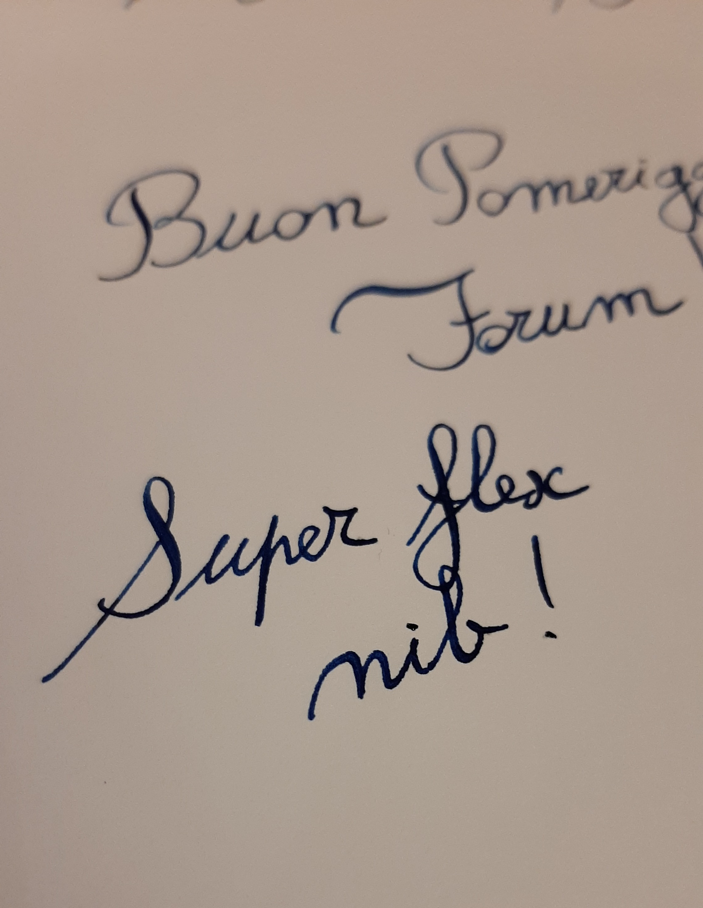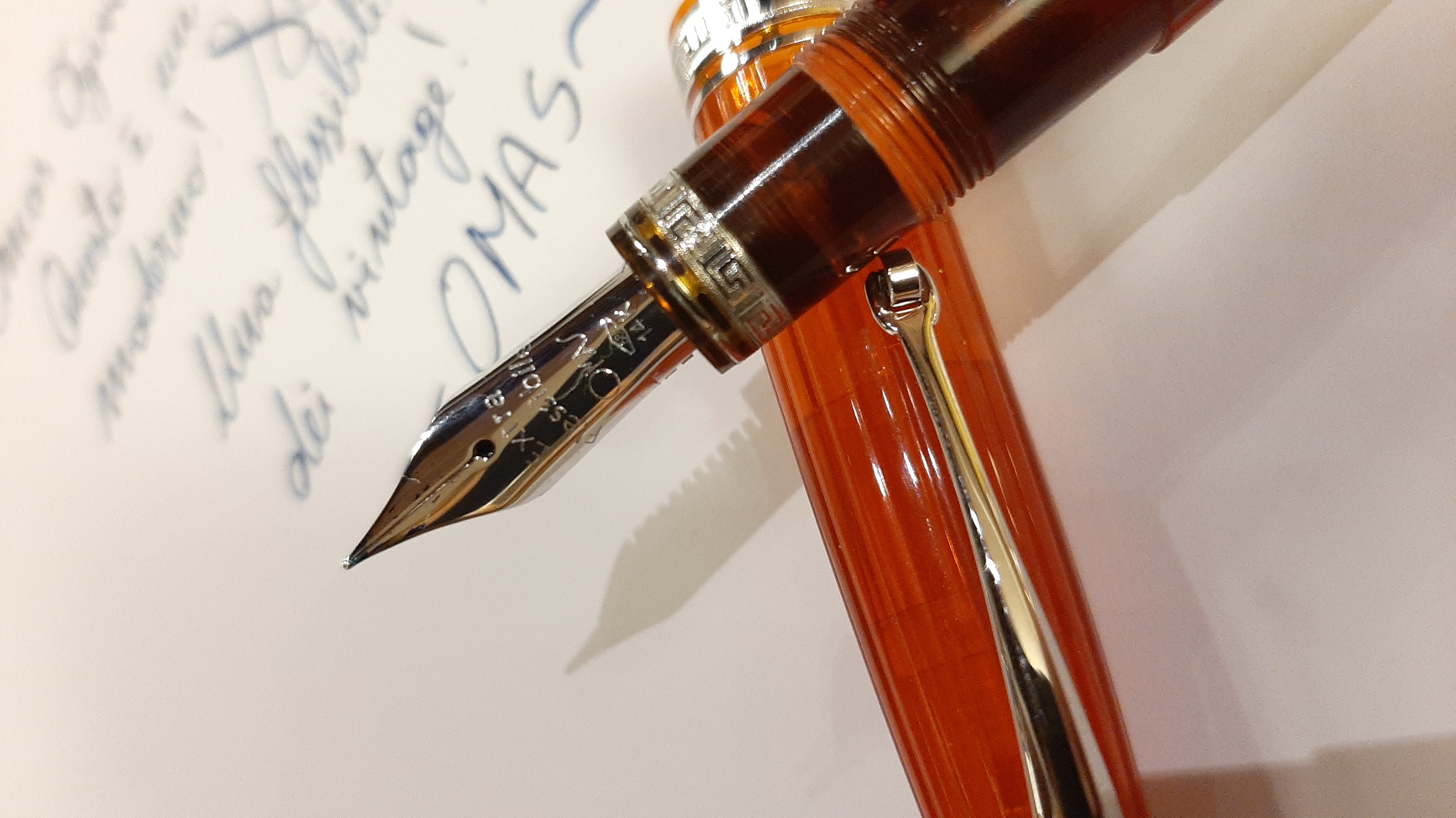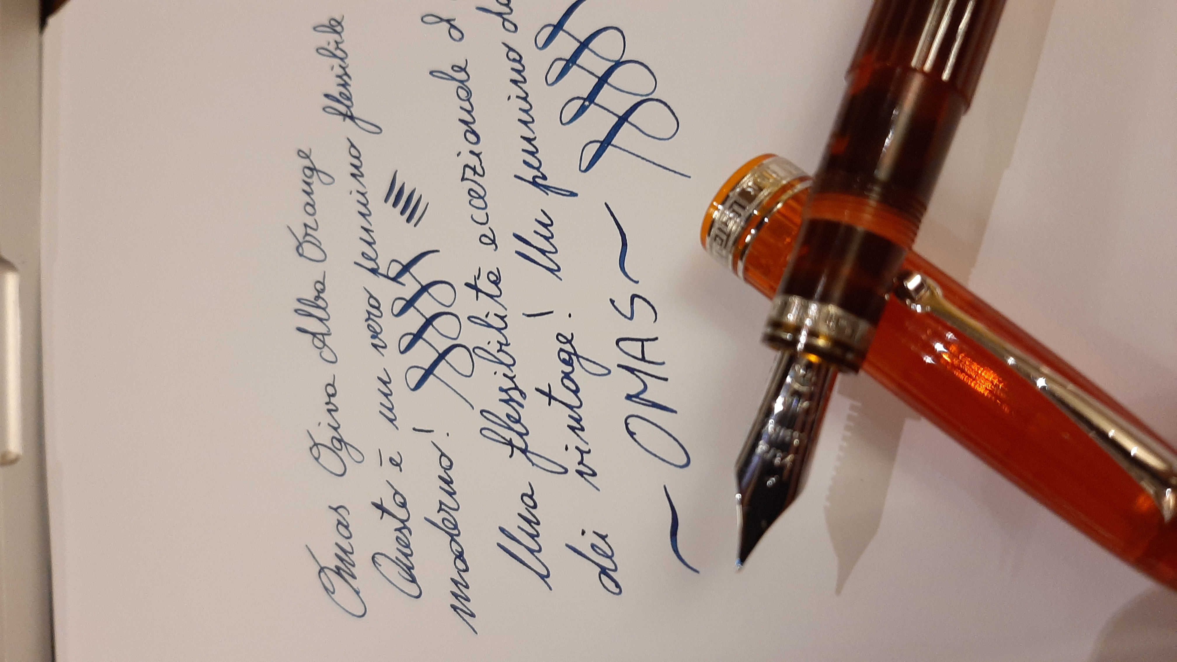 Possiedo da parecchi anni questa Omas moderna e visto che ultimamente si parla molto di pennini flessibili ho voluto rispolverarla per testare questo pennino "extra flessibile". Come ricordavo la flessibilità è veramente eccezionale, l' alimentatore in ebanite eroga sempre la giusta quantità di inchiostro e ci si può permettere di flettere veramente tanto senza alcun problema. Paragonerei questo pennino al pari di un suo coetaneo vintage, cosa mai accaduta prima con altre sedicenti penne moderne con pennino flex. Mi piacerebbe provare la Montblanc calligraphy per capire se il suo tanto decantato pennino supera quello di questa Omas. Un saluto a tutti gli amici del Forum!