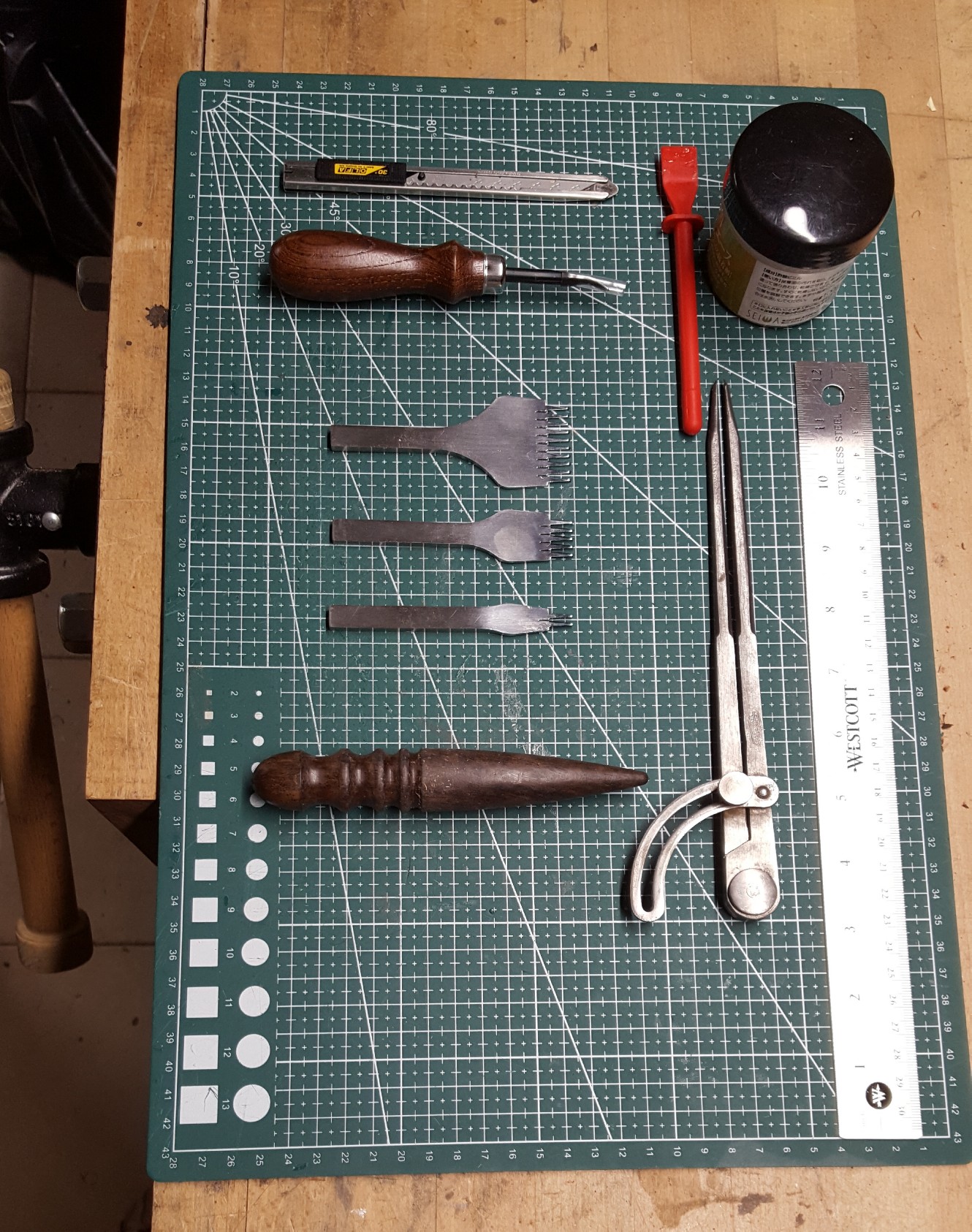 Nella foto c'è anche la colla, non è uno strumento ma assieme alla pelle ed al filo è indispensabile.