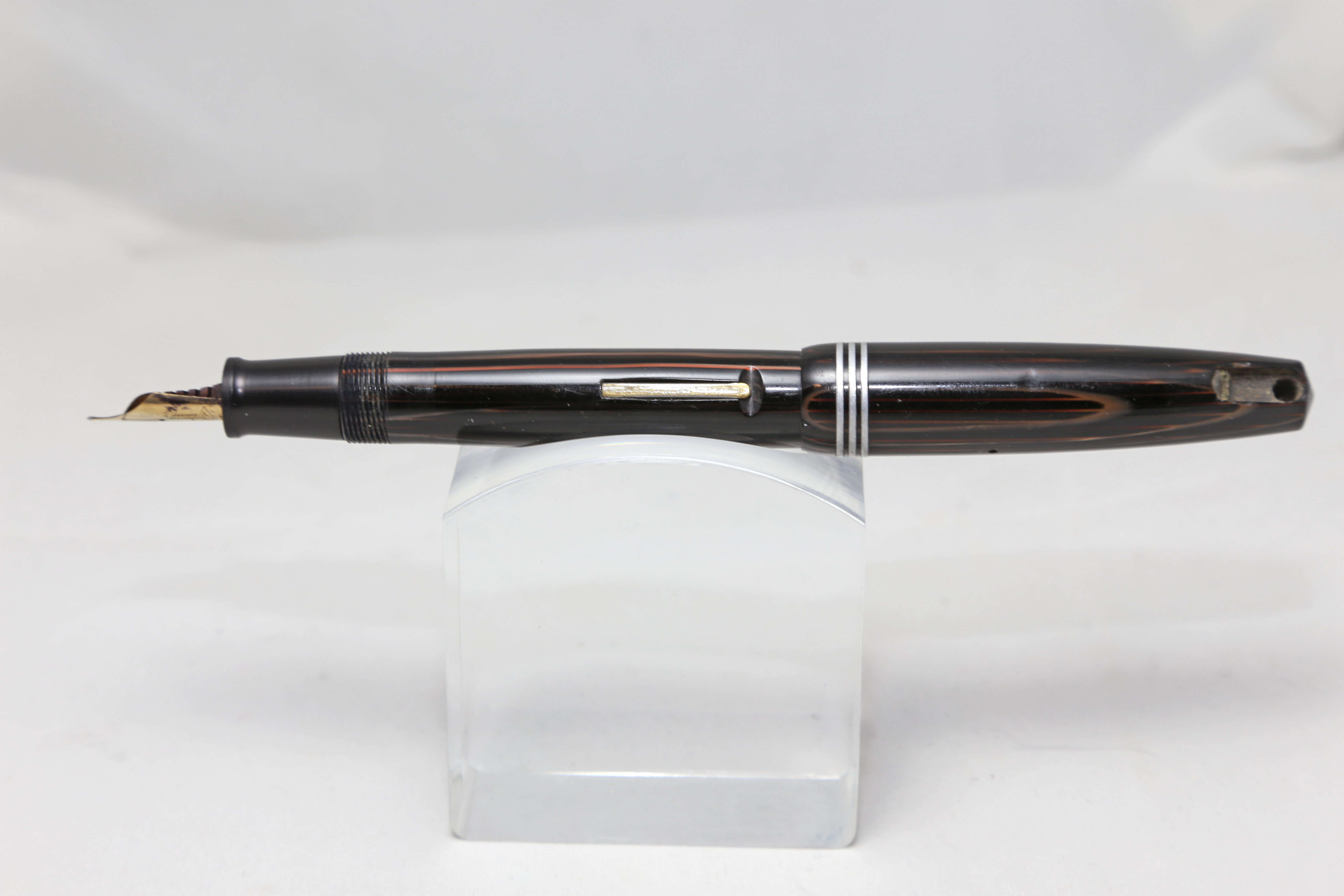 I tre anellini del cappuccio, la clip e la levetta sono cromati, per cui in origine la penna avrebbe dovuto montare un pennino in acciaio "zanio", purtroppo mancante nell'esemplare giunto in mio possesso.